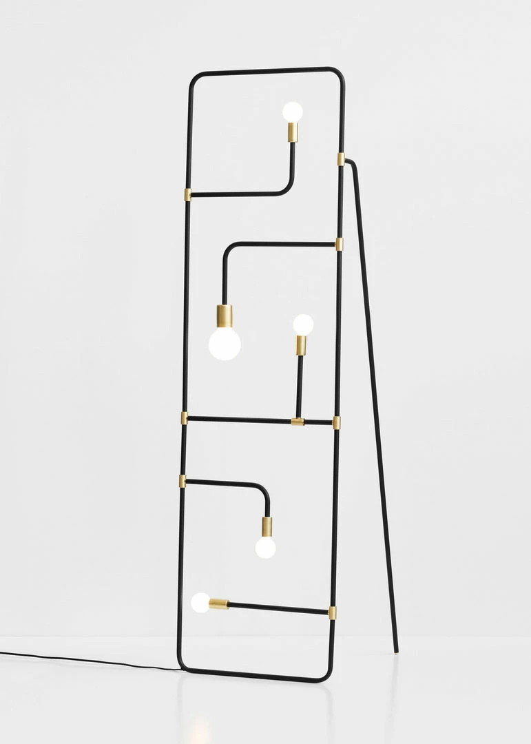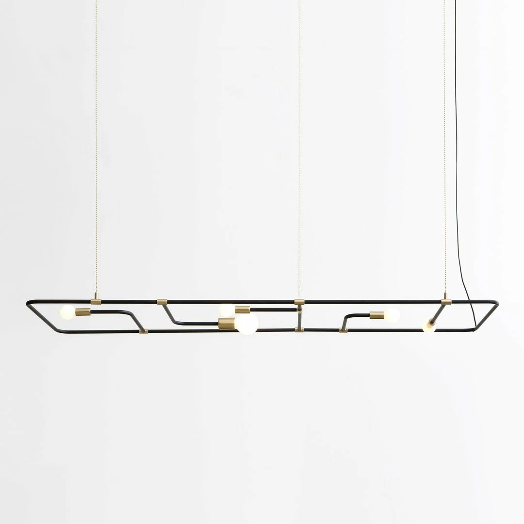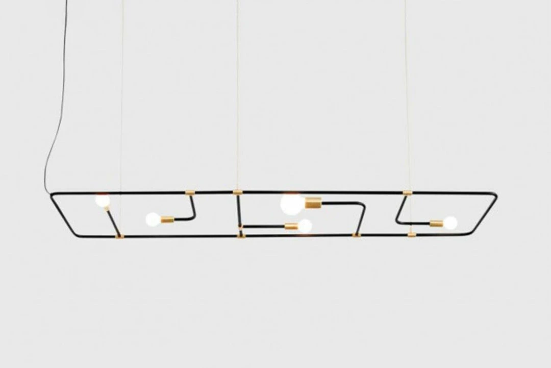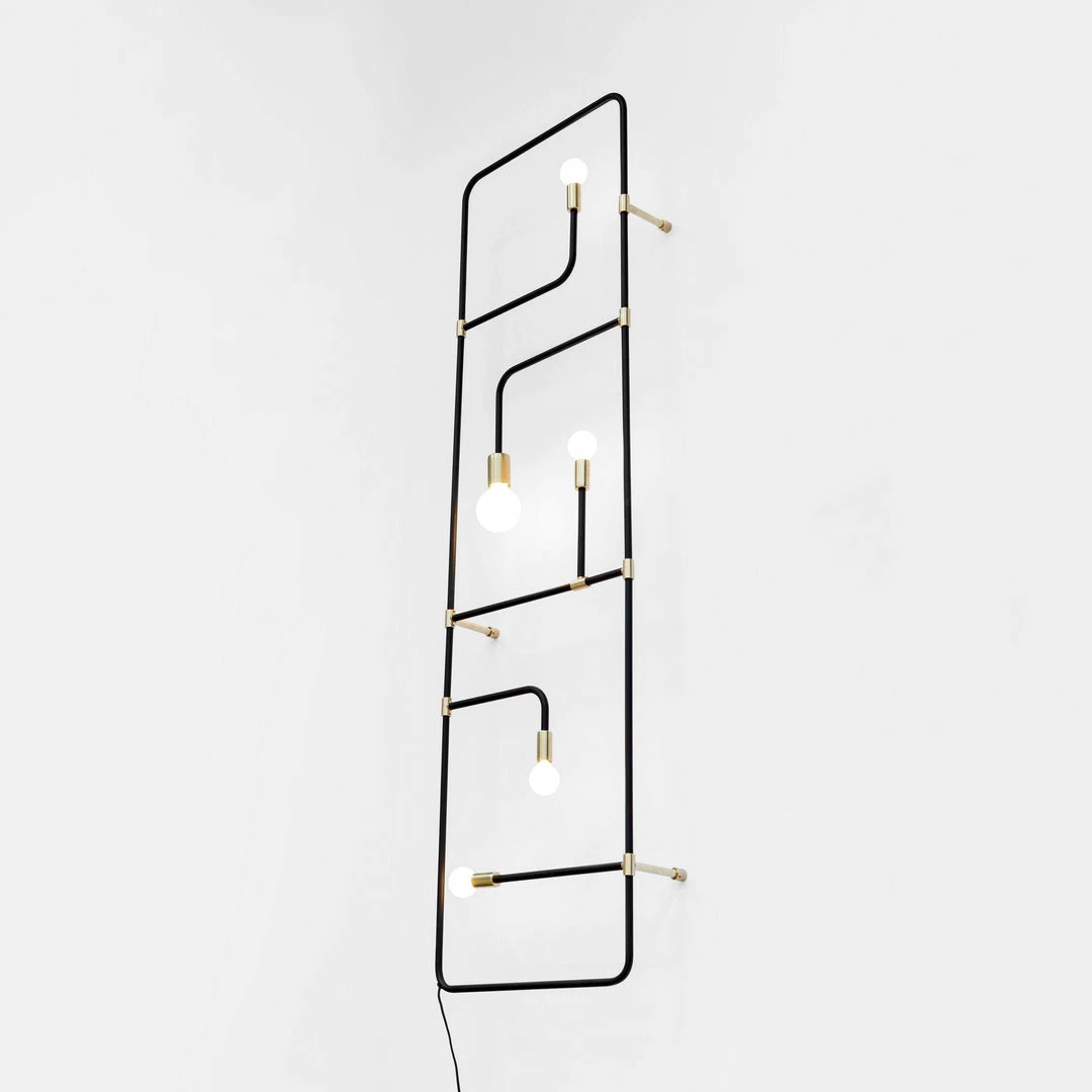 The Beaubien Collection’s strong black lines bend in and out of space, moving effortlessly between simplicity and ornamentation. Round and cubic brass connectors complete the lamps’ structures and add a rich material contrast to the powder-coated rods.