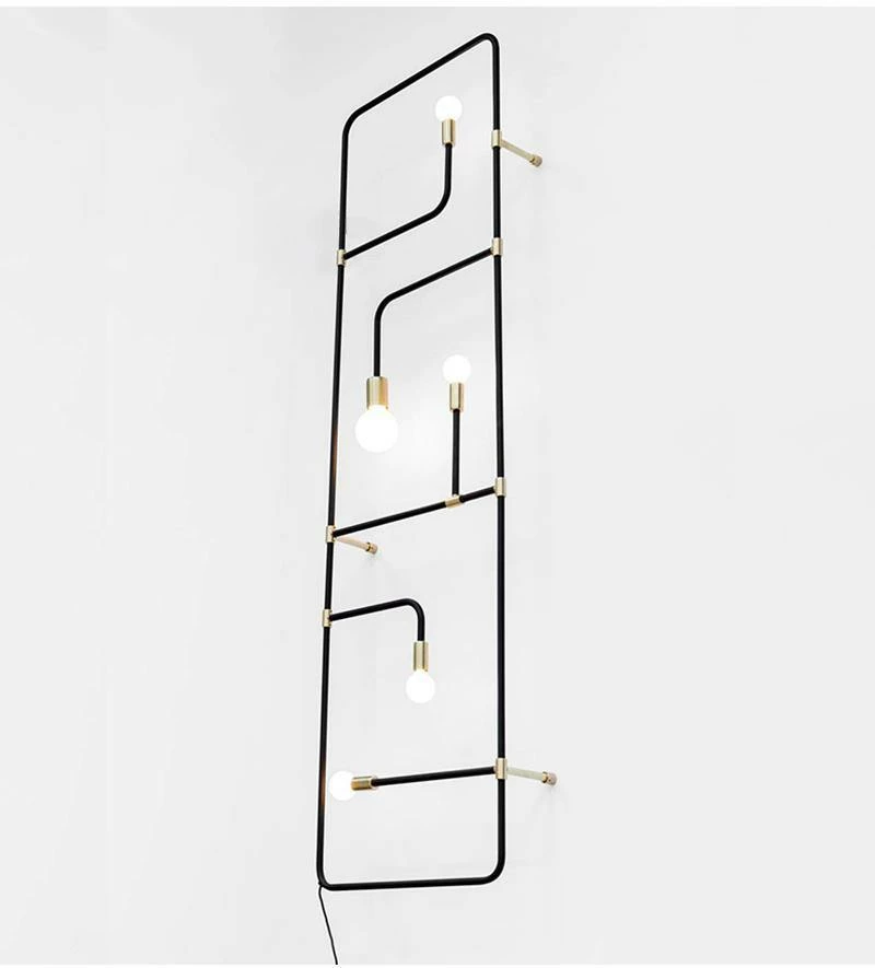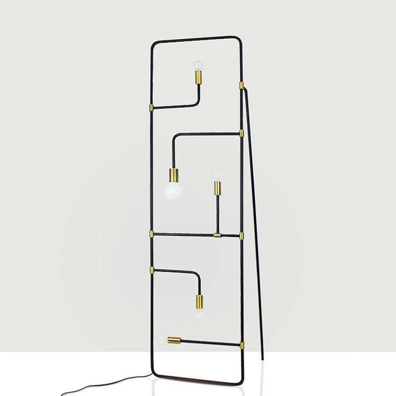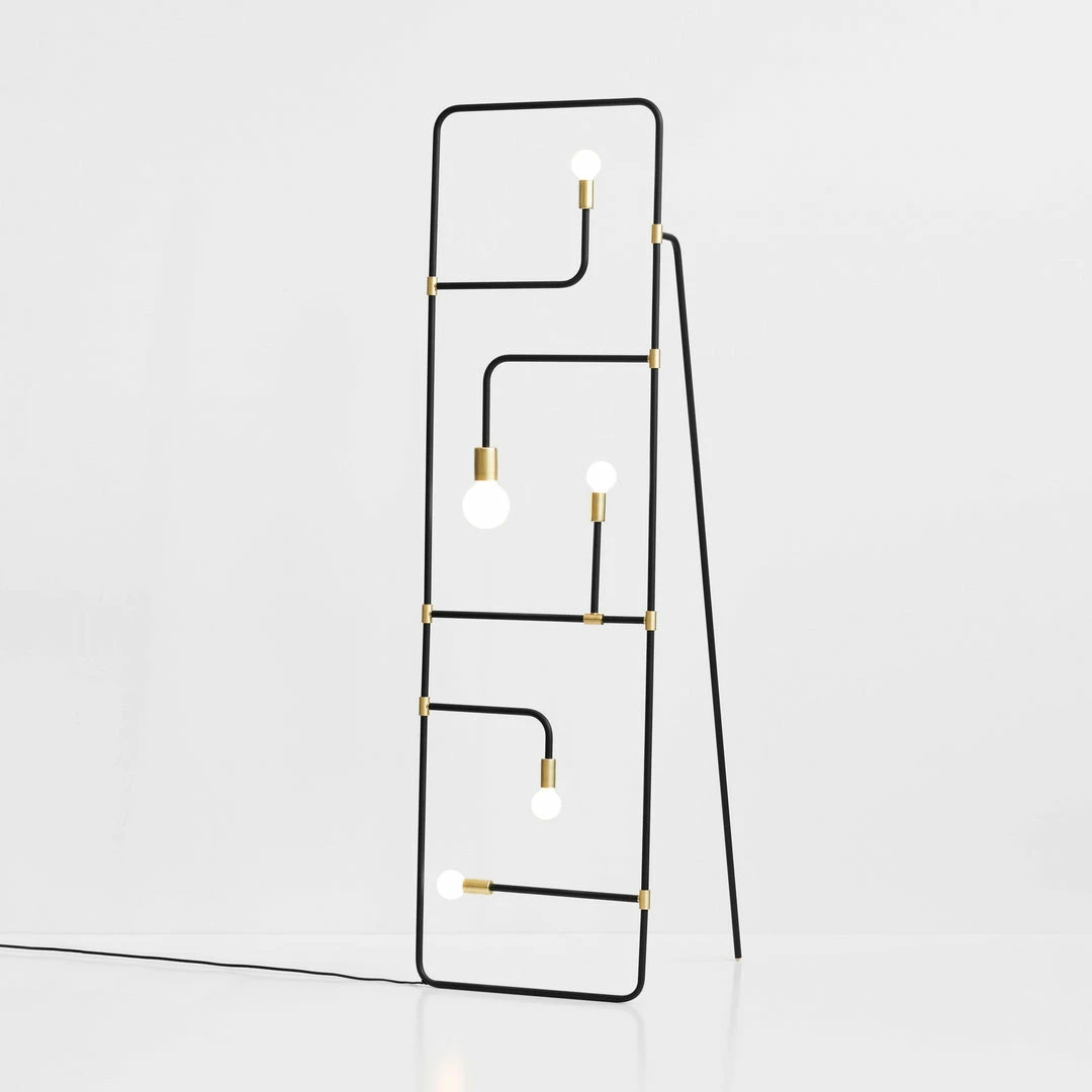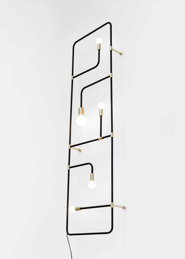 The Beaubien Collection’s strong black lines bend in and out of space, moving effortlessly between simplicity and ornamentation. Round and cubic brass connectors complete the lamps’ structures and add a rich material contrast to the powder-coated rods.