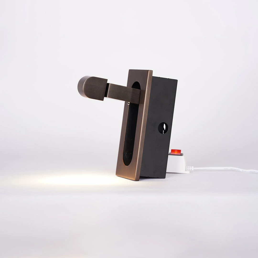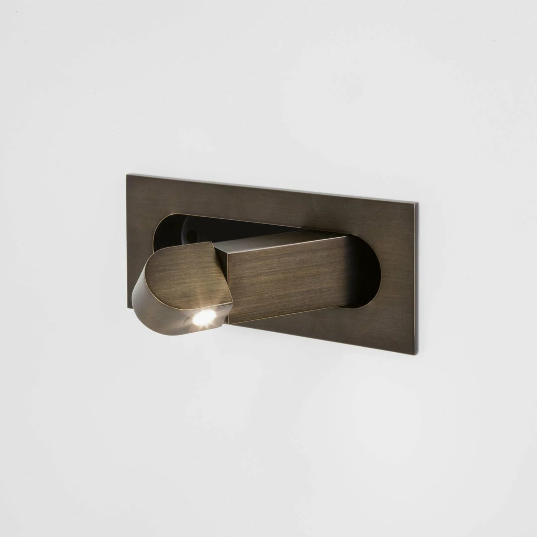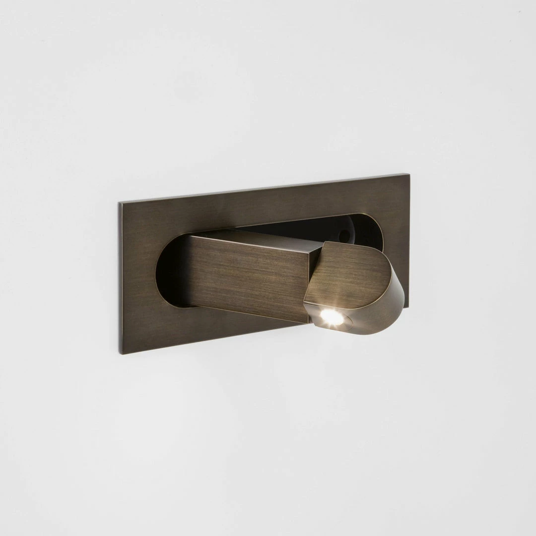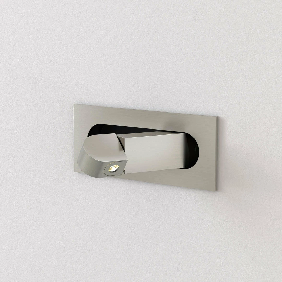 This fitting has the unusual functionality of fitting flush inside its backing plate, and with a push at one end of the fitting, the body comes out and the lamp switches on.