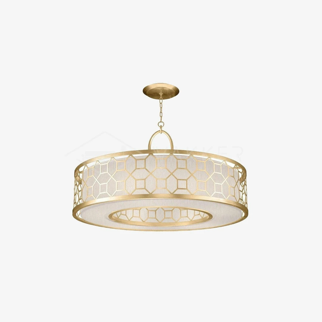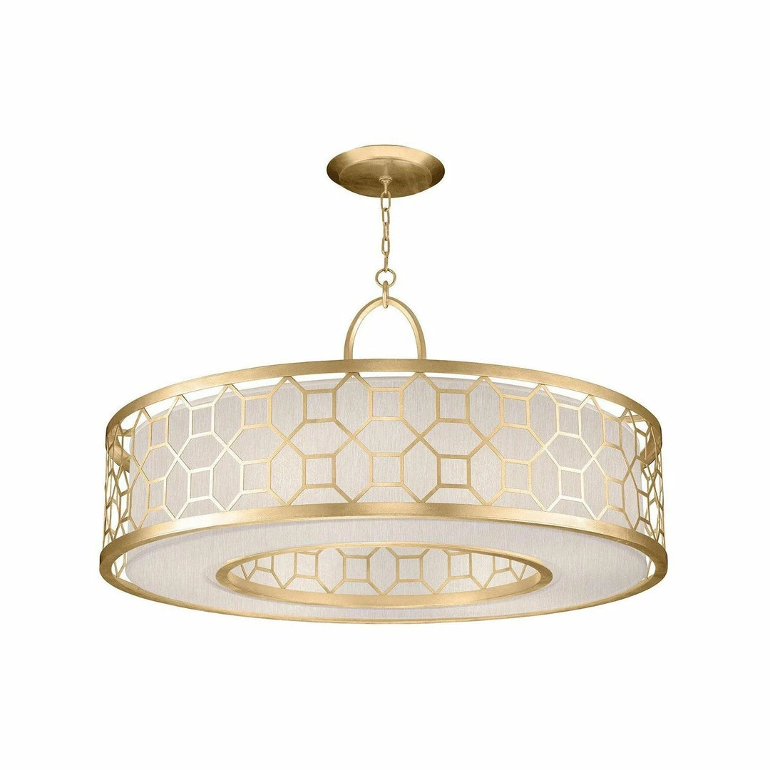 Pendant in a burnished gold leaf finish with subtle brown highlights and white textured linen shade.