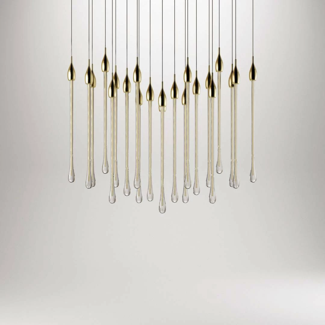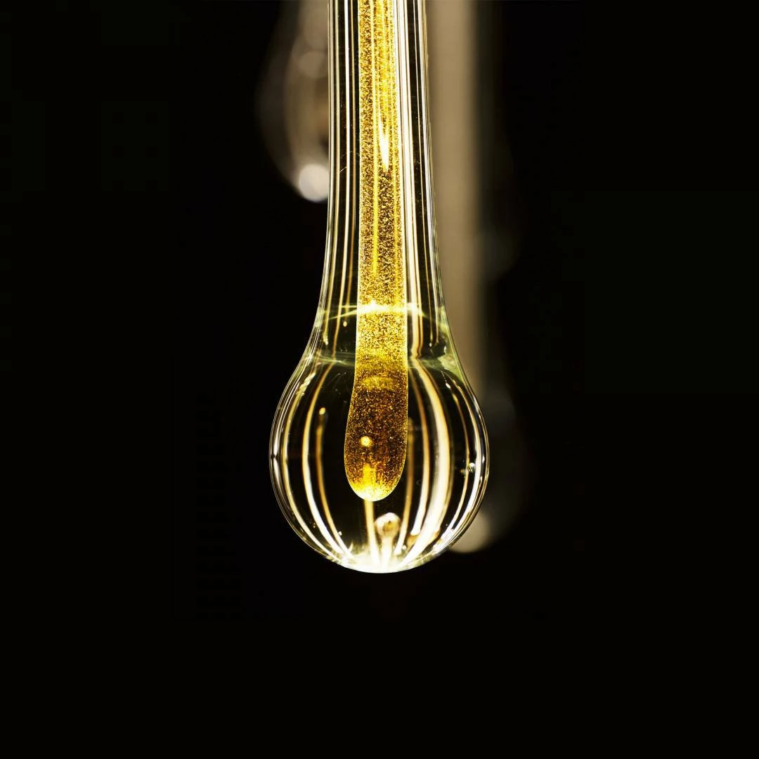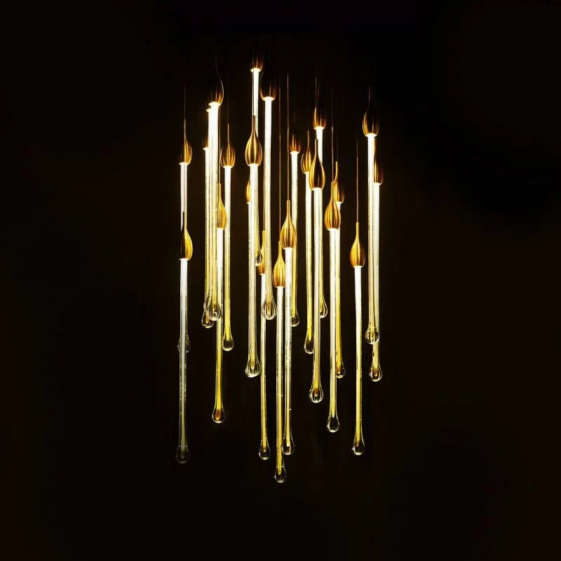 Allure hanging light shown in glass with hanging golden leaf powder. Hanging golden leaf powder reflects off the lighting encased in the crystal components. LED lighting device is included. Suspended cable in transparent Teflon. Available the candle-shaped version –tapered down- and the curved version. Lamps can be combined in multiple configurations in which each element is positioned at different height.
