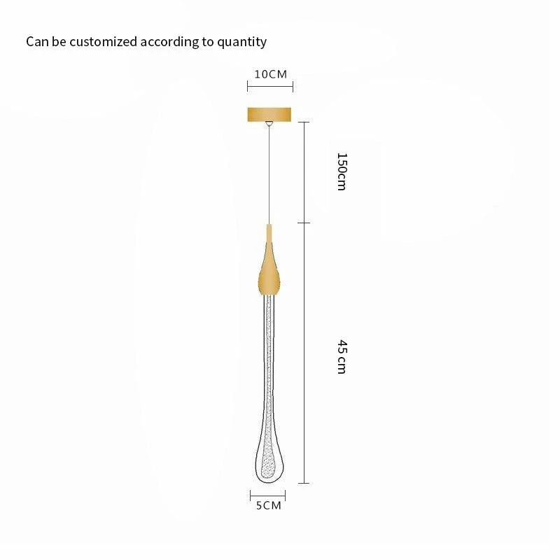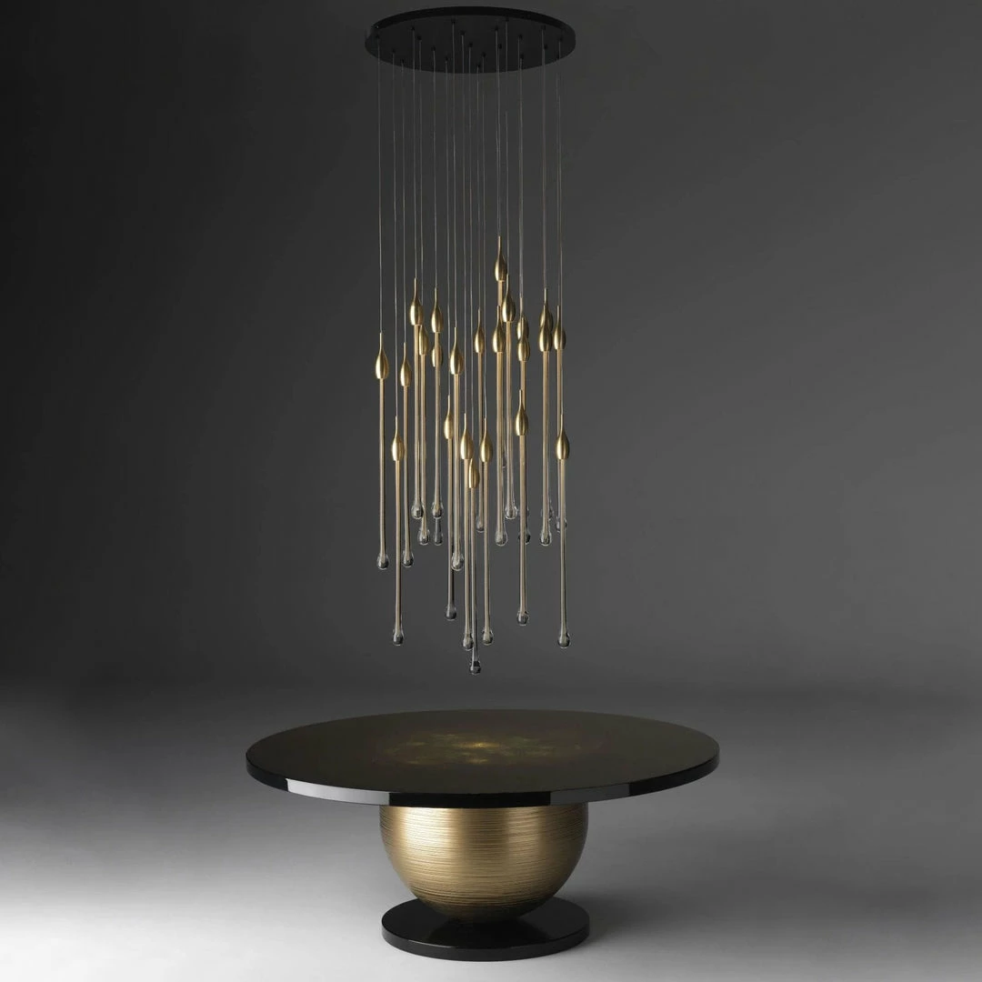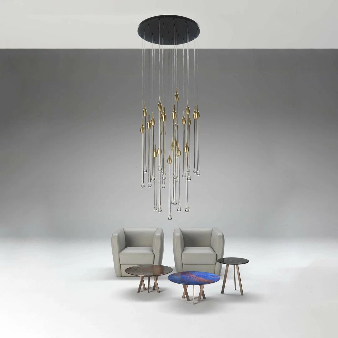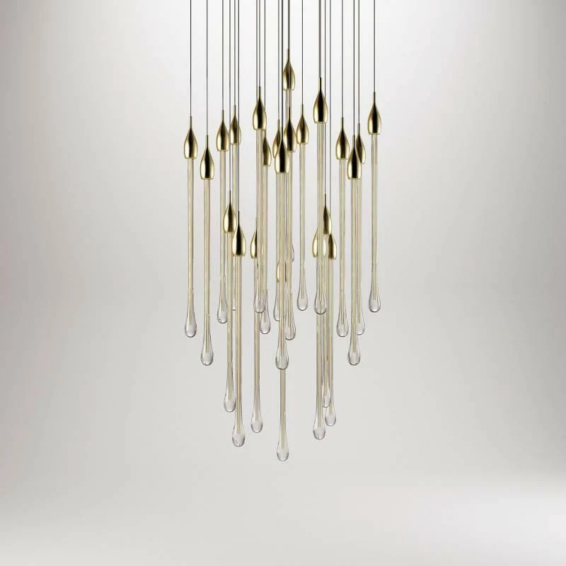 Allure hanging light shown in glass with hanging golden leaf powder. Hanging golden leaf powder reflects off the lighting encased in the crystal components. LED lighting device is included. Suspended cable in transparent Teflon. Available the candle-shaped version –tapered down- and the curved version. Lamps can be combined in multiple configurations in which each element is positioned at different height.