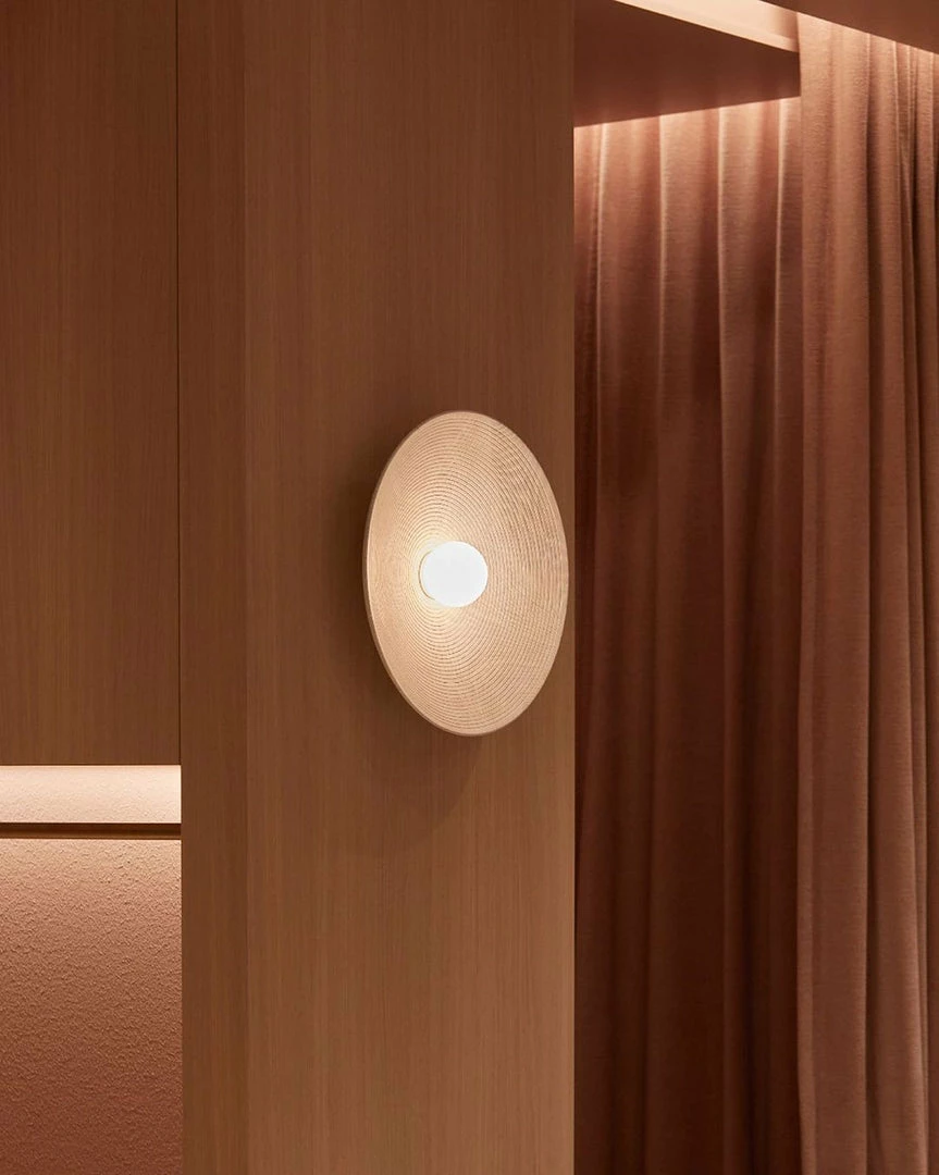 The form of this handcrafted dome is echoed in its grooves. The shade is carefully shaped on the lathe to achieve a pleasing curvature. The geometry of the fixture, particularly the concentric circles, create a topographic texture in the wood that is highlighted when illuminated. Made from Solid wood and Metal, this fixture can mount to the wall or ceiling.