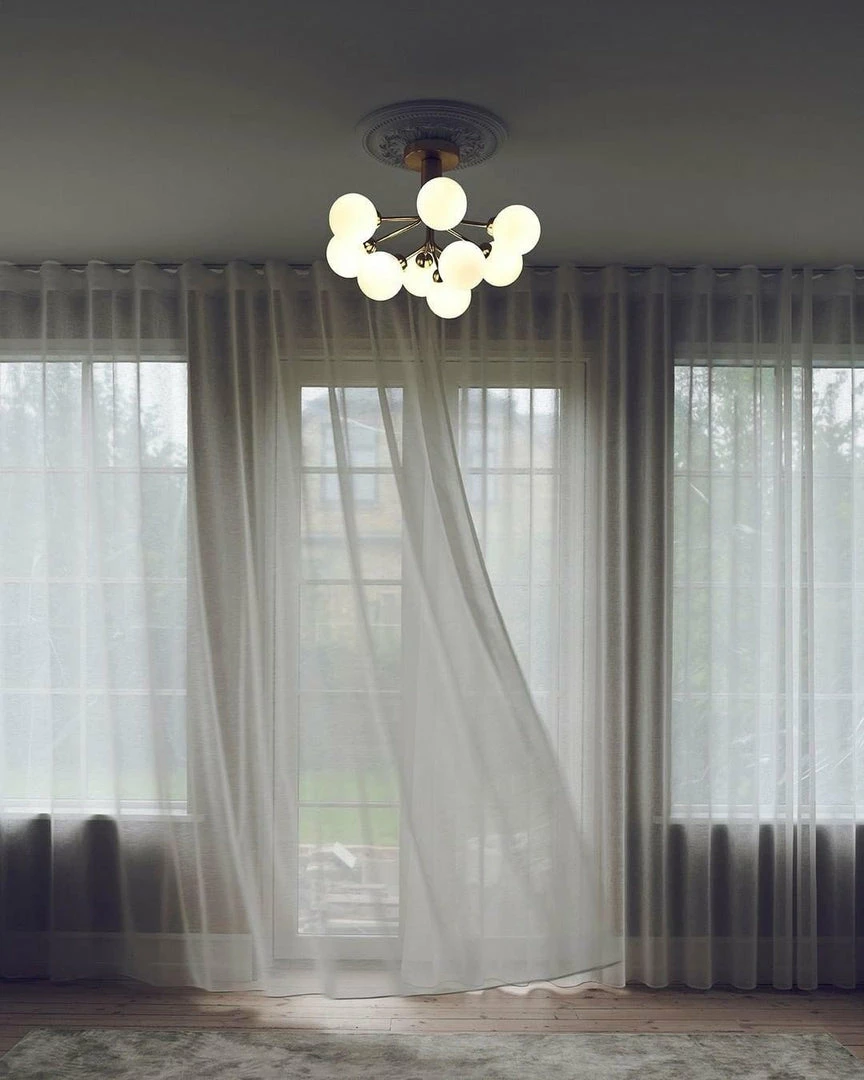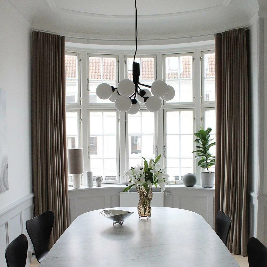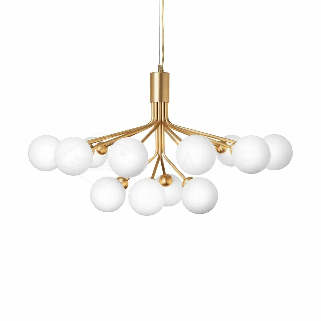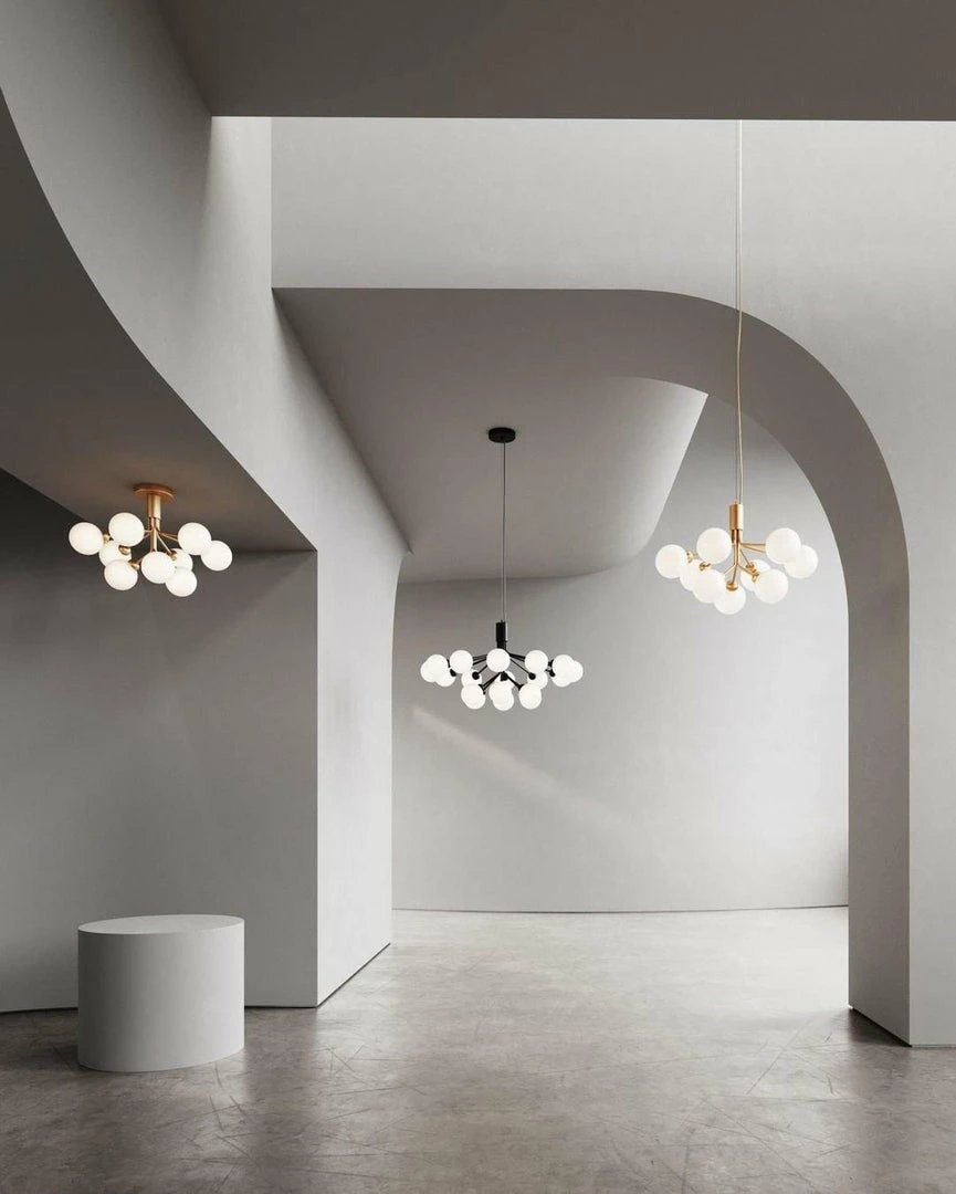 With inspiration from flowers, Sofie Refer has designed the new chandelier collection, Apiales. The collection consists of two chandeliers with 9 or 18 mouth-blown glass globes and are available in golden Brush Brass finish or the smooth Satin Black. From a specially-produced canopy, the arms unfold like flower stalks from which light is spread with grace.
