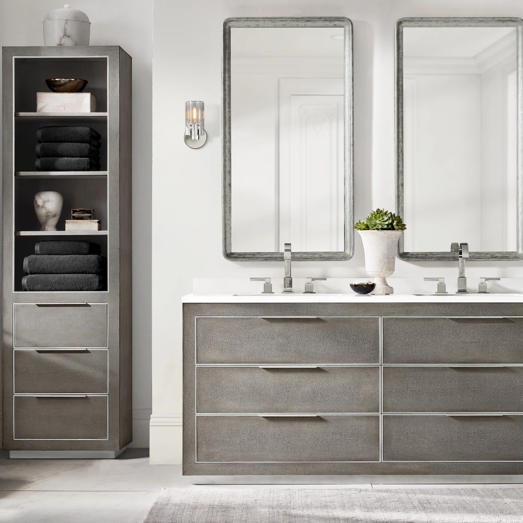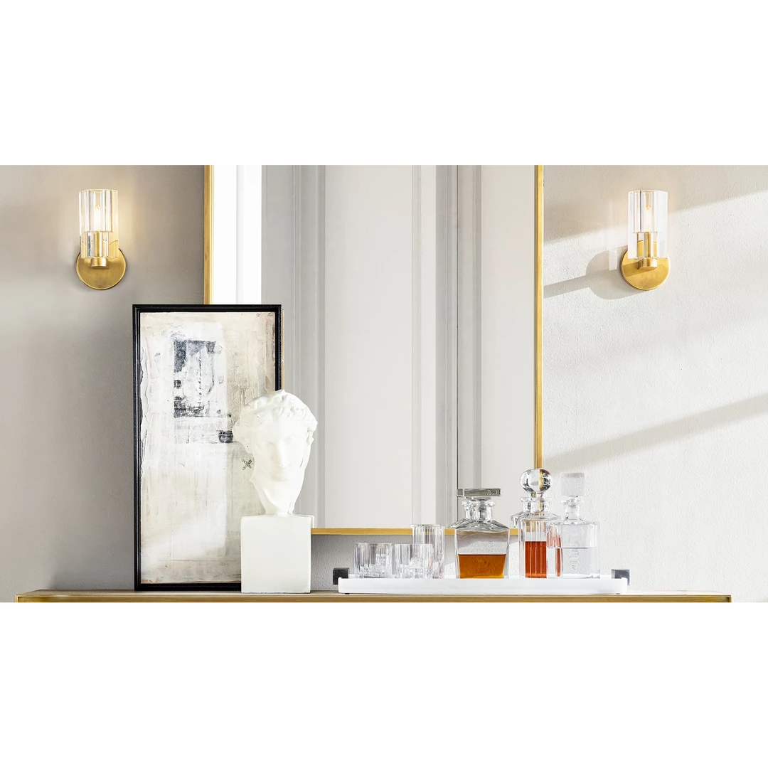 The Arcachon collection is inspired by the shape and scale of industrial gears, where spokes intersperse with negative space in order to interlock with other gears. Here, the spokes are hexagonal forms juxtaposed with rounded interiors, beautifully crafted of crystal glass, running along a simple, solid brass frame.