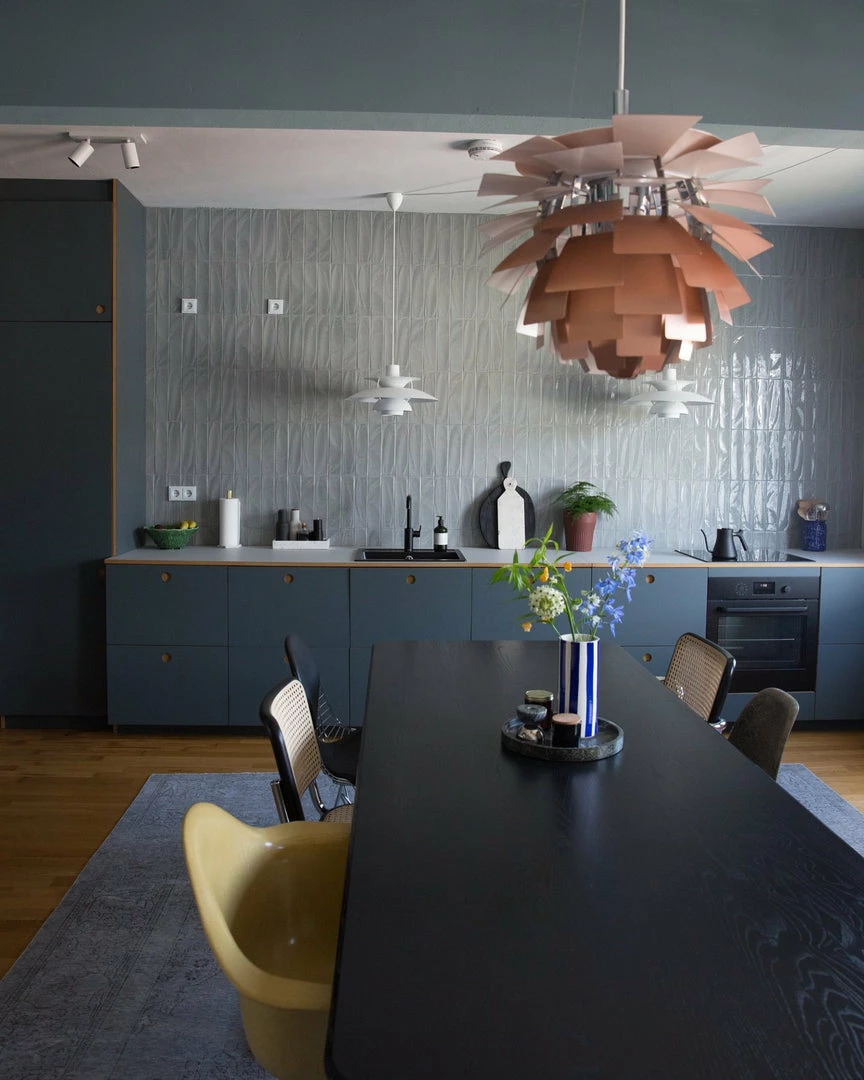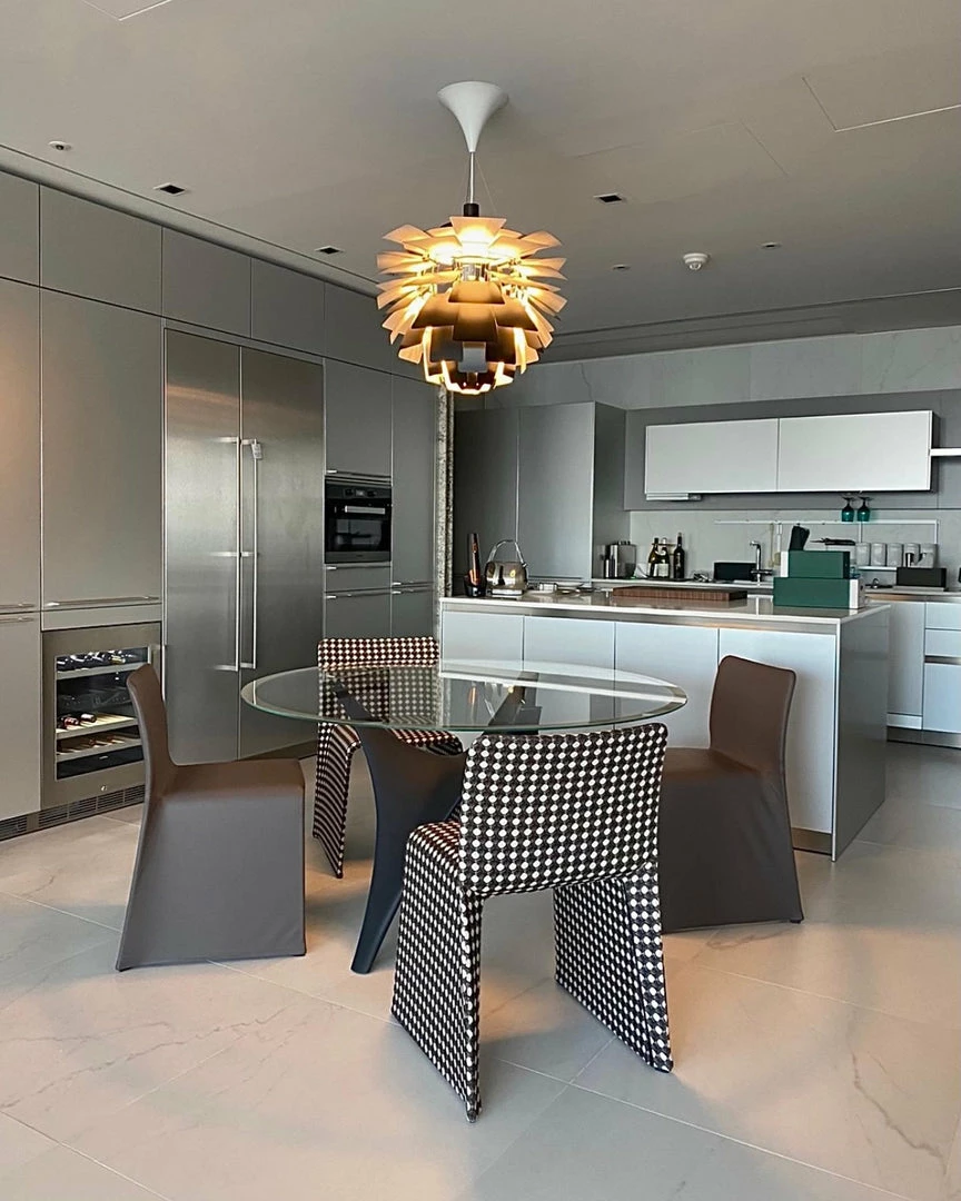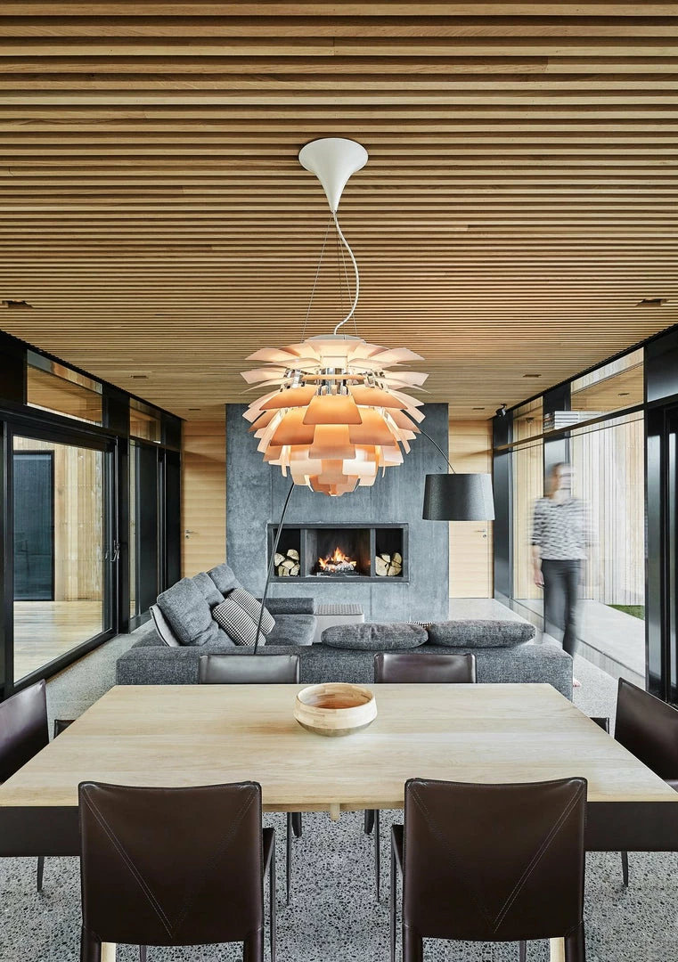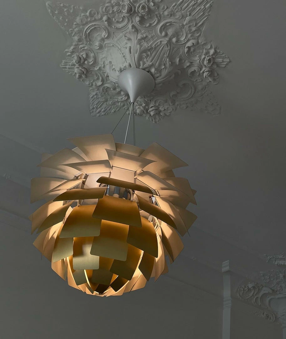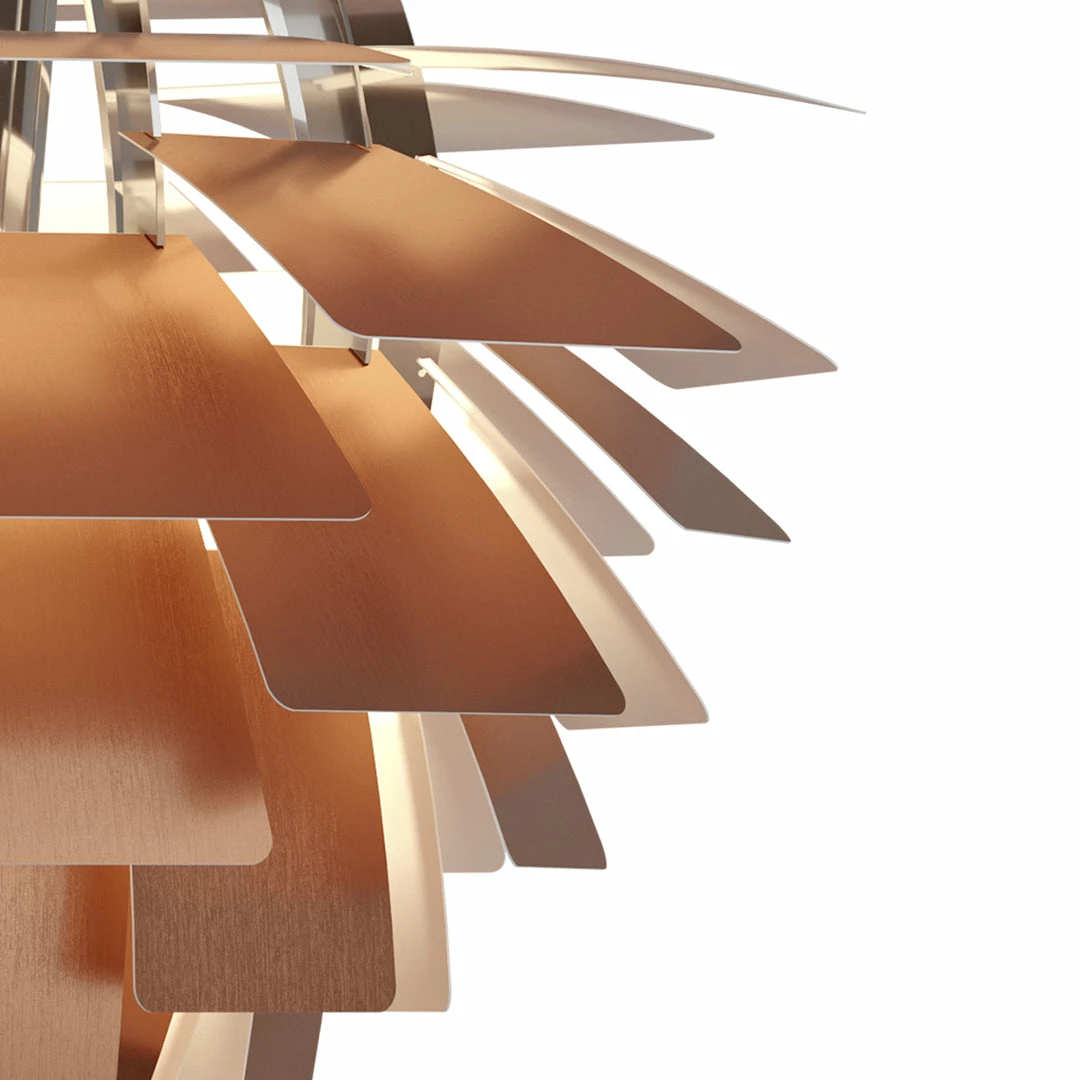 The pendant illuminates any space with a 100% glare-free light due to the 72 leaves, which form 12 precisely positioned rows that hold six leaves each. The fixture ensures the light is distributed inwards as well as outwards, thereby emitting a beautiful and comfortable light. Moreover, the high quality of light is maintained in the energy efficient variant that creates the same renowned atmosphere around the pendant.