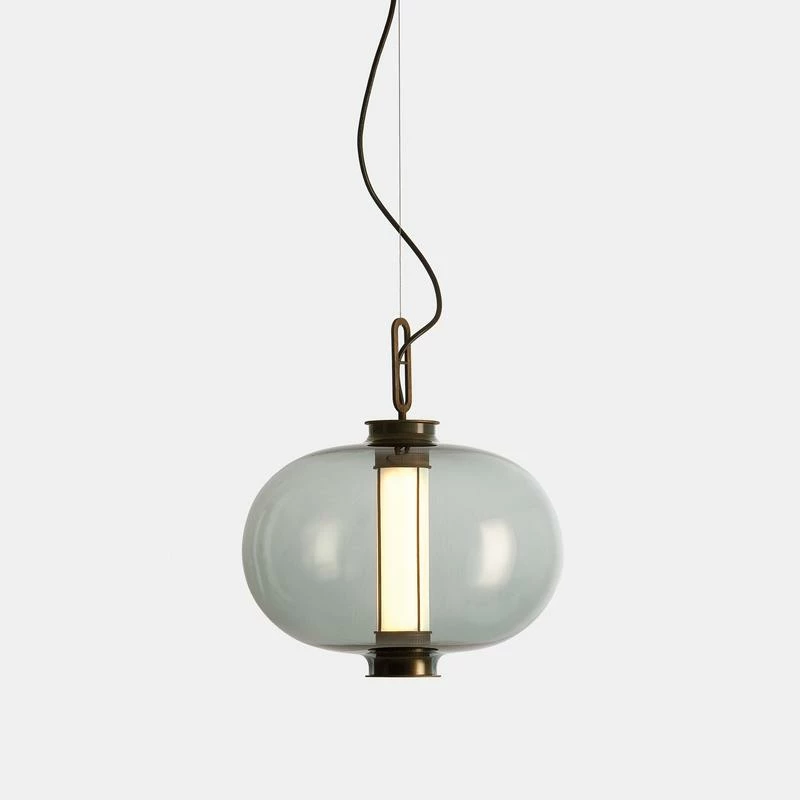 BAI is a family of three hanging lamps of different shapes and sizes. The smallest size can be combined to make various chandelier configurations. In this updated Chinese lantern, paper becomes blown glass, wires become solid metalwork finished in aged bronze, and the candle becomes an LED engine.