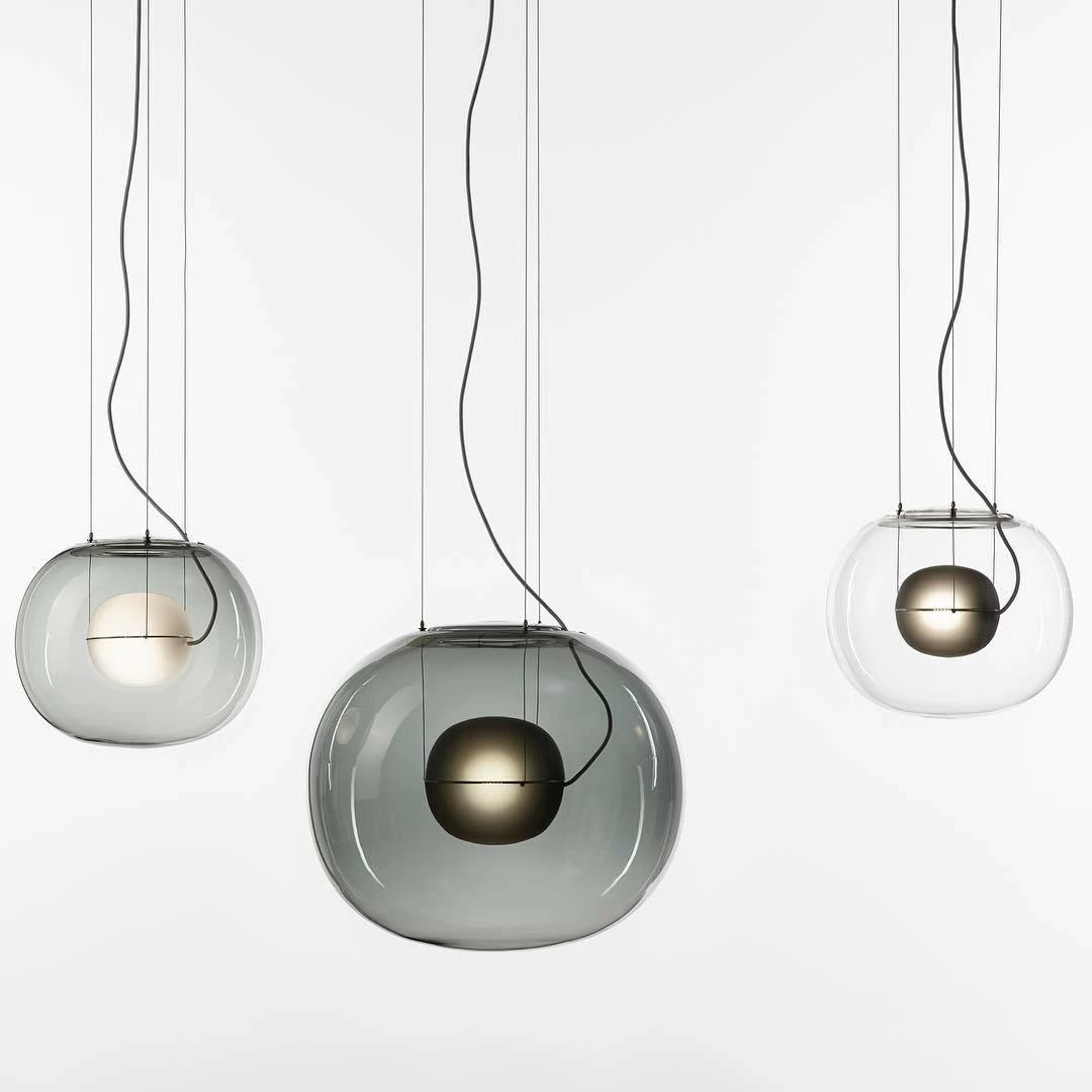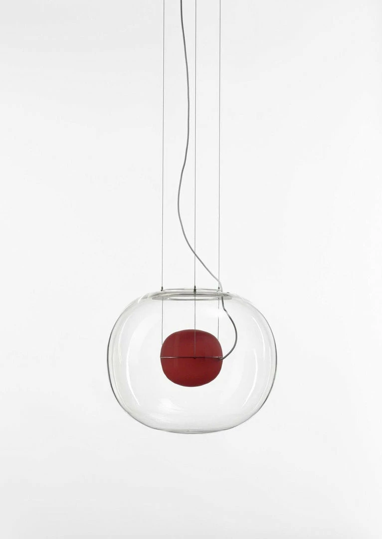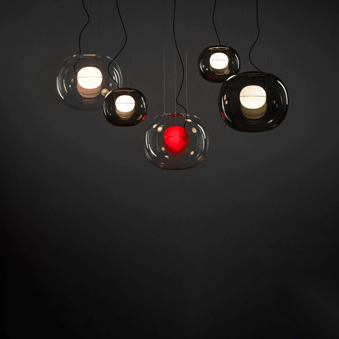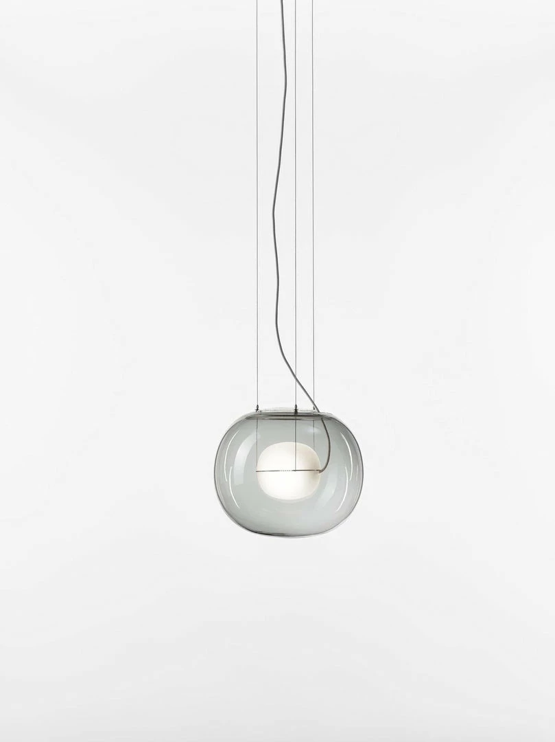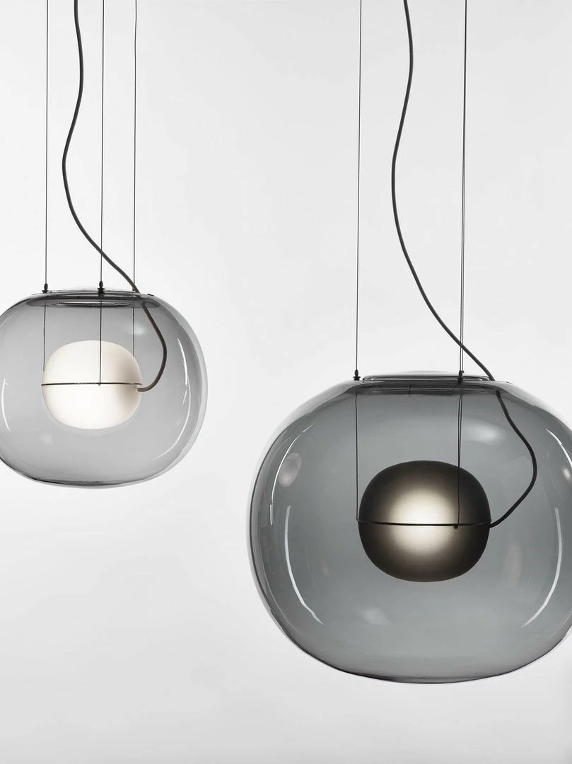 The sophisticated design of a bubble suspended in the center of a large sphere evokes a sense of levitation. Outer glass available with a glossy finish in colors: transparent and smoke grey transparent. The inner glass comes in a matte finish in colors: triplex opal, smoke grey transparent, red transparent and light pink transparent. Big One collection is available in two sizes.