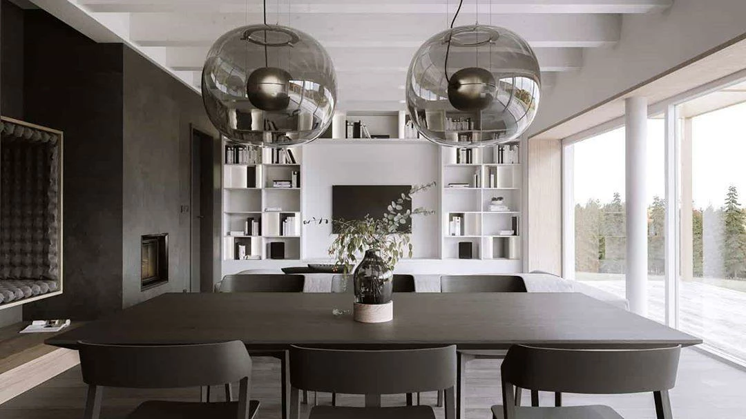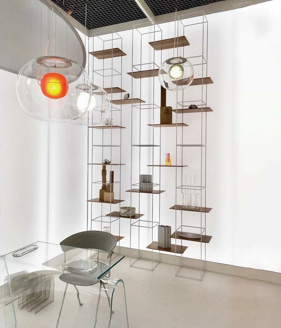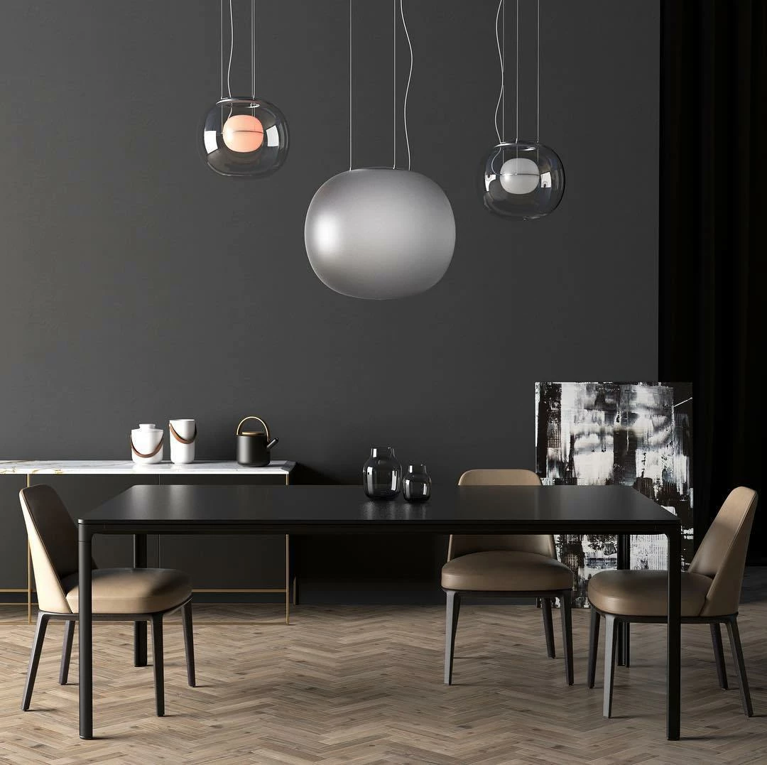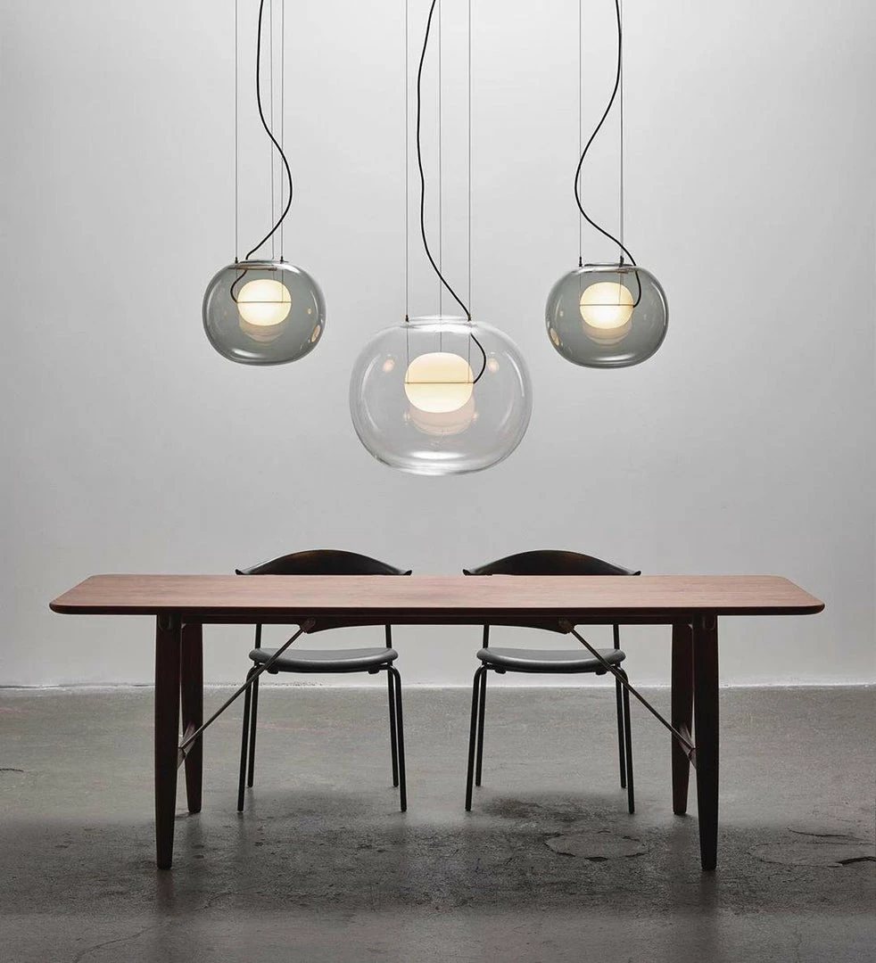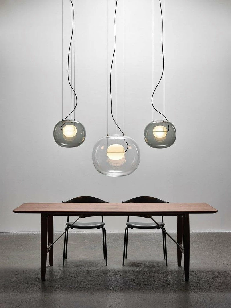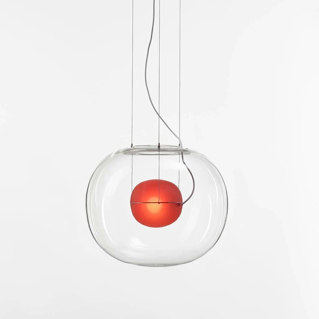 The sophisticated design of a bubble suspended in the center of a large sphere evokes a sense of levitation. Outer glass available with a glossy finish in colors: transparent and smoke grey transparent. The inner glass comes in a matte finish in colors: triplex opal, smoke grey transparent, red transparent and light pink transparent. Big One collection is available in two sizes.