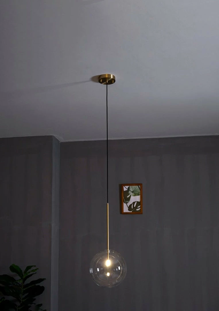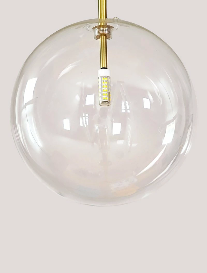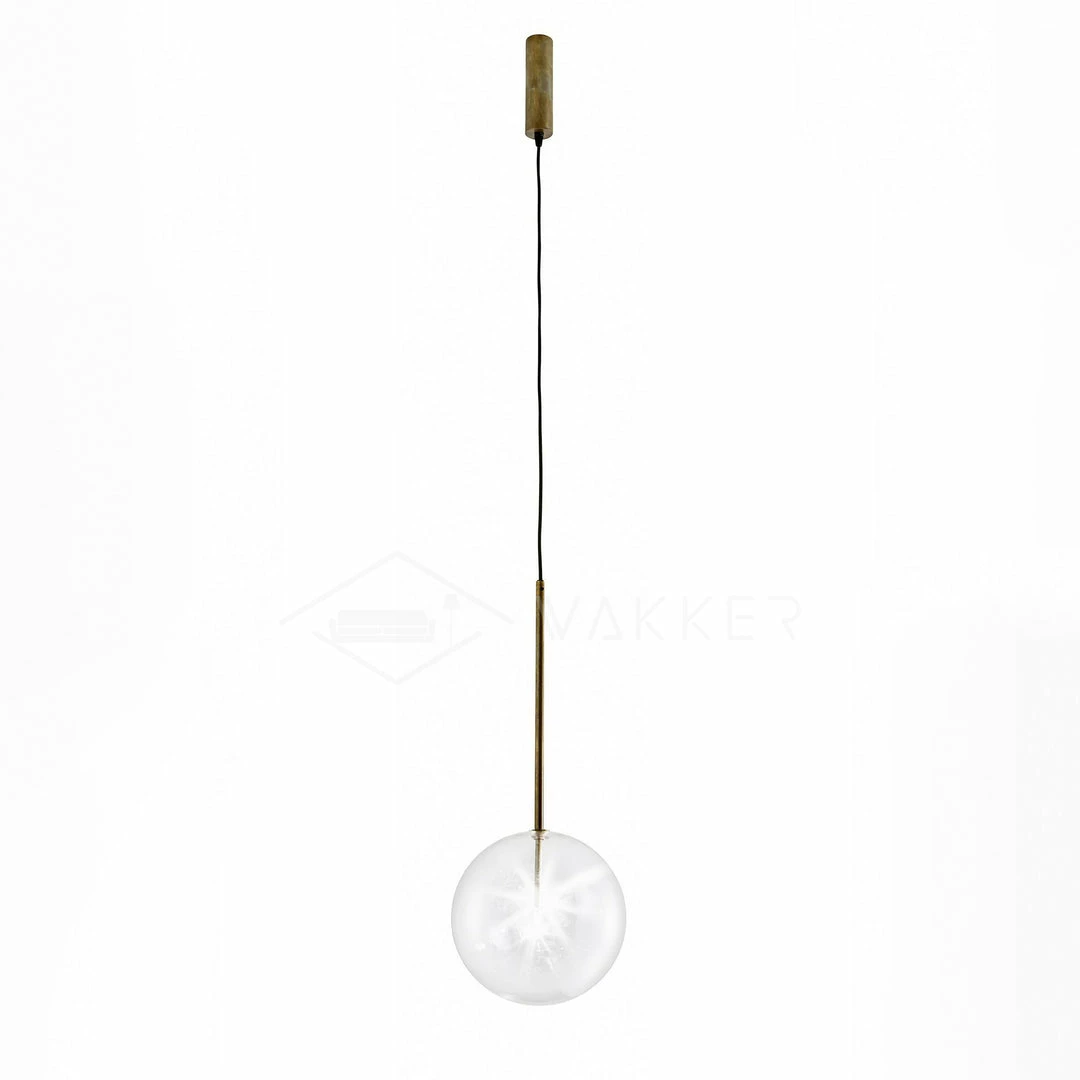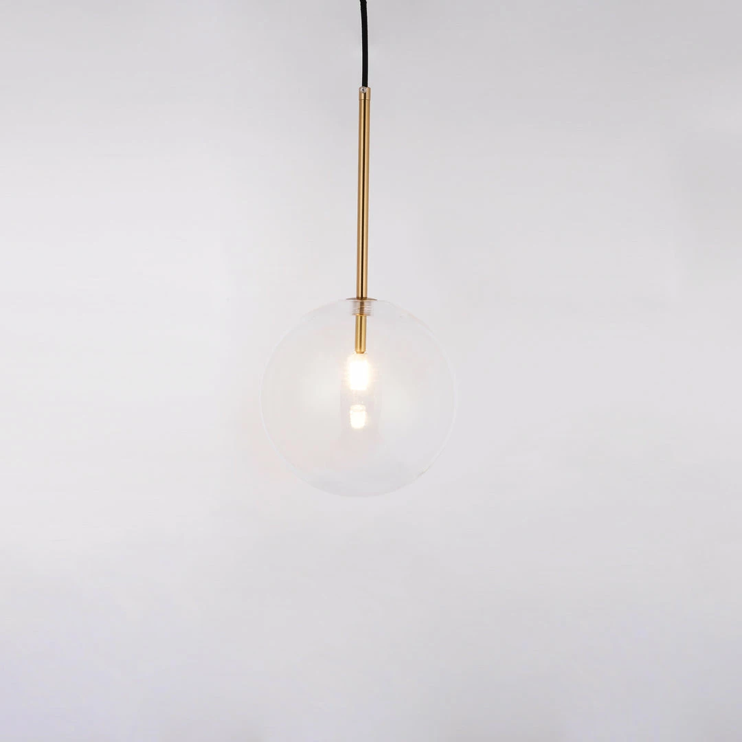 Hanging lamp with LED point light (G4 ). Transparent blown glass sphere. Metal parts in hand burnished brass. The hand-burnished brass finish looks naturally spotted and irregular. Due to this craft made processing, each product is unique and exclusive.