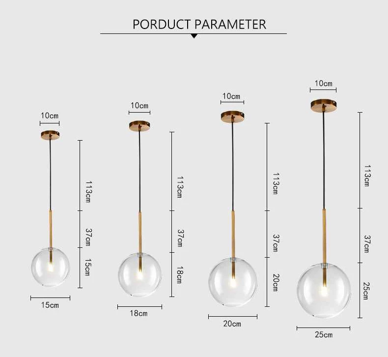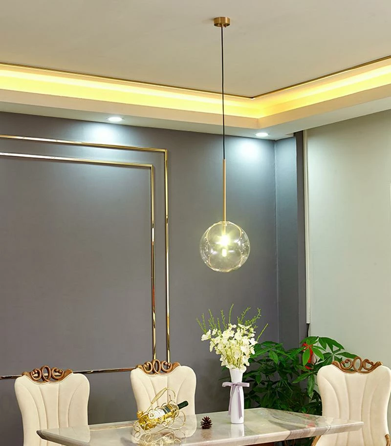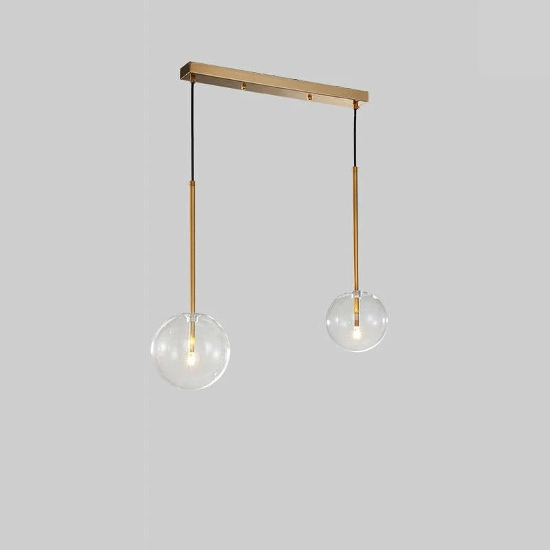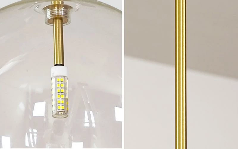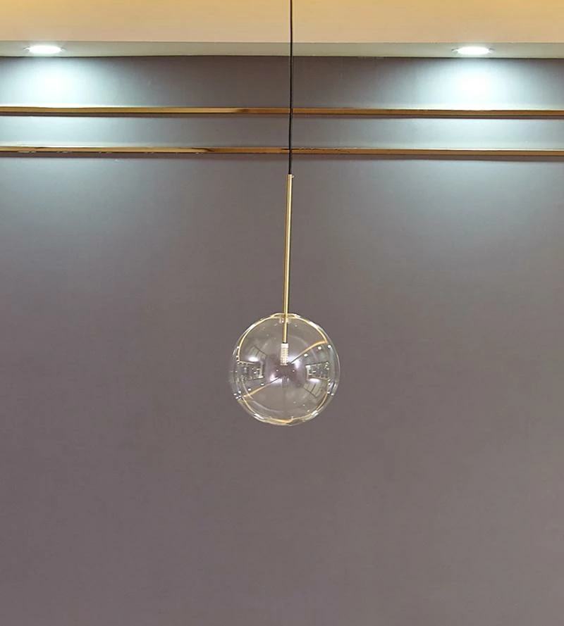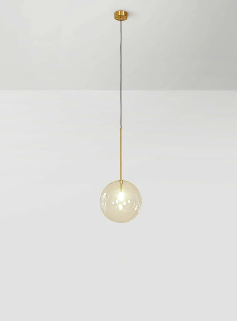 Hanging lamp with LED point light (G4 ). Transparent blown glass sphere. Metal parts in hand burnished brass. The hand-burnished brass finish looks naturally spotted and irregular. Due to this craft made processing, each product is unique and exclusive.