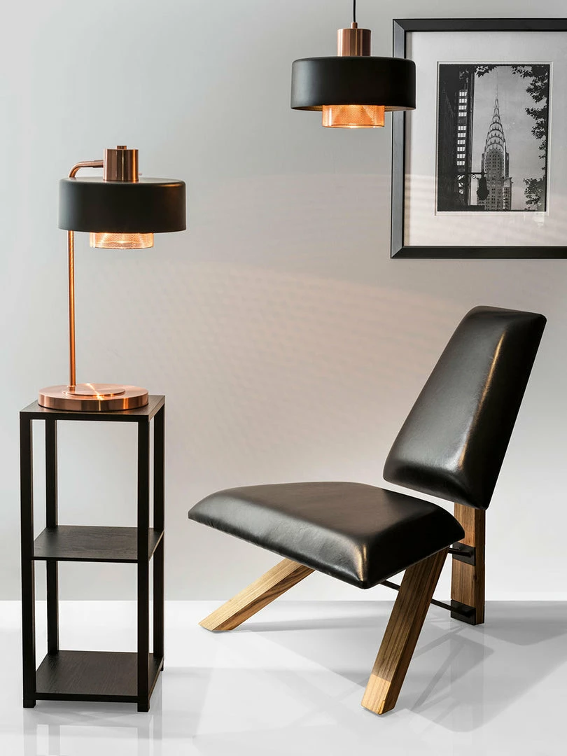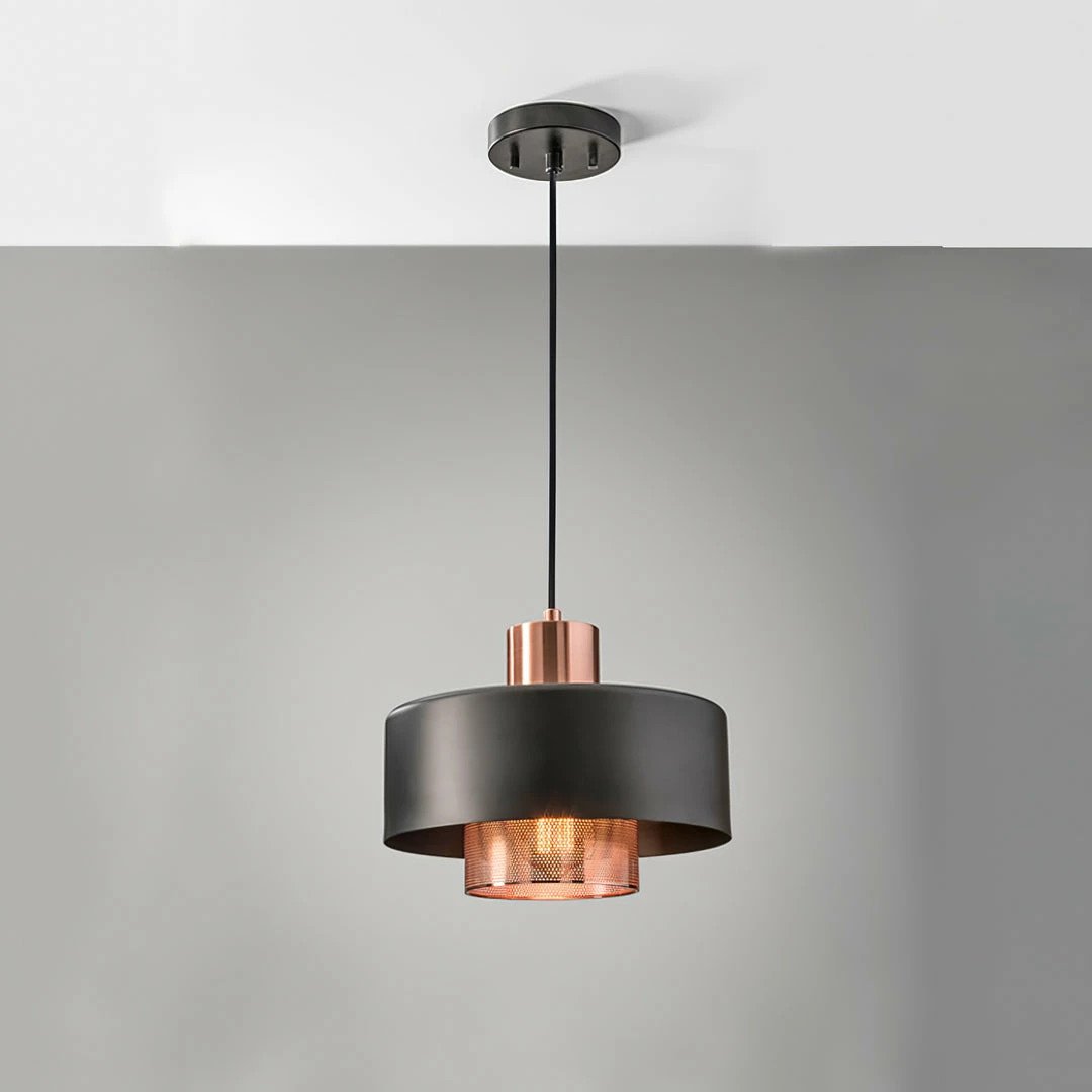 The Bradbury Pendant Lamp is a striking design that uses contrasting finishes and metals to create an elevated, eye catching look. A 60 watt bulb shines beautifully through a perforated copper inner shade creating a warm glow around the room. An adjustable shade allows for directive light where it is needed.