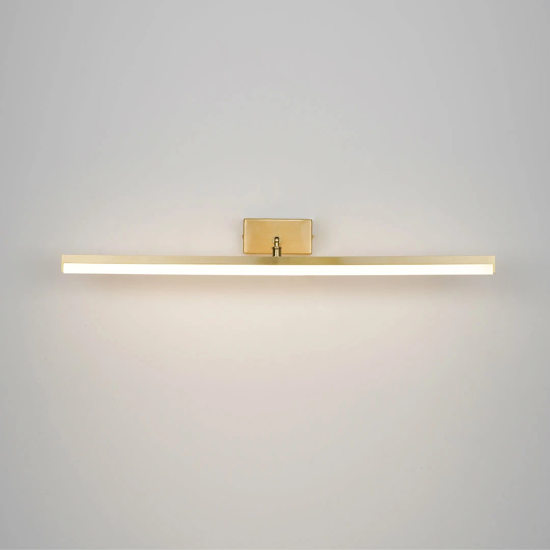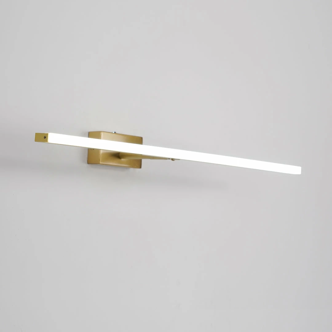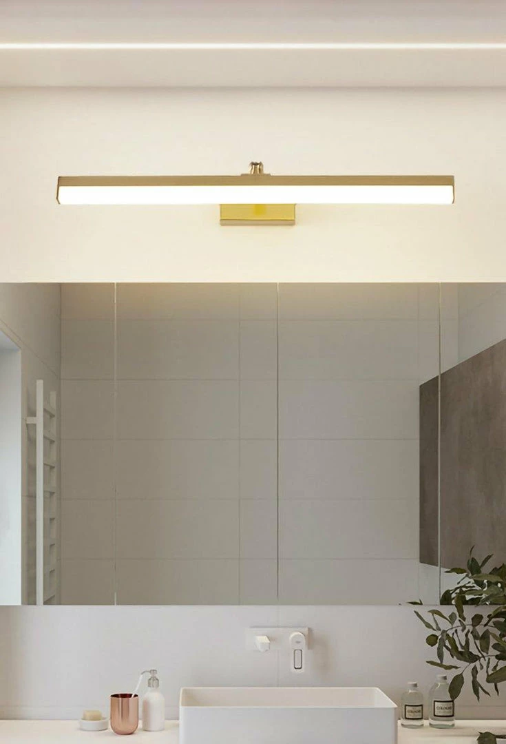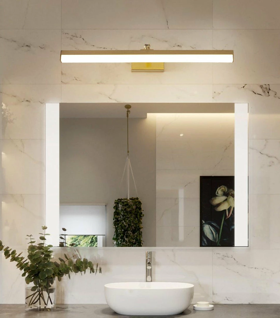 This LED bathroom vanity features a modern clean design with a front light cover made of acrylic and a rear panel made of brass. It is an LED light source.