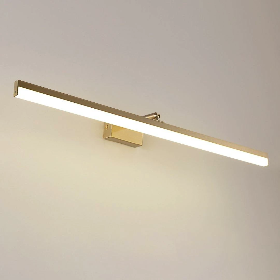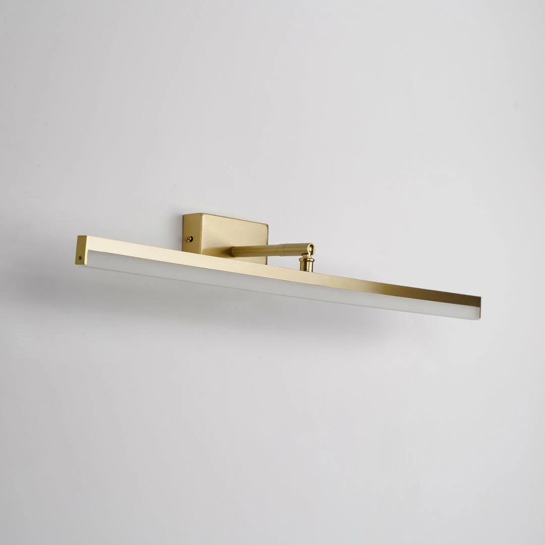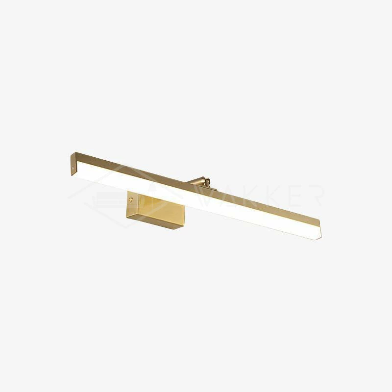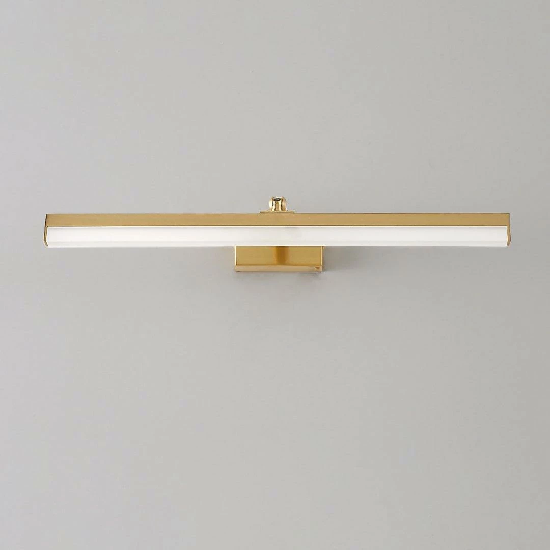 This LED bathroom vanity features a modern clean design with a front light cover made of acrylic and a rear panel made of brass. It is an LED light source.