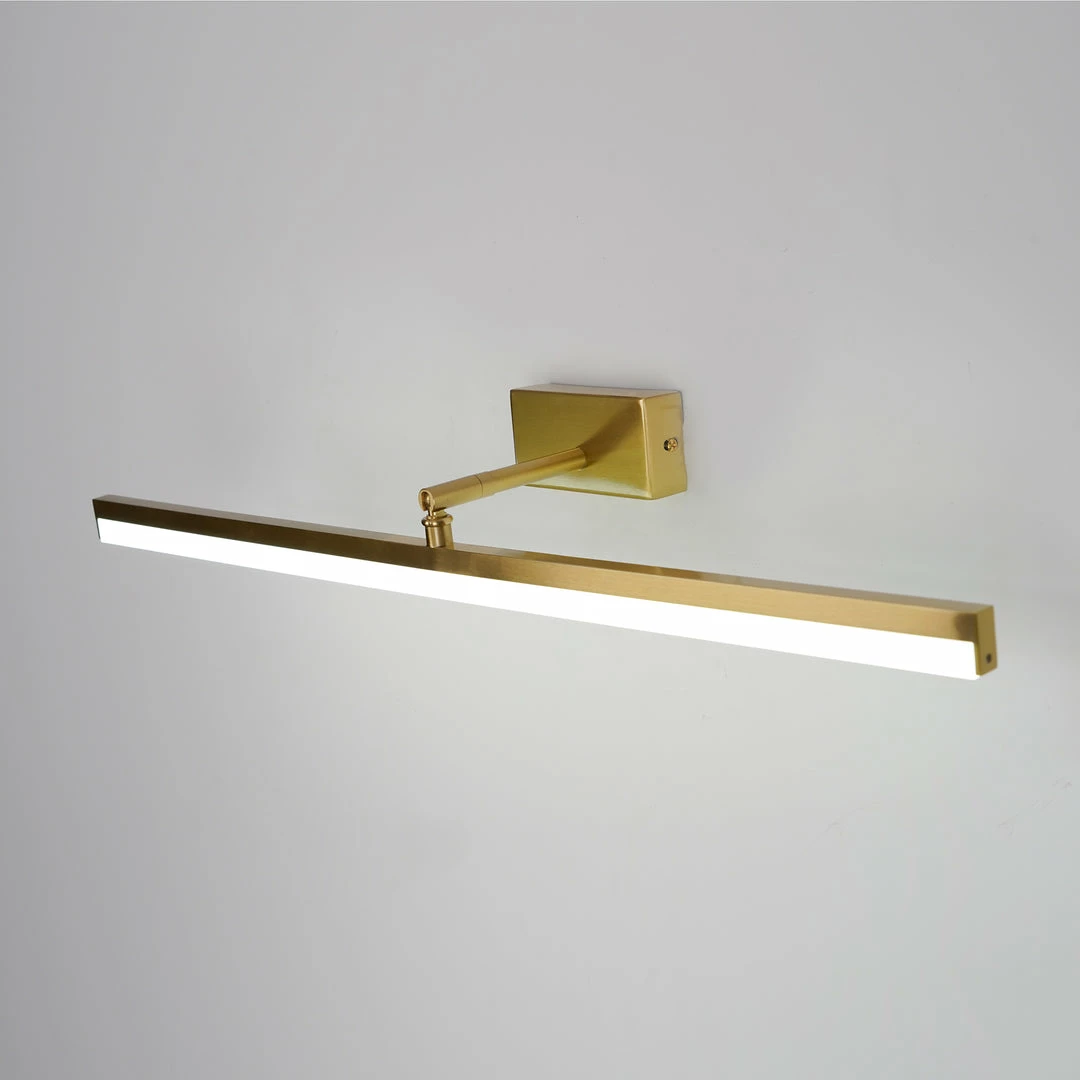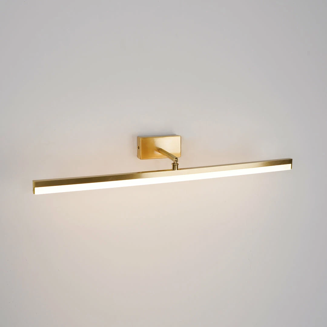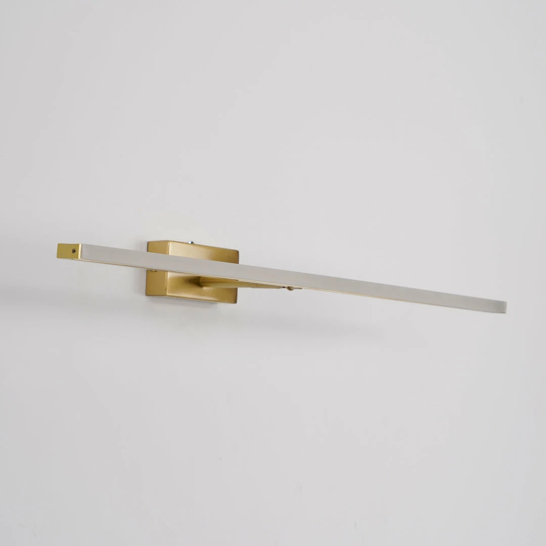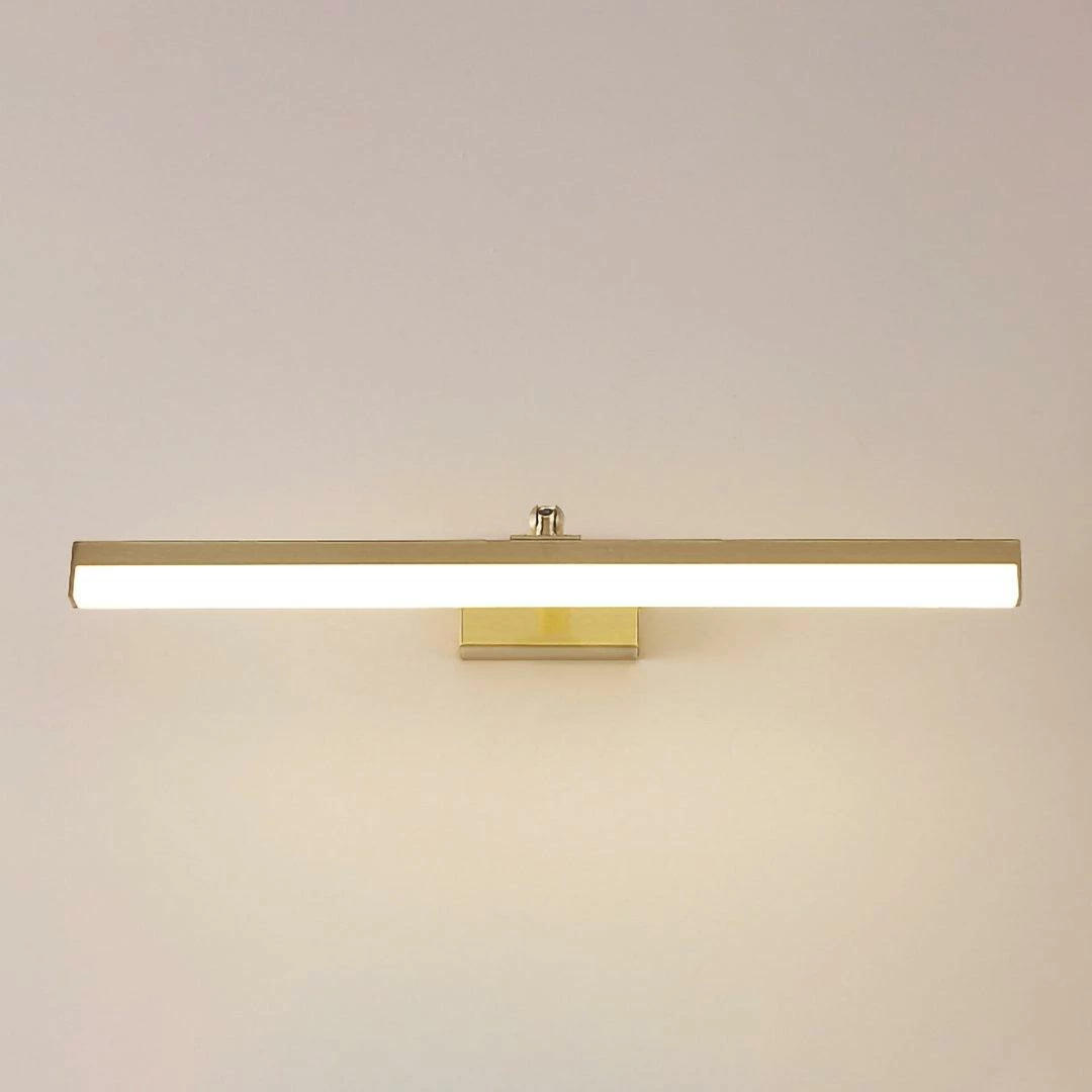 This LED bathroom vanity features a modern clean design with a front light cover made of acrylic and a rear panel made of brass. It is an LED light source.