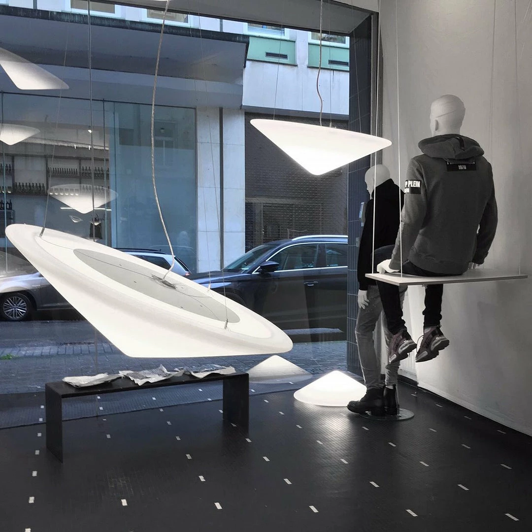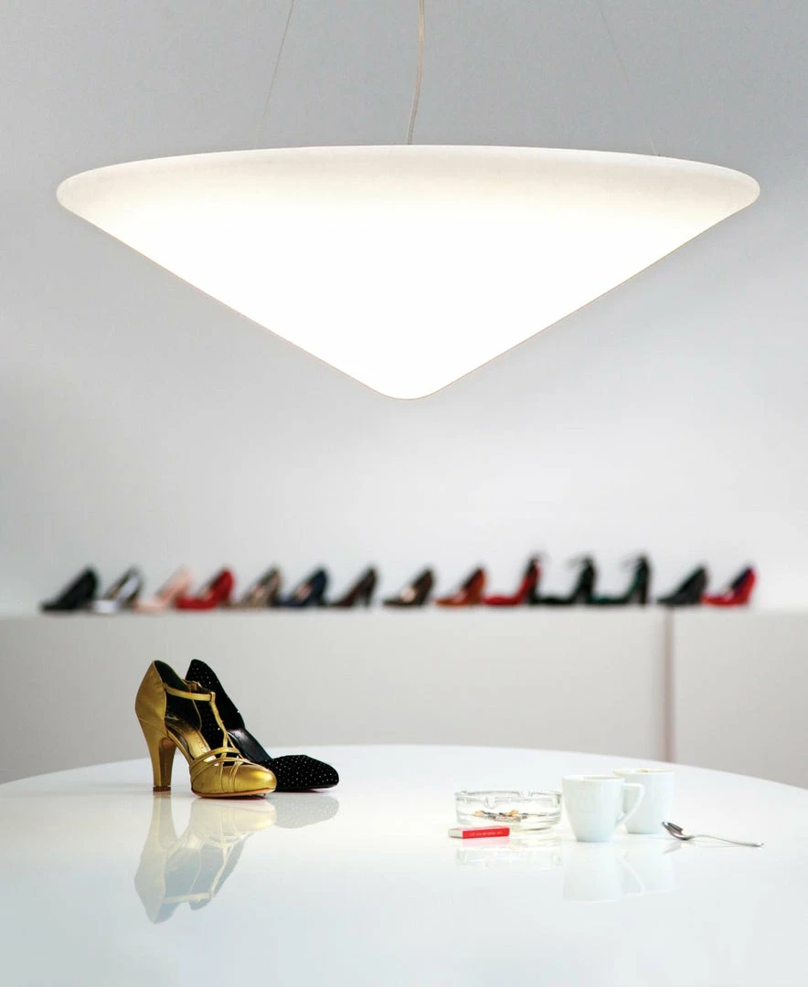 Dimmable with an external phase dimmer. The pendant lamp Cao Mao by next is shaped like the traditional hat of Chinese rice pickers. It seems to be lightweight despite its large size. Its translucent polyethylene diffuser is adjustable in height and can also be tilted to produce a more surprising effect.