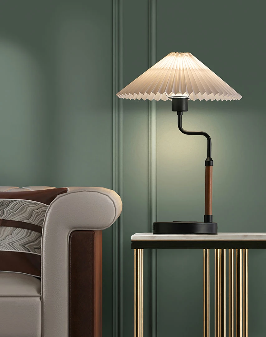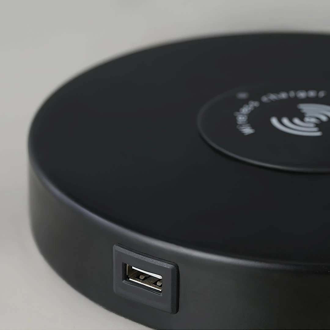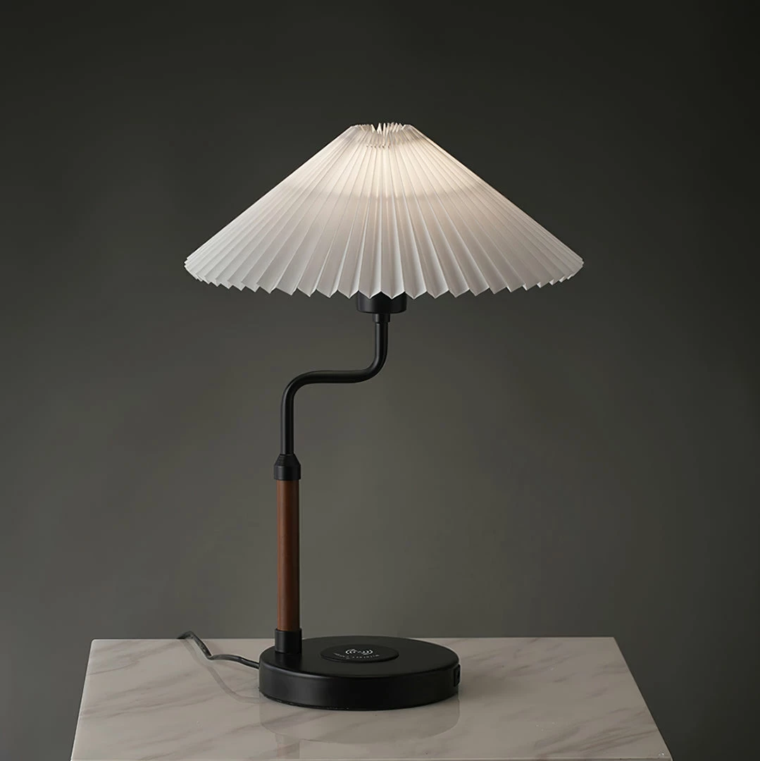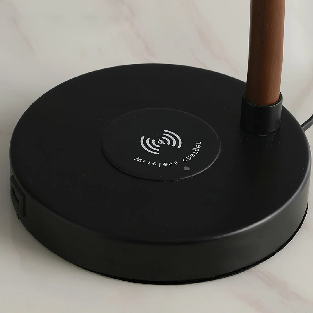 A modern beauty, the Maxine CB2 Suki Table Lamp introduces a mid-century modern silhouette to your home with a touch of retro influence. With fabric white shade๏ผThe rounded base extends a slim, gracefully curving body that leads up to a conical shade. A single bulb rests within the adjustable shade, pointing its light in a bright and focused manner. The base contains wireless charging technology for your phone and an additional USB port for a second device.