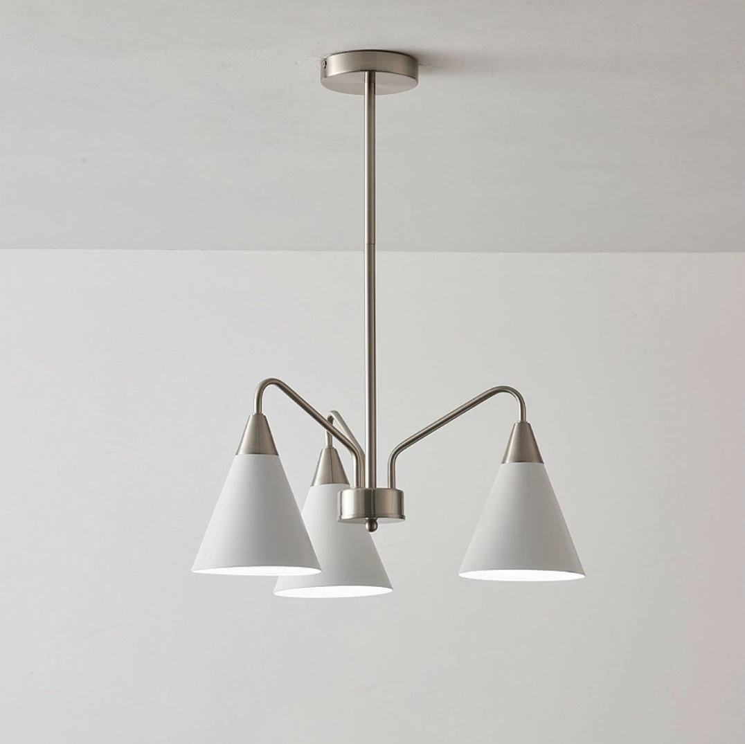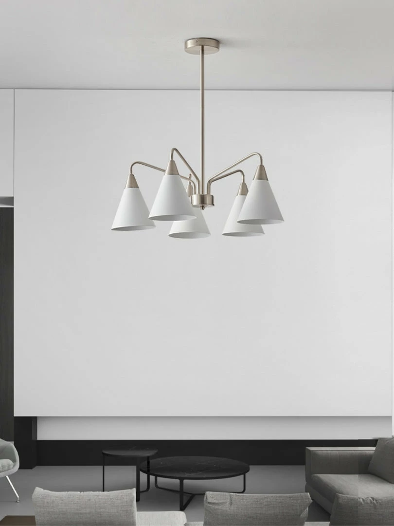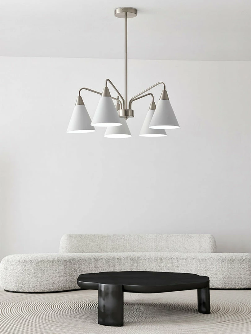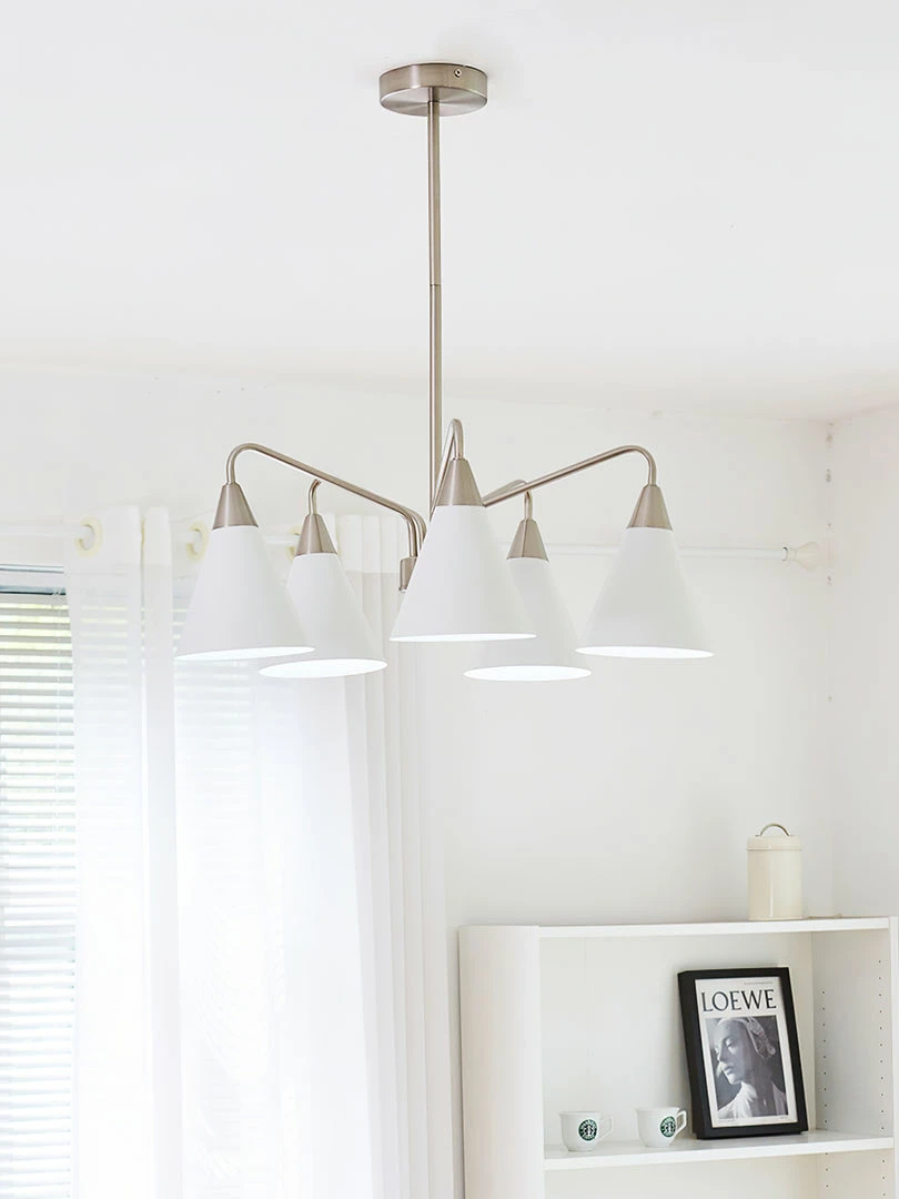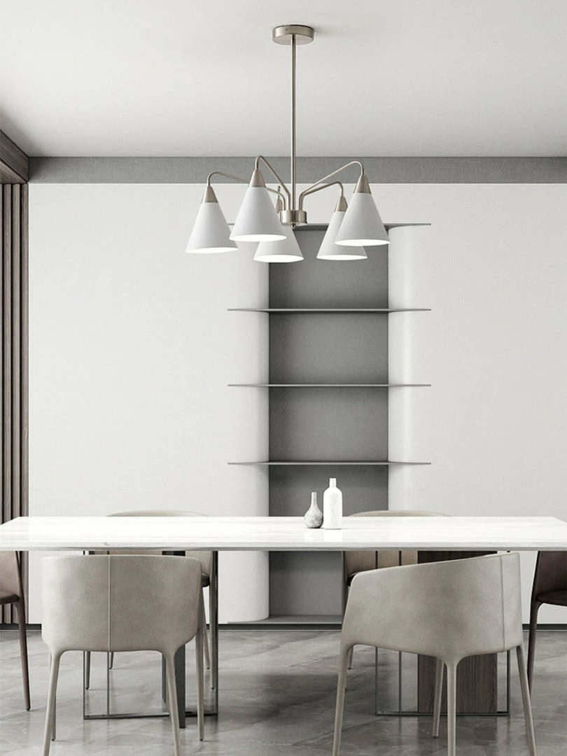 Fashion Cono Chandelier took a design classic and reinterpreted it into a fresh lighting ๏ฌxture with a strong attention to detail. This exquisite pendant light features asymmetric structure with white lampshade and chrome plated details.this chandelier’s cone shades get a glowing review in any space.