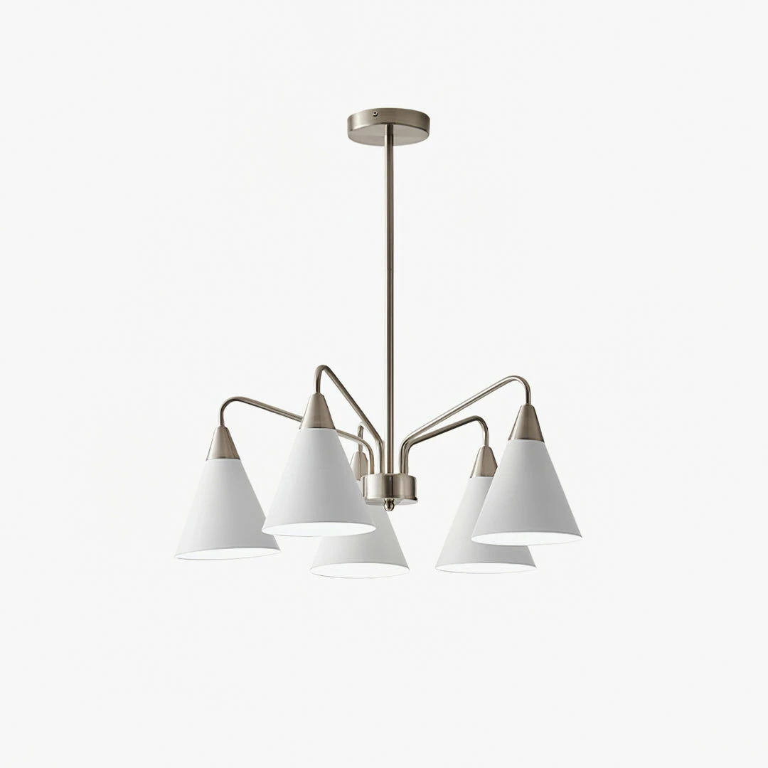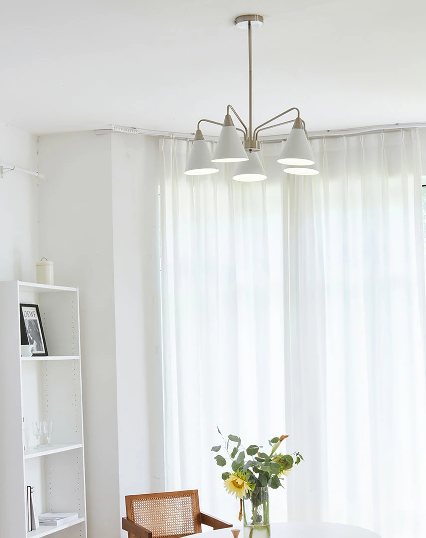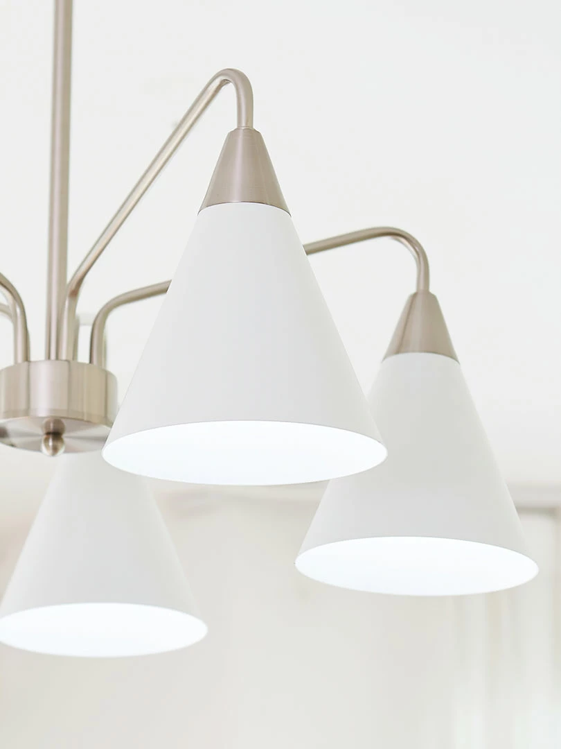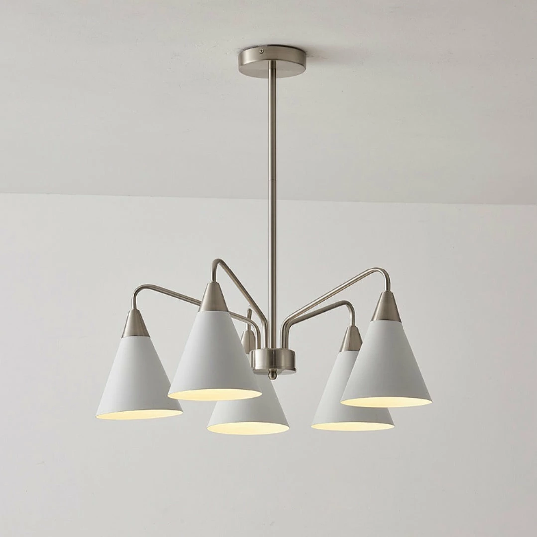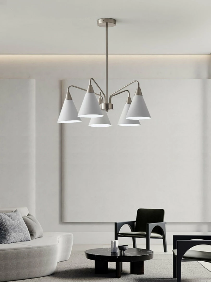 Fashion Cono Chandelier took a design classic and reinterpreted it into a fresh lighting ๏ฌxture with a strong attention to detail. This exquisite pendant light features asymmetric structure with white lampshade and chrome plated details.this chandelier’s cone shades get a glowing review in any space.