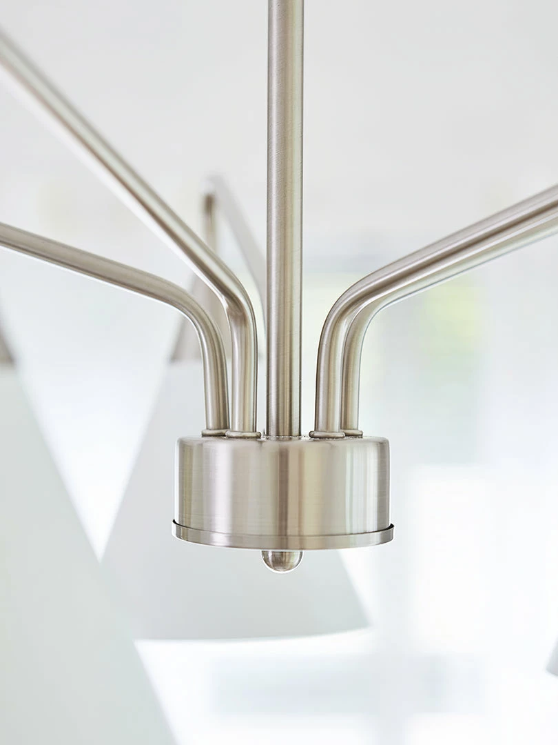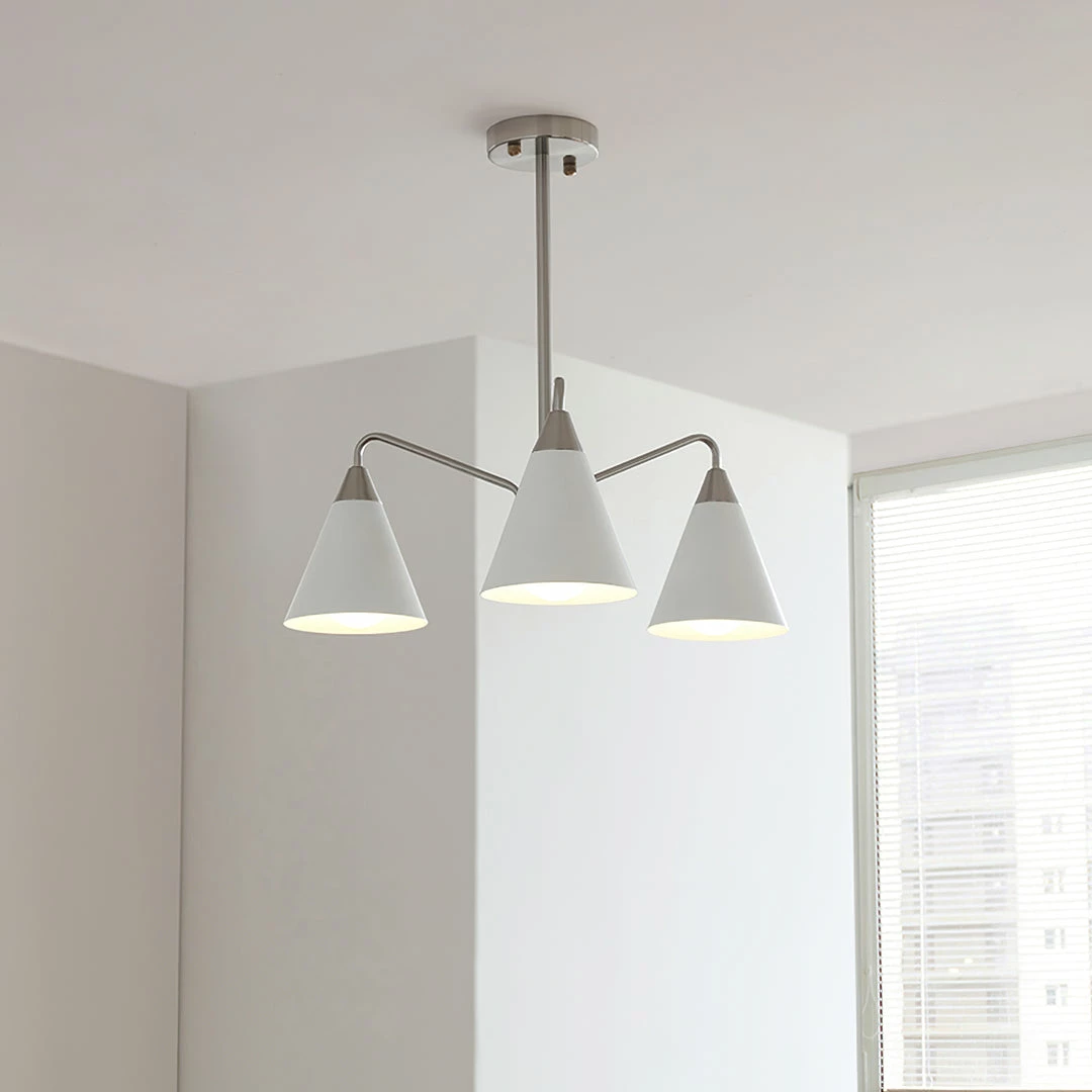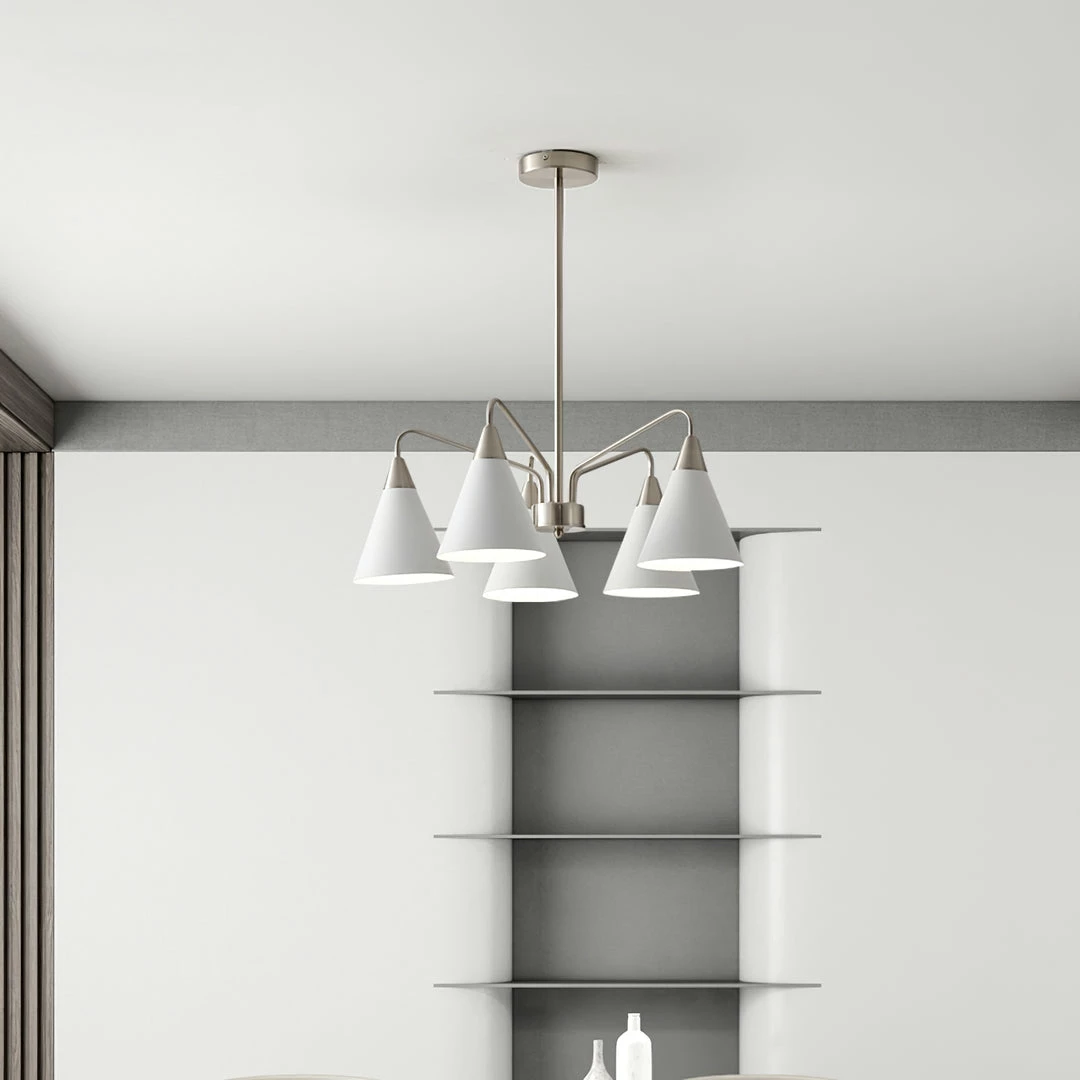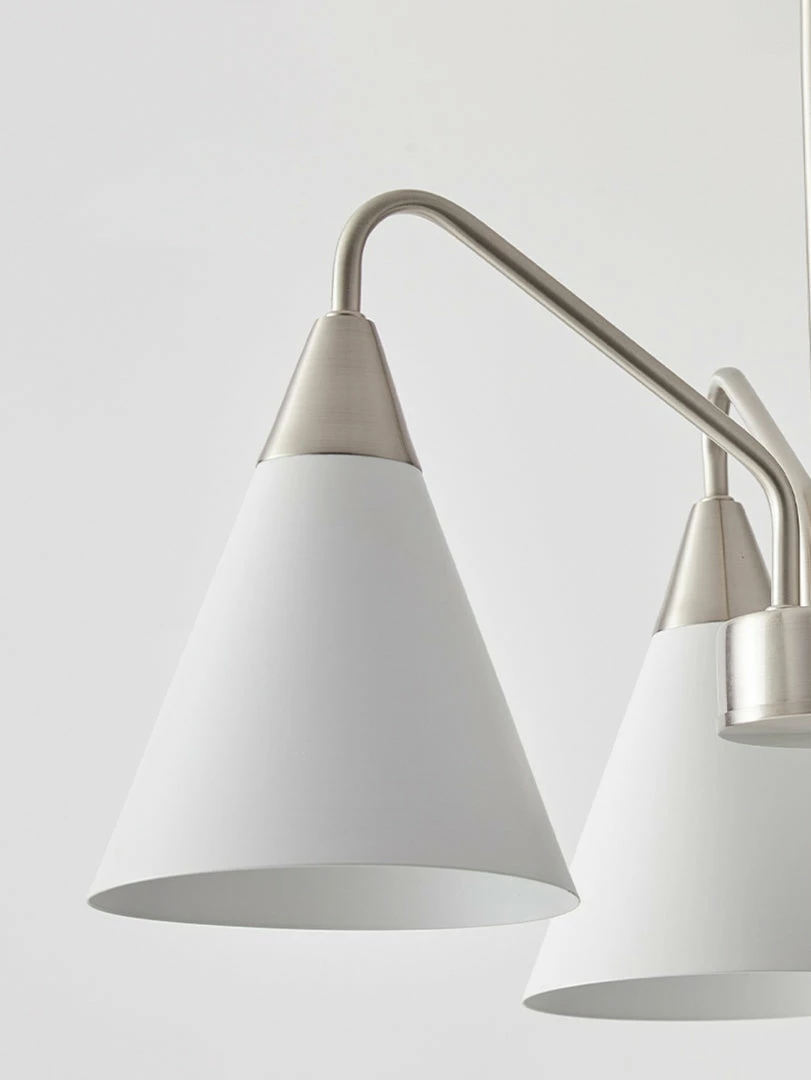 Fashion Cono Chandelier took a design classic and reinterpreted it into a fresh lighting ๏ฌxture with a strong attention to detail. This exquisite pendant light features asymmetric structure with white lampshade and chrome plated details.this chandelier’s cone shades get a glowing review in any space.