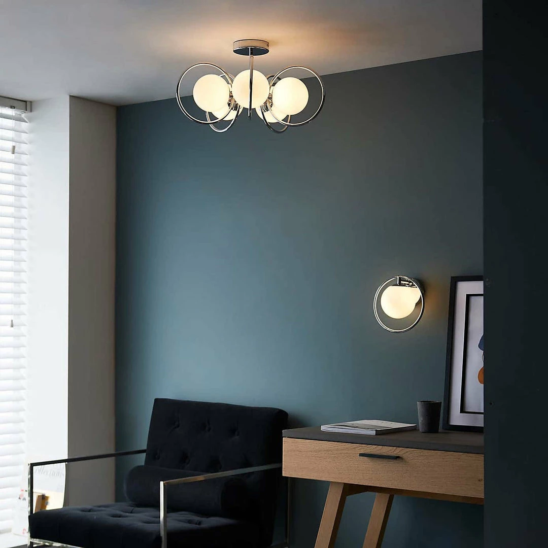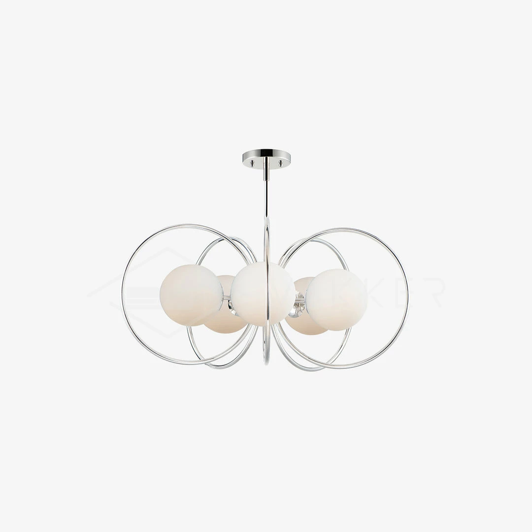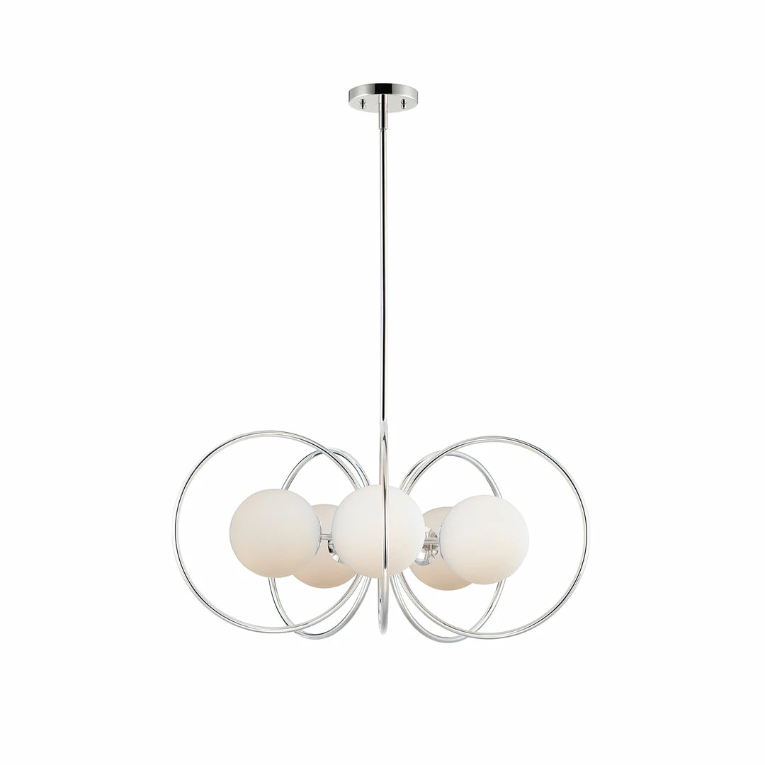 Hoops of Polished Nickel surround glass balls of Satin White to create this crisp and clean modern design. This current design trend compliments both modern and transitional aesthetics.
