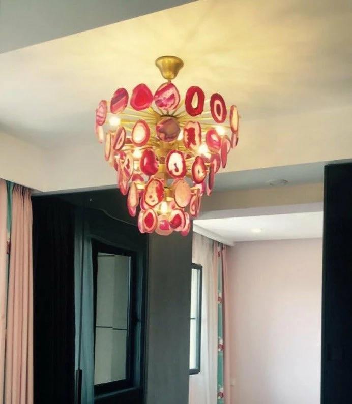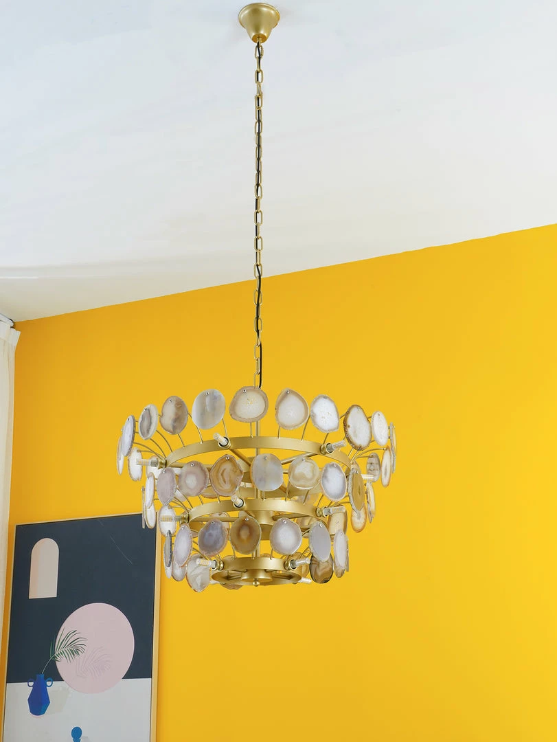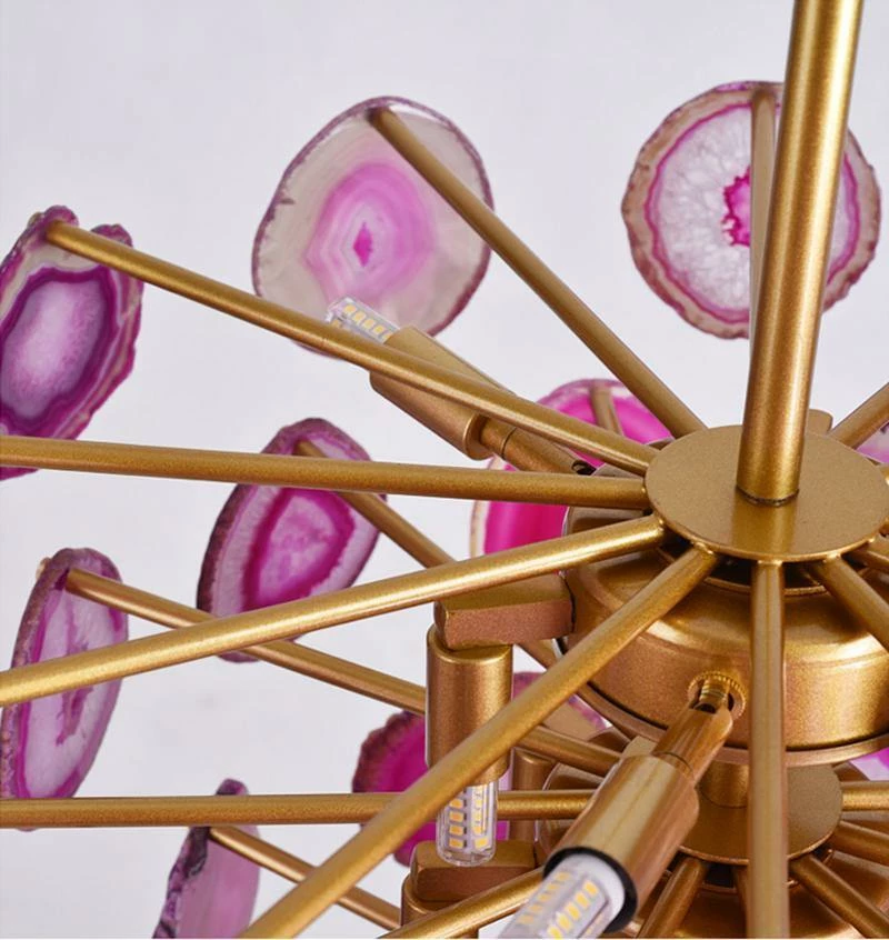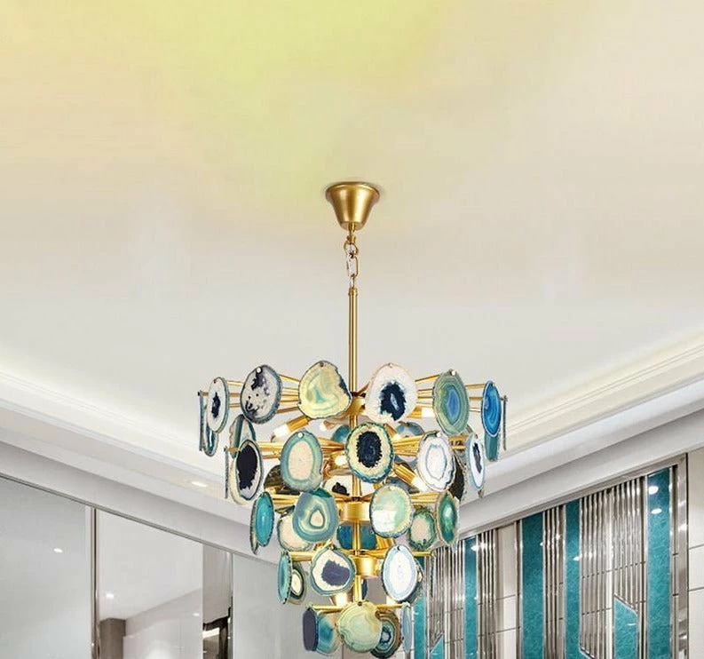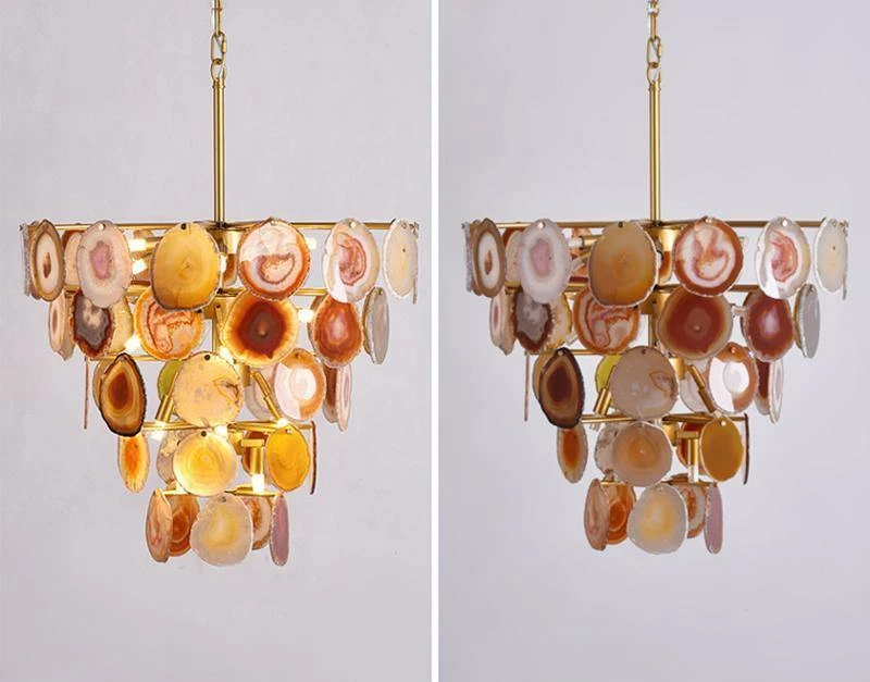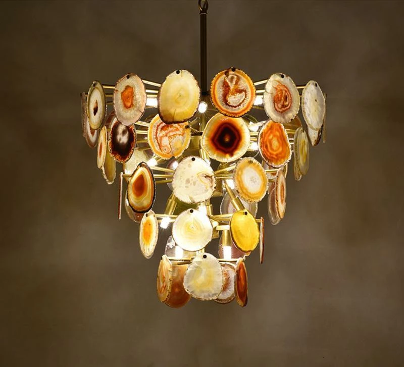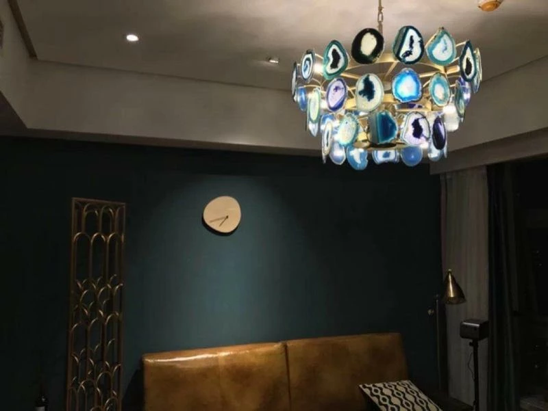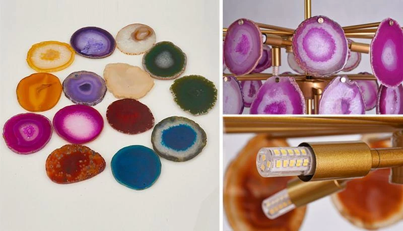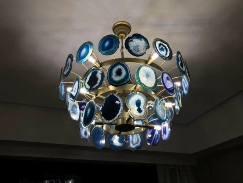 This is a luxurious agate chandelier. The natural agate rough is sliced, polished, perforated, and made. The agate is brightly colored and has a smooth surface. It has a strong light transmission and no glare.
