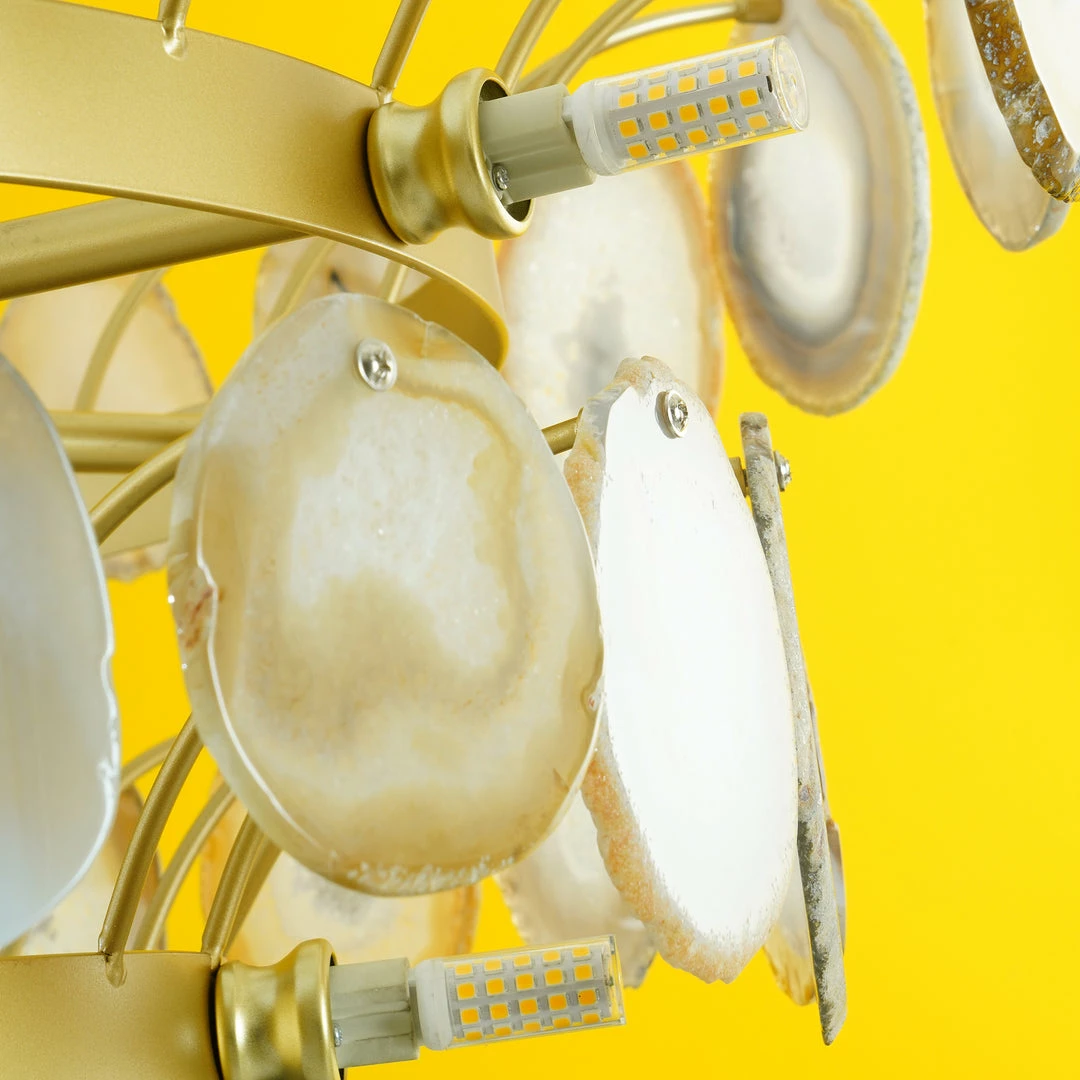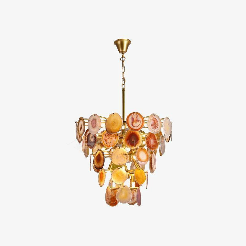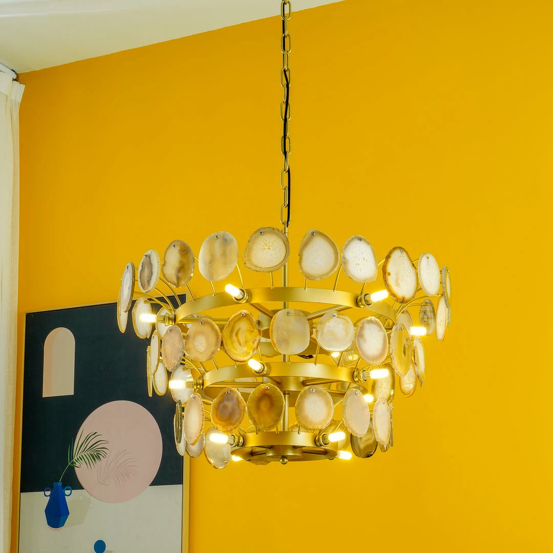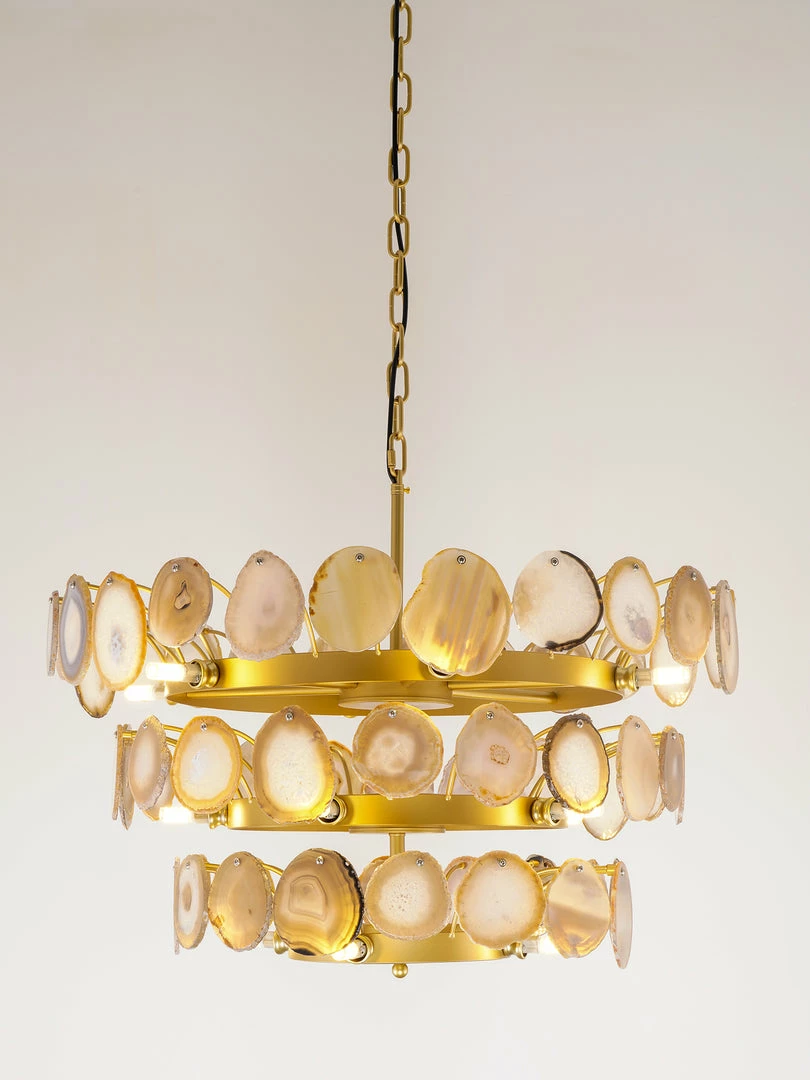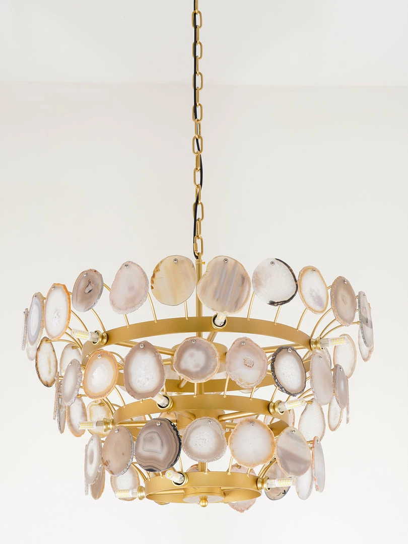 This is a luxurious agate chandelier. The natural agate rough is sliced, polished, perforated, and made. The agate is brightly colored and has a smooth surface. It has a strong light transmission and no glare.
