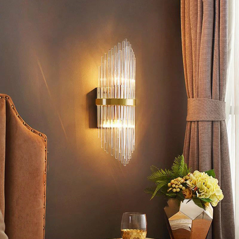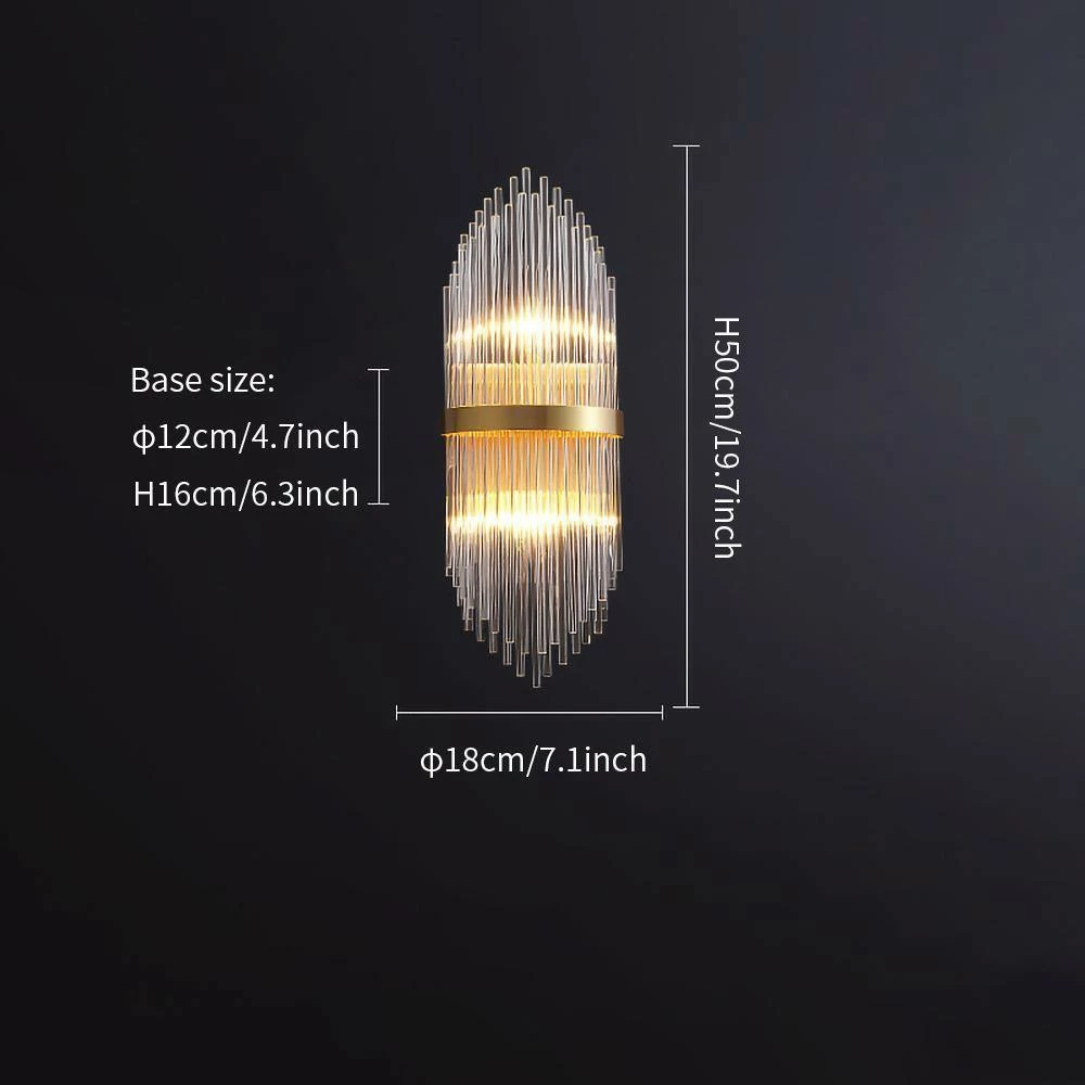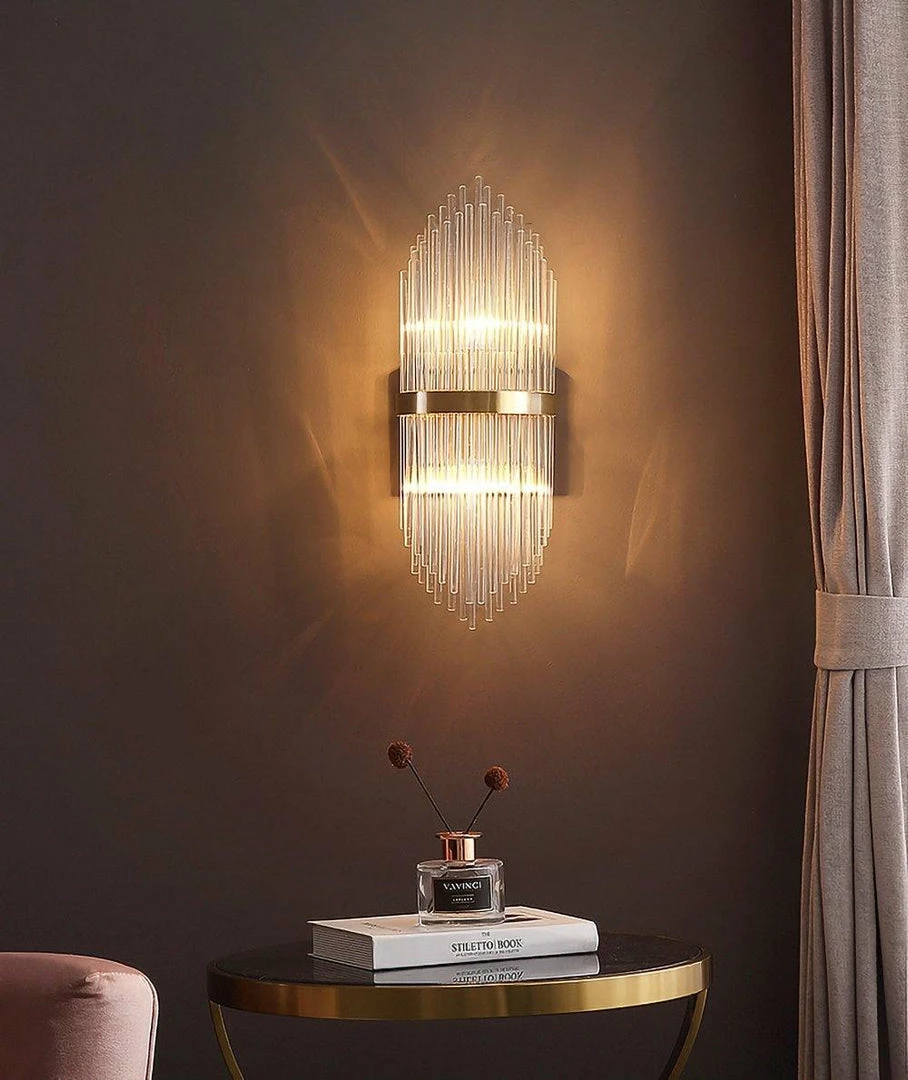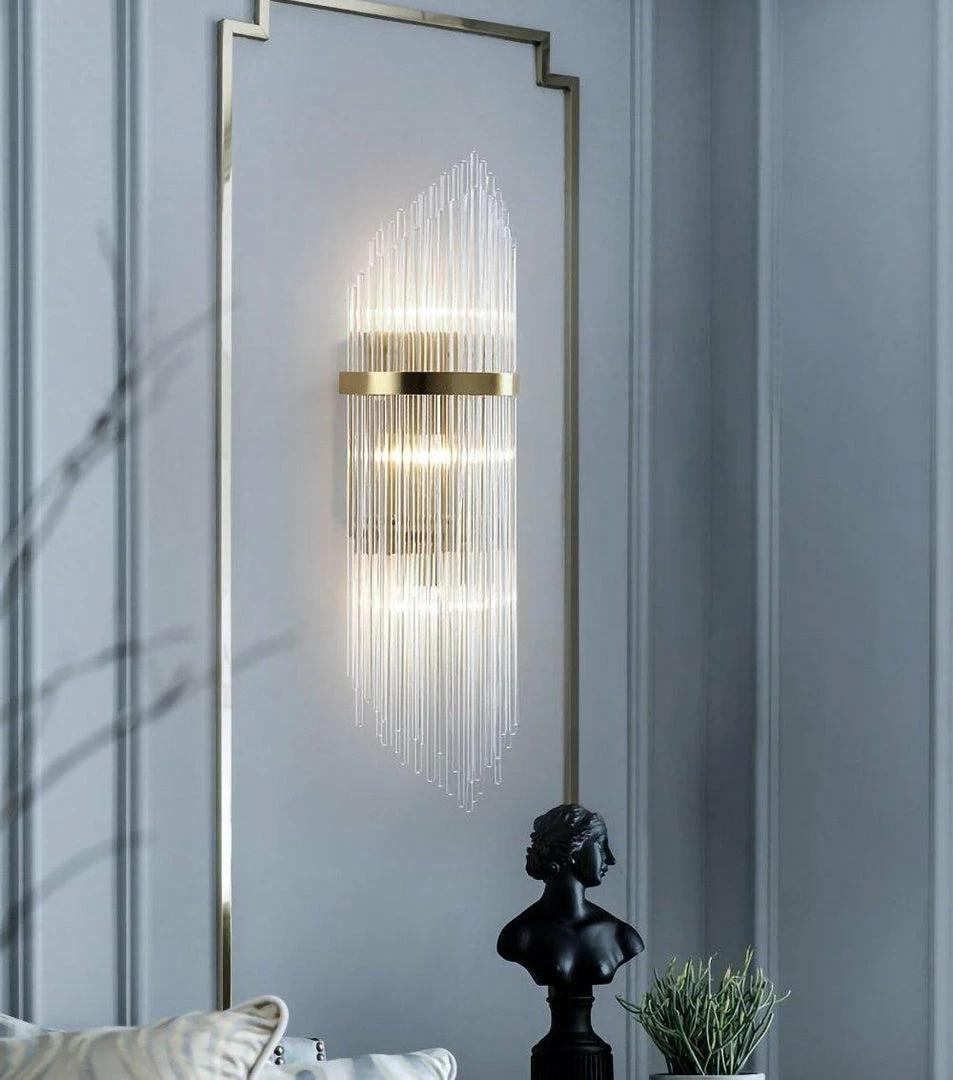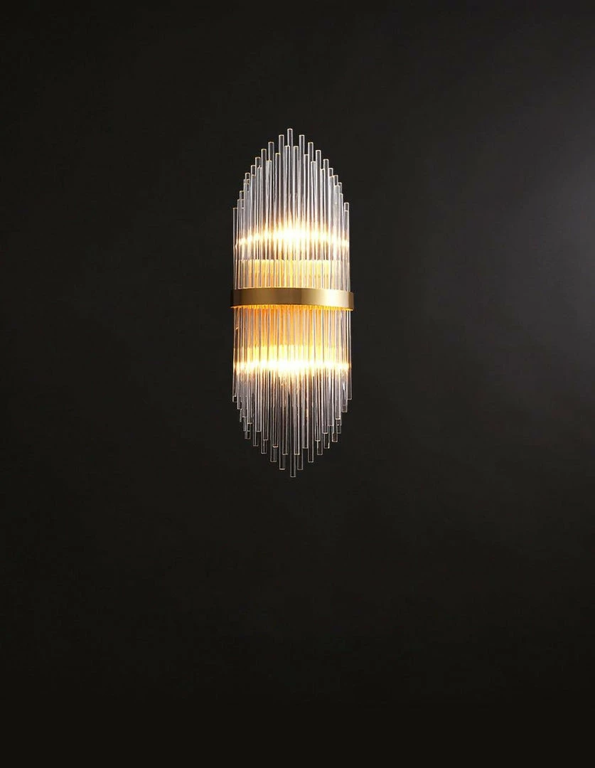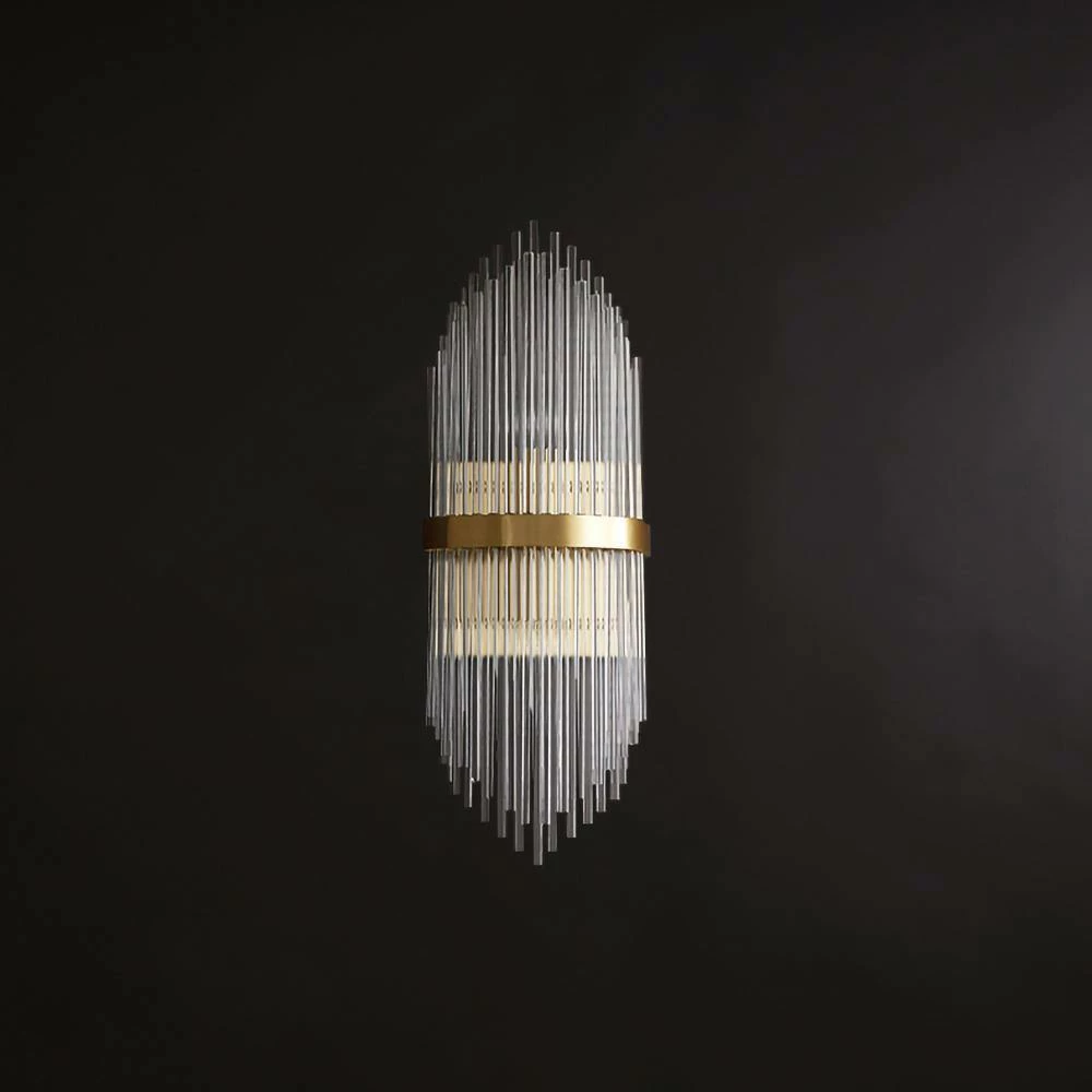 Outstanding modernist wall lamps are made up of highly alternating glass crystal rods that form multiple layers. Sculptural design with art deco style skyscraper elements. Features large brass centerline trim detailing, as well as brass frames and fittings. Newly routed and equipped with two lights that illuminate up and down. The central brass body has two grids for holding glass crystal rods.