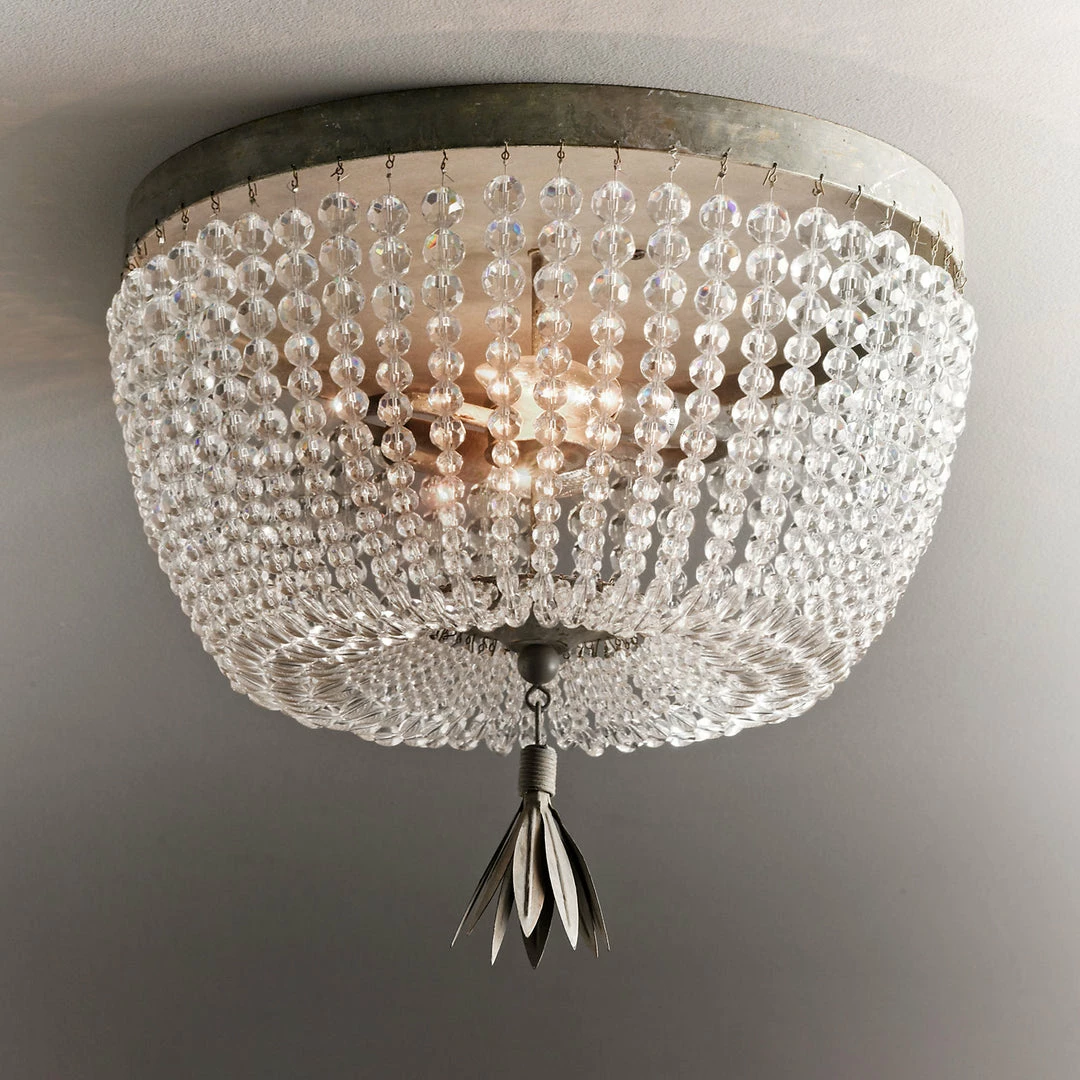 Adorned with strands of crystal beads, our aged-metal flushmount is adept at transforming an ordinary room into a fairytale setting.