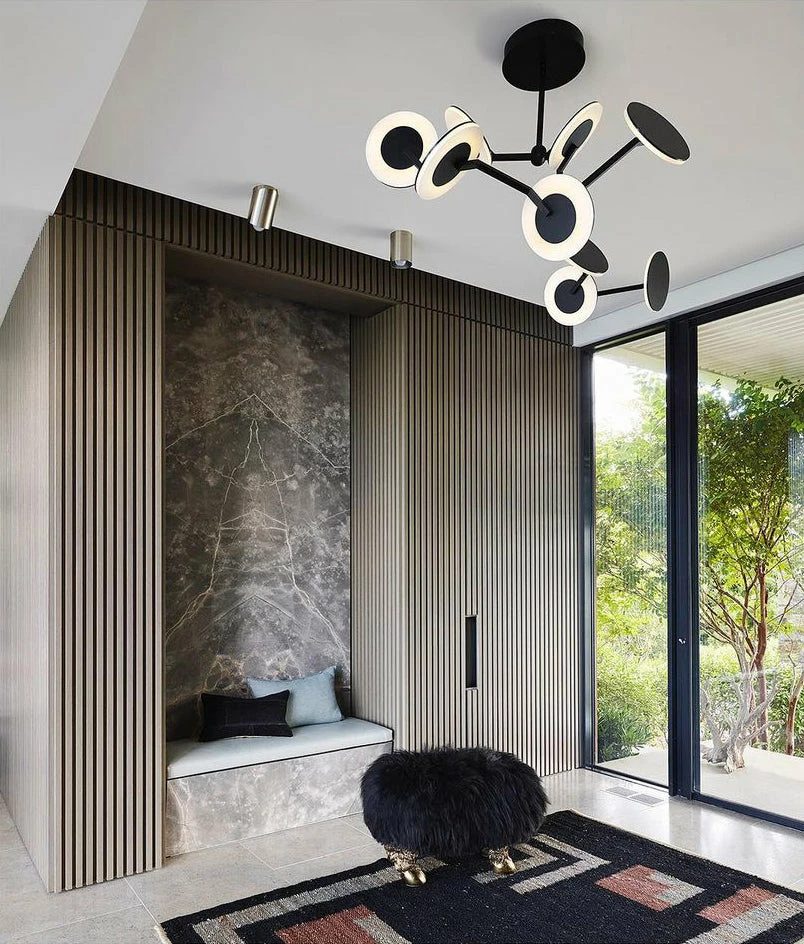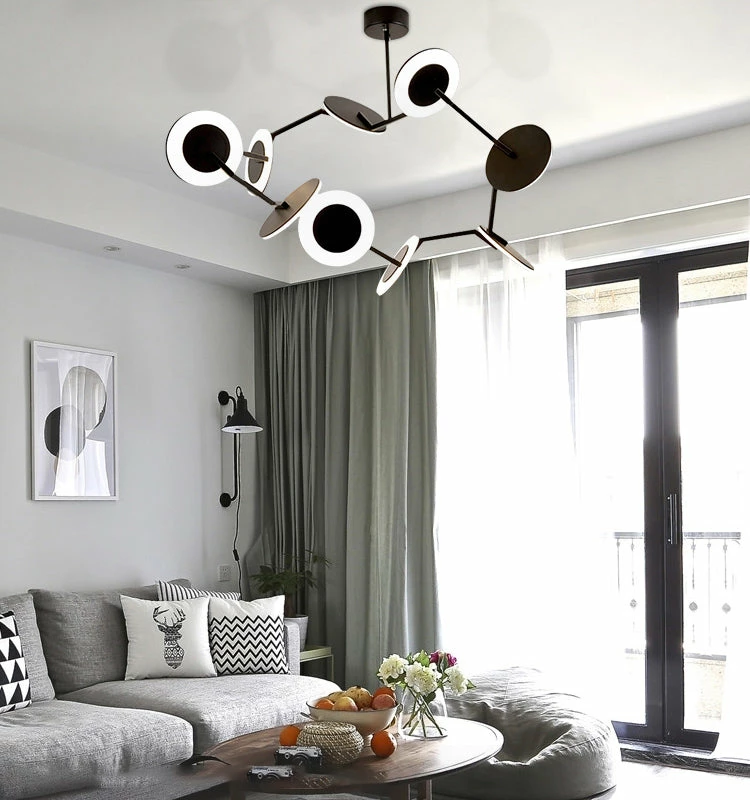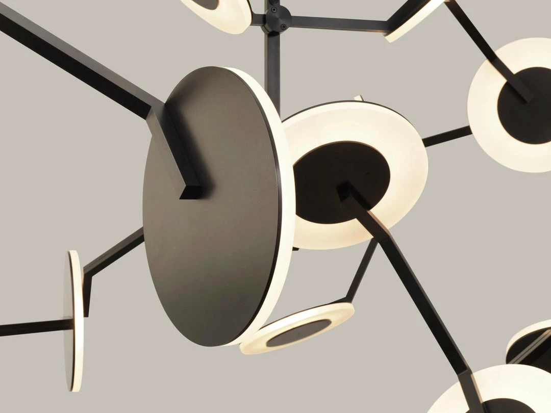 Disco is a chandelier with softly glowing rings of light. The discs are linked to one another by angled arms which change the orientation of the discs to one another. Many configurations are offered and the number of light discs can also be specified.
