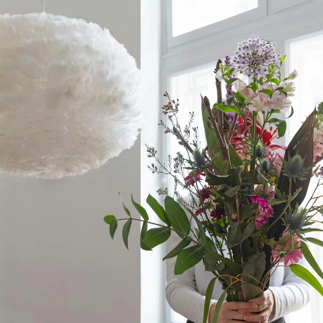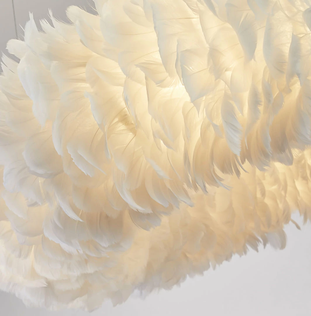 Thousands of goose feathers surround the bright core of the Eos White Pendant, a design that is a statement of humane practices and sustainable production. The feathers are procured responsibly, sanitized and repurposed for the fixture, then attached to the paper structure on the inside. The Eos is fire-resistant and easily maintained; you can clean and revitalize the feathers with a hairdryer.