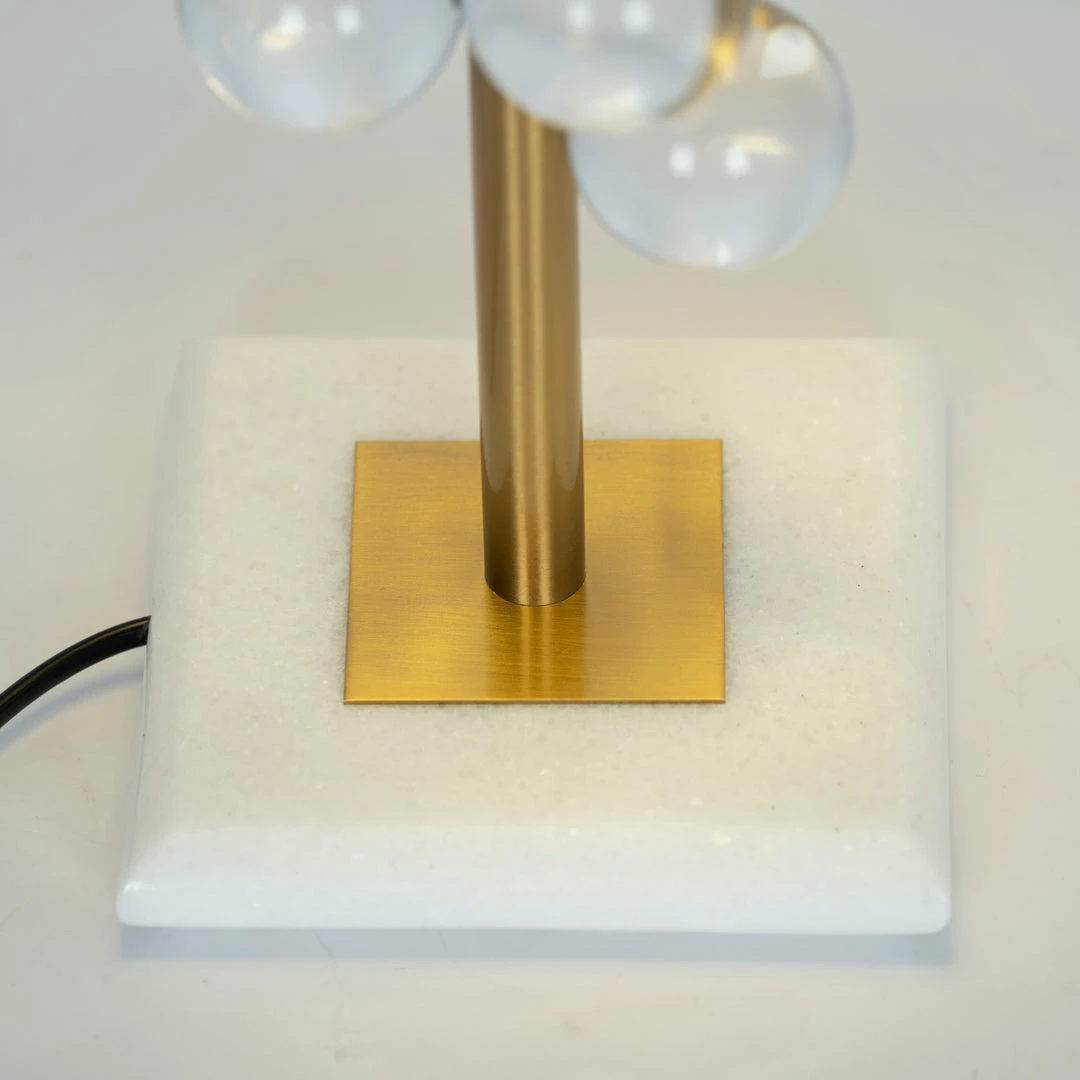 The sensational Globo Table Lamp by Vakkerlighting features a constellation of glass spheres that float on a slender Copper stem anchored by a sculptural marble base and topped with a brass dome. The dazzling shade refracts the light, makes the acrylic sparkle, and creates a lovely glow for warming your interior space.