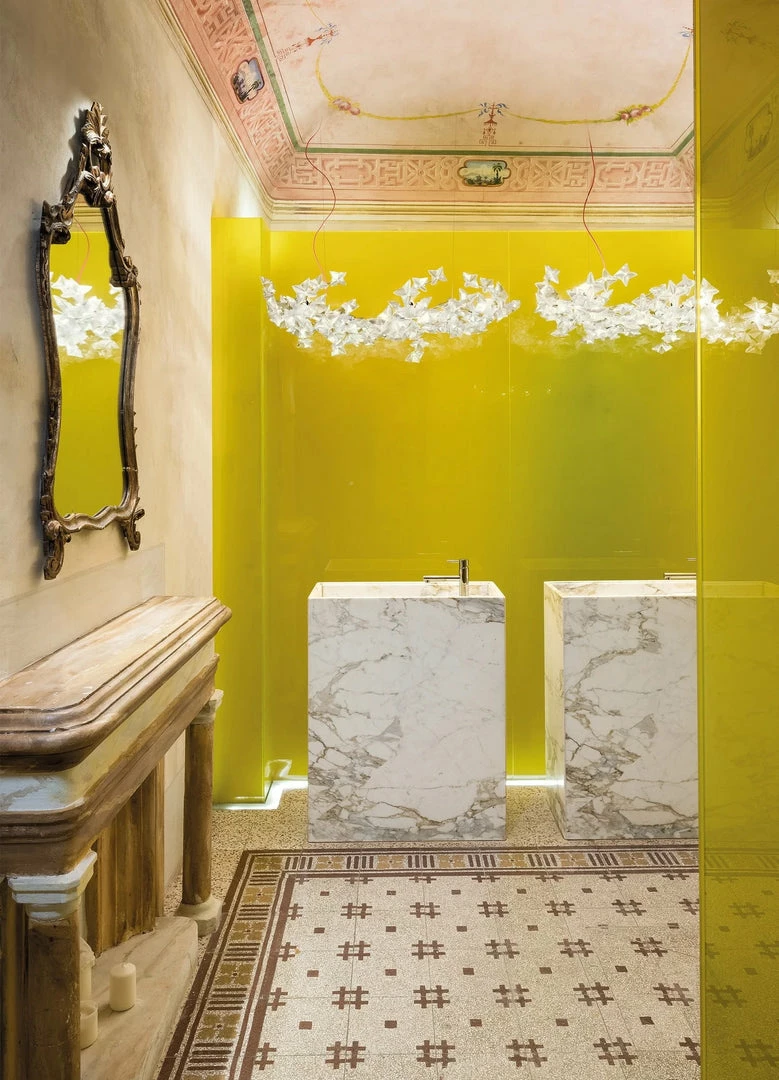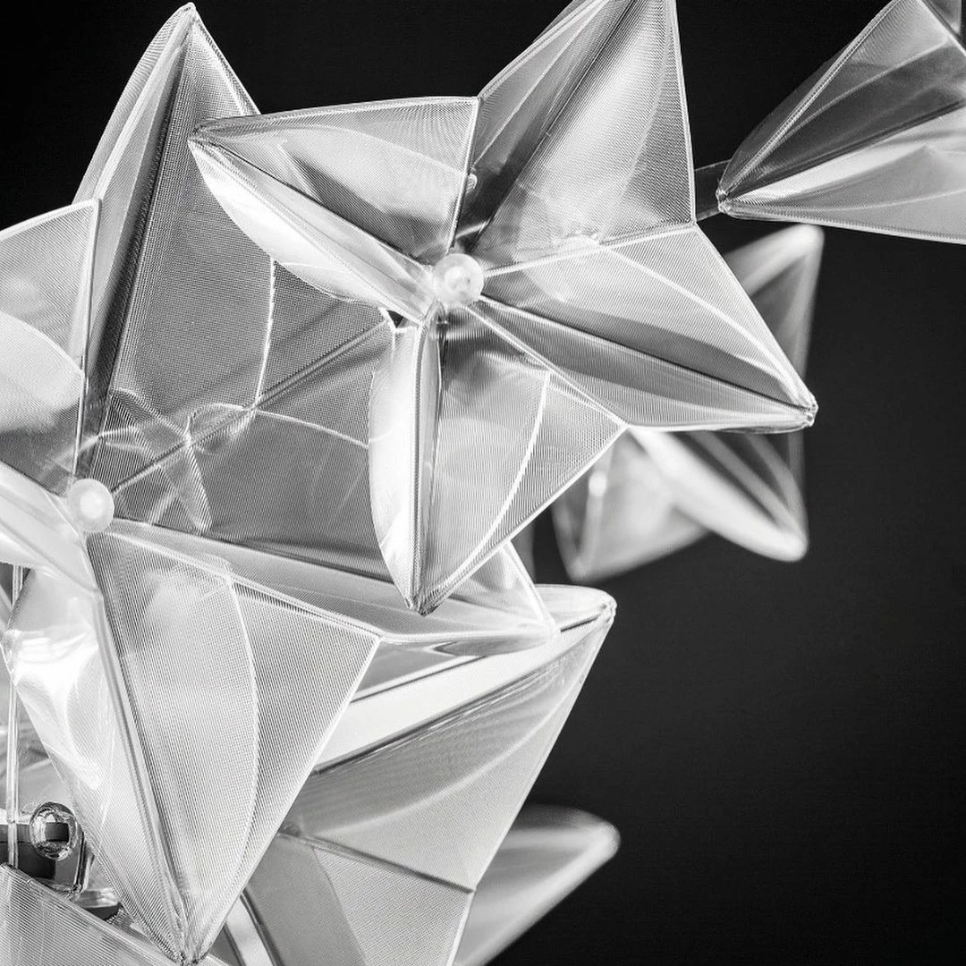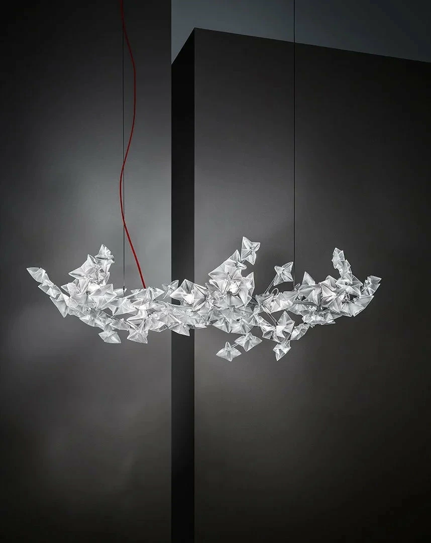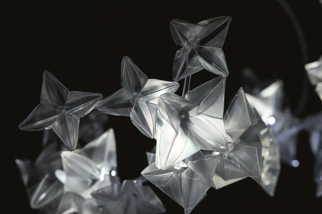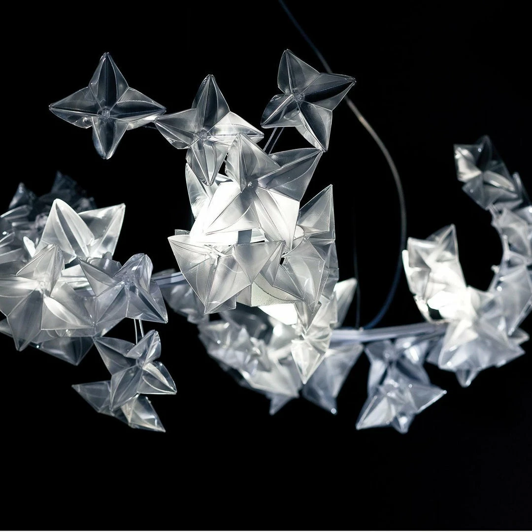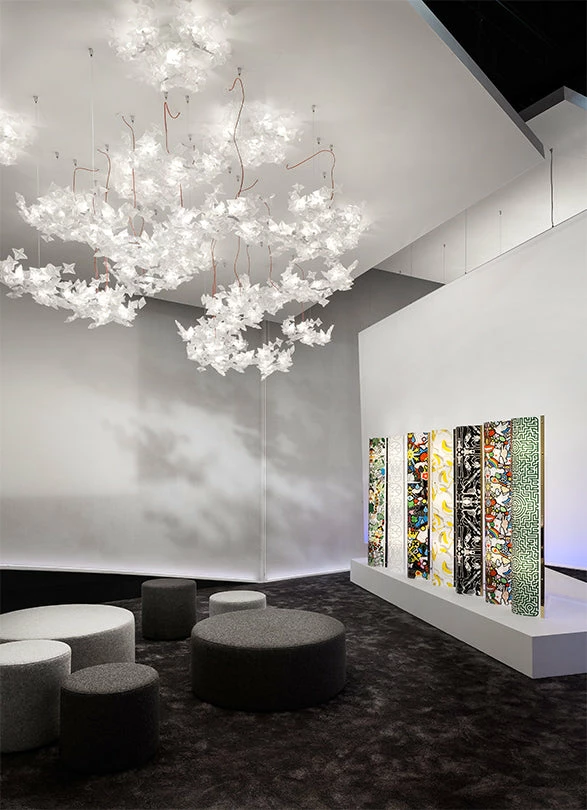 Hanami is a symbol of delicate poetry, taking its name from the traditional Japanese ritual of observing blossoming cherry trees. The Hanami family includes ethereal suspensions, available in two sizes, as well as an applique version that redefines the traditional ceiling lamp concept. Hanamiโs unique, delicately coloured illumination is distributed throughout hand-folded flowers, a noble material that recreates diamond-like reflections, mounted on a painted steel and polycarbonate frame that houses its LED sources.