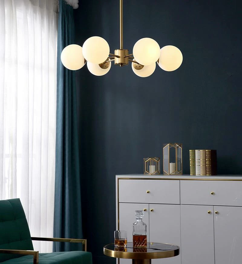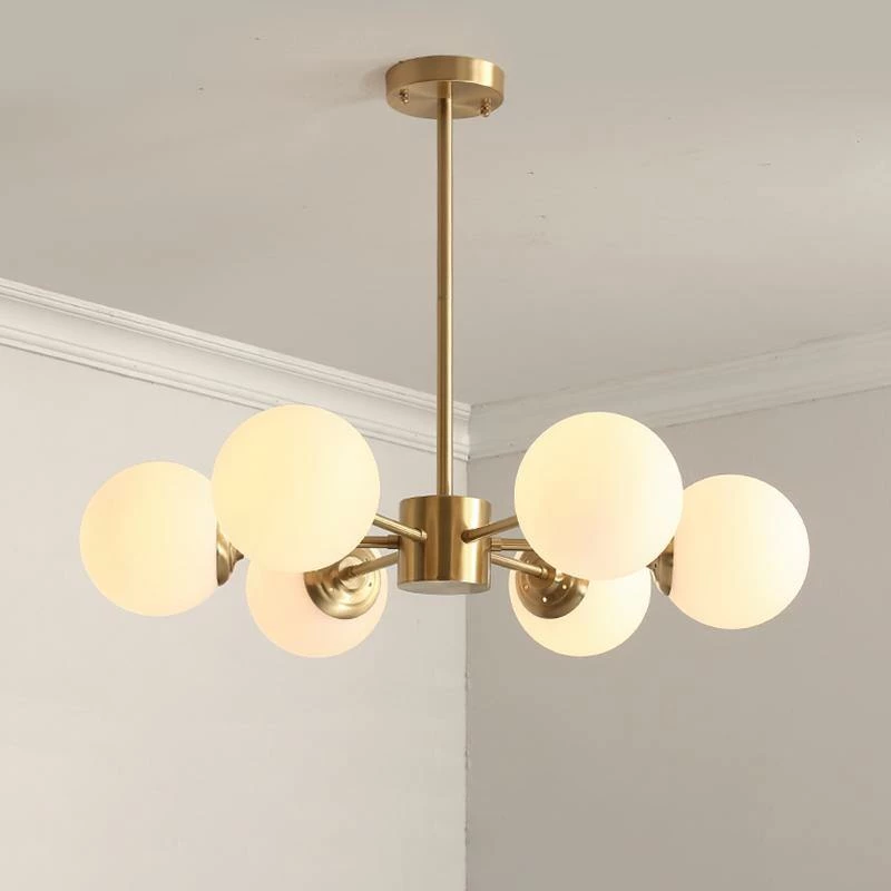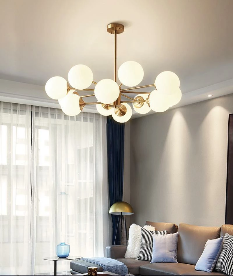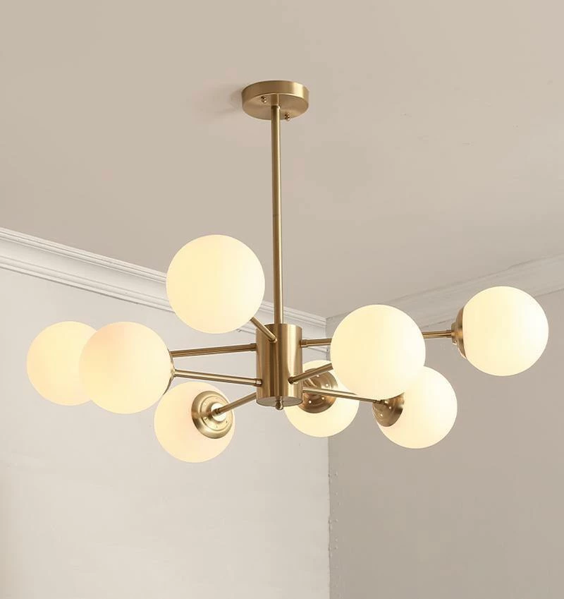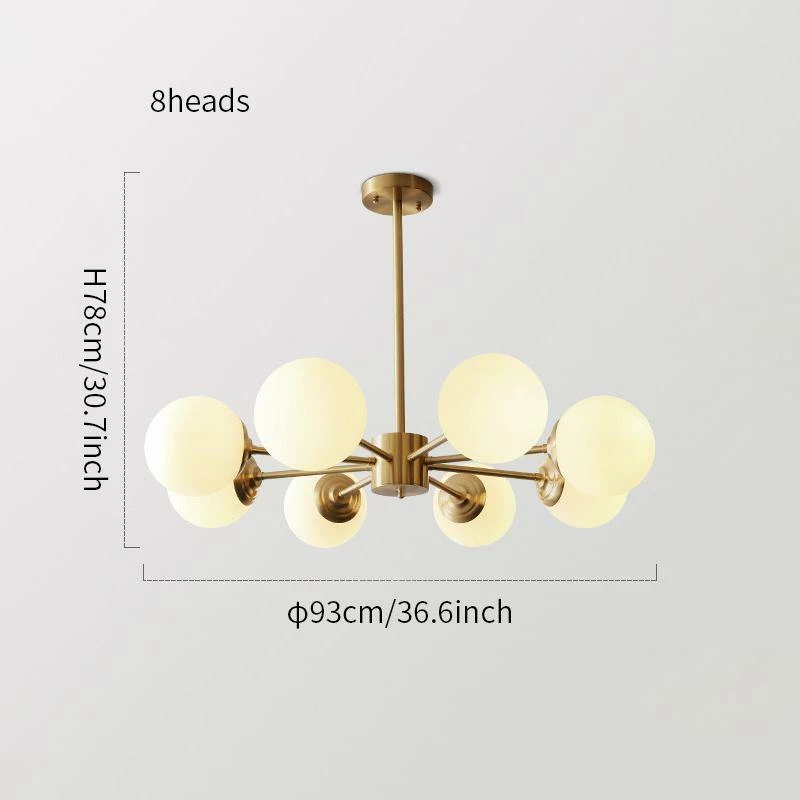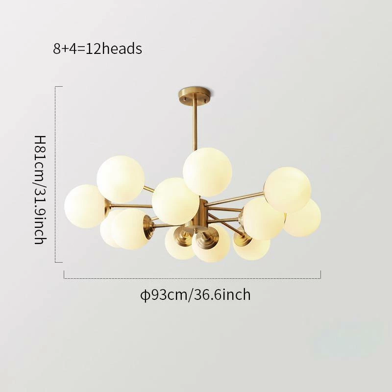 The irregular symmetry of the design in combination with the antique brass and opal glass spheres almost makes this feel like something mother nature conceived. With 6-8-12-16 lights, it provides plenty of wattage over a large table. Consider shortening the pipe so it appears to be hugging the ceiling for a totally original look. Additional pipe available. Approved for use in covered outdoor areas.