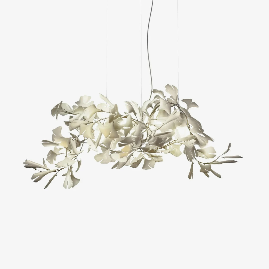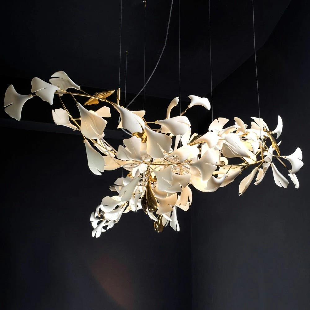 This ceramic ginkgo tree petal chandelier shows its luxurious style in overall design, material, and manufacturing technology. The brass lamp body is covered with exquisite ceramic petals, which reflects the perfect combination of lighting design and natural plants.