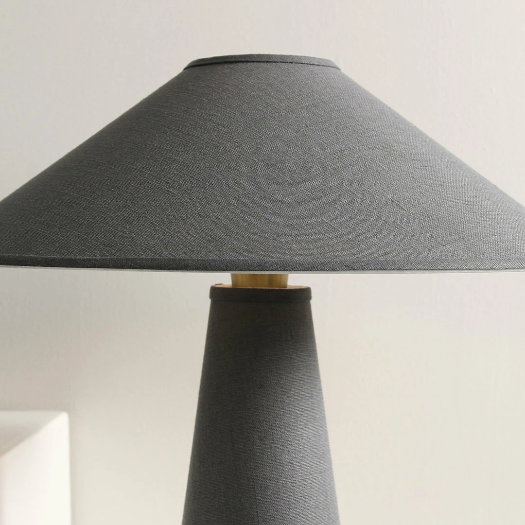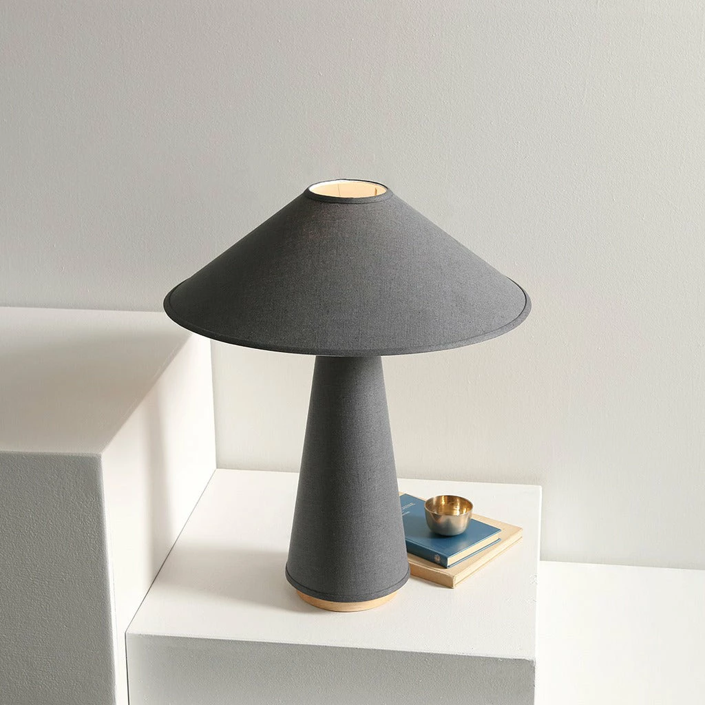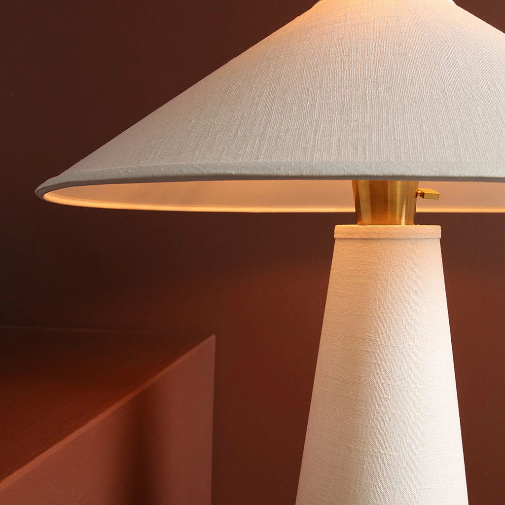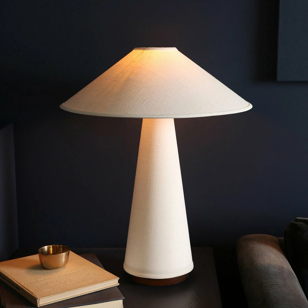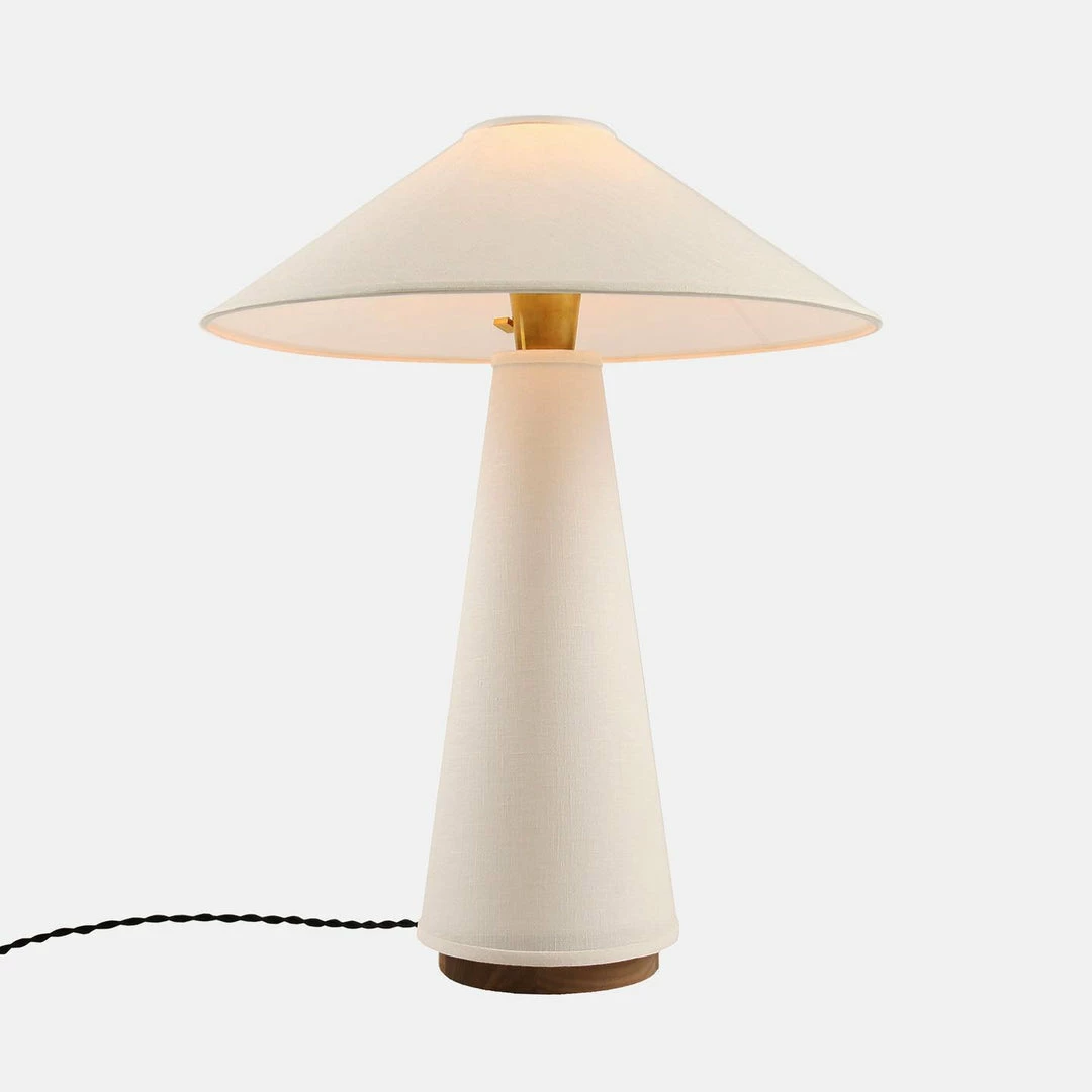 A contemporary table lamp with a linen shade and body, hardwood base, and brass details. The structural shape, distinct clean lines, and neutral tones are derived from classic mid-century modern design. Linen fabric gives a lustrous, glowing quality to create a serene atmosphere of ambient light. The understated look places emphasis on the high-quality materials.