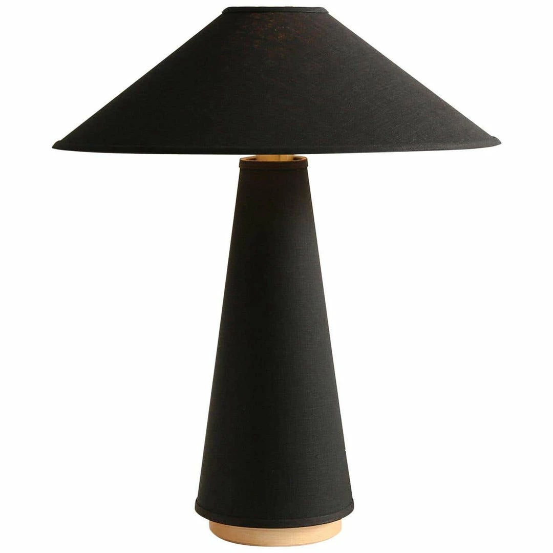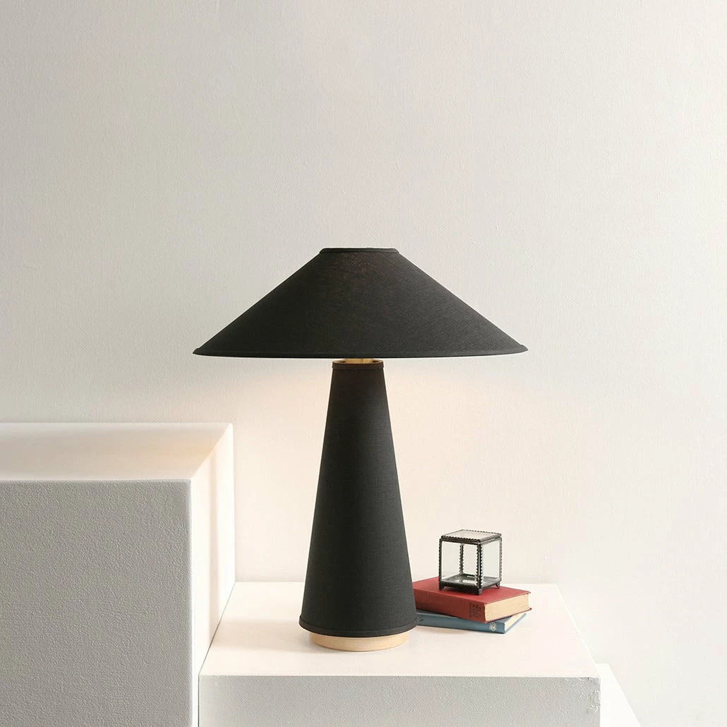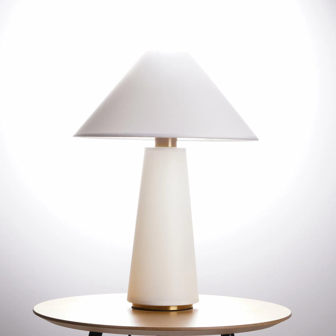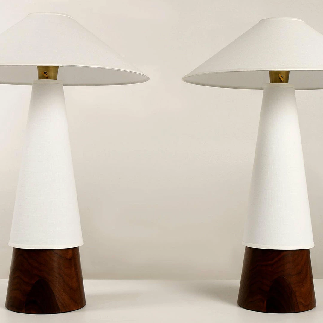 A contemporary table lamp with a linen shade and body, hardwood base, and brass details. The structural shape, distinct clean lines, and neutral tones are derived from classic mid-century modern design. Linen fabric gives a lustrous, glowing quality to create a serene atmosphere of ambient light. The understated look places emphasis on the high-quality materials.
