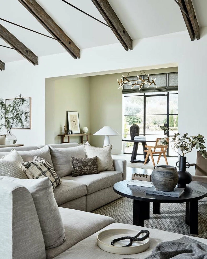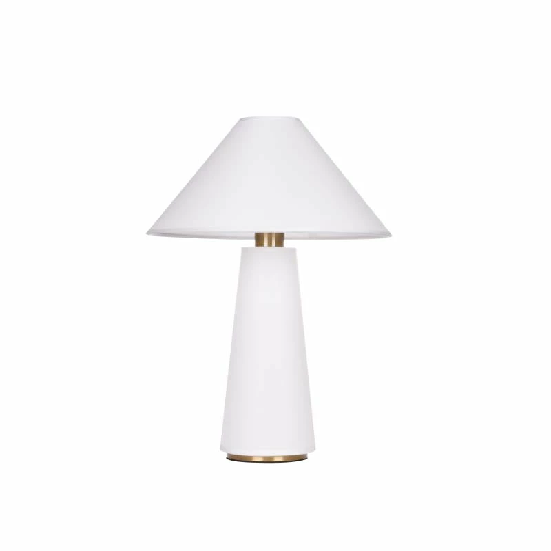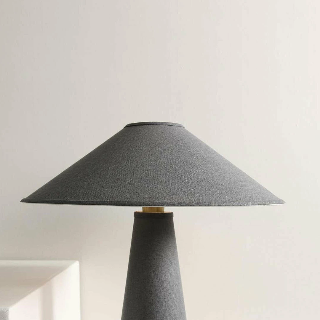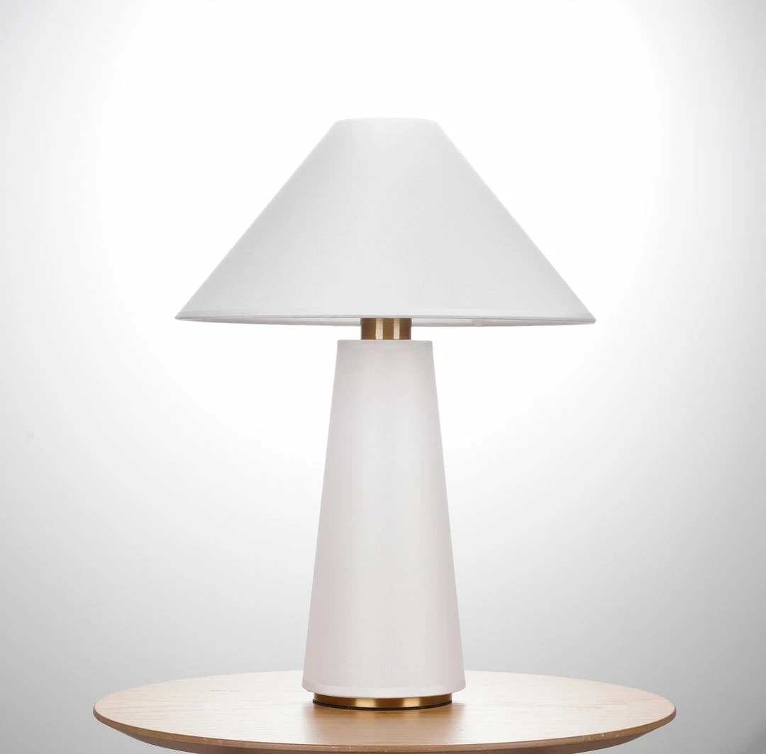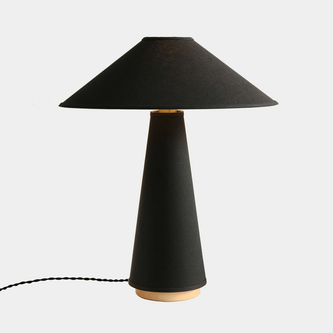 A contemporary table lamp with a linen shade and body, hardwood base, and brass details. The structural shape, distinct clean lines, and neutral tones are derived from classic mid-century modern design. Linen fabric gives a lustrous, glowing quality to create a serene atmosphere of ambient light. The understated look places emphasis on the high-quality materials.