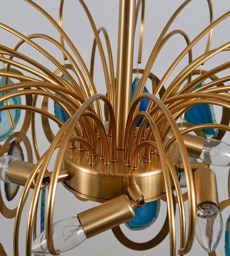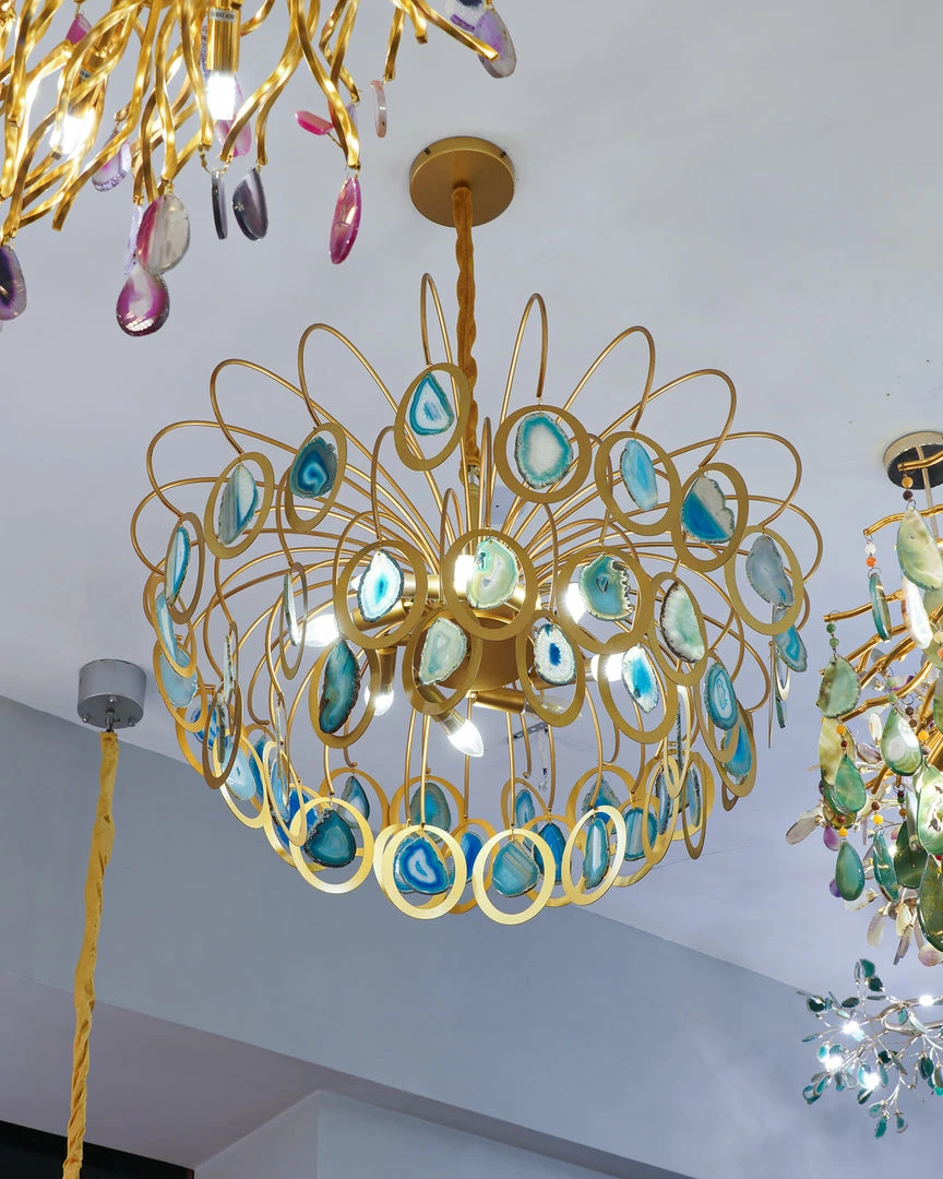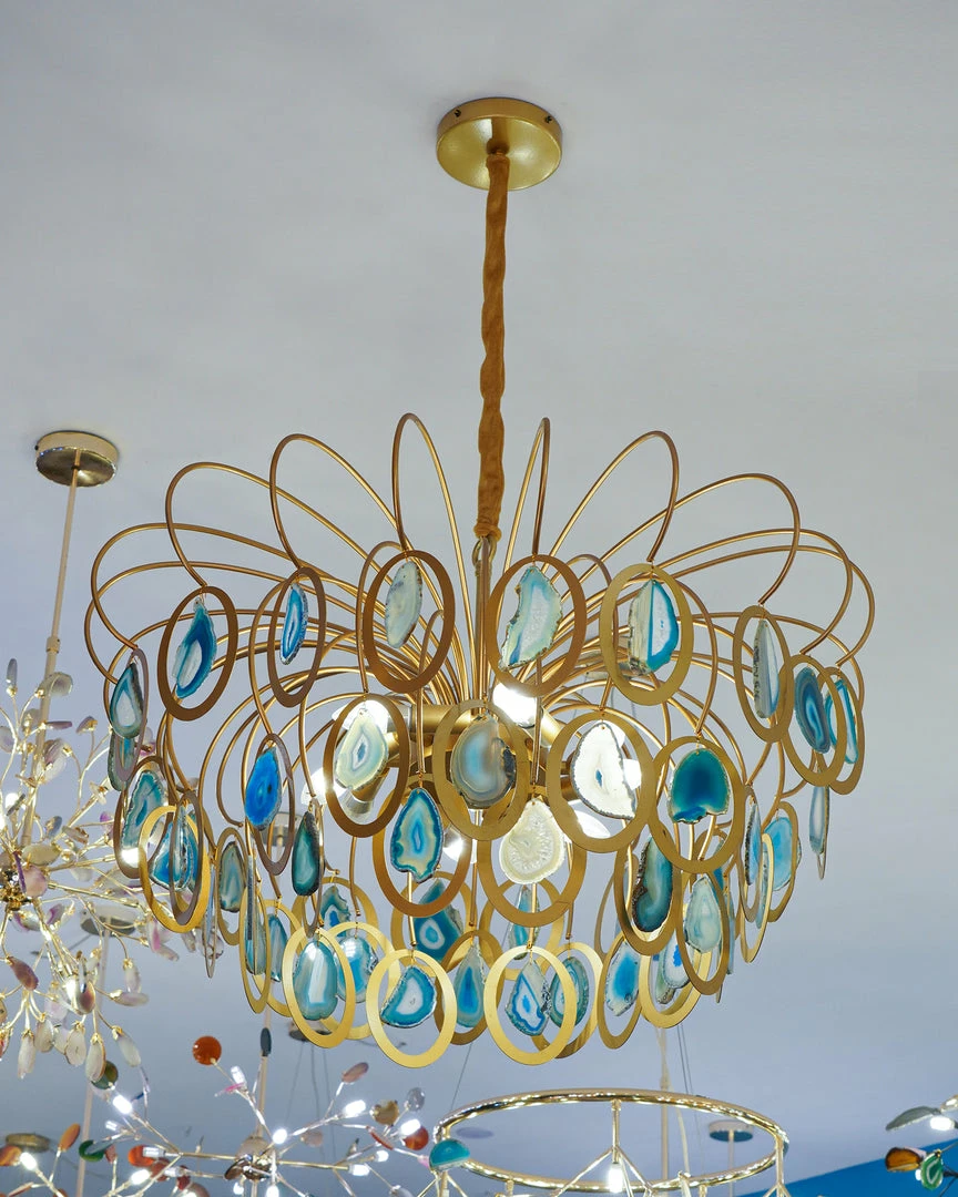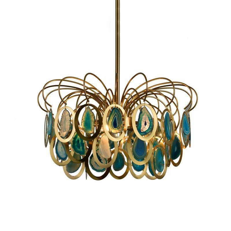This is a luxurious agate chandelier. The natural agate rough is sliced, polished, perforated, and made. The agate is brightly colored and has a smooth surface. It has a strong light transmission and no glare.