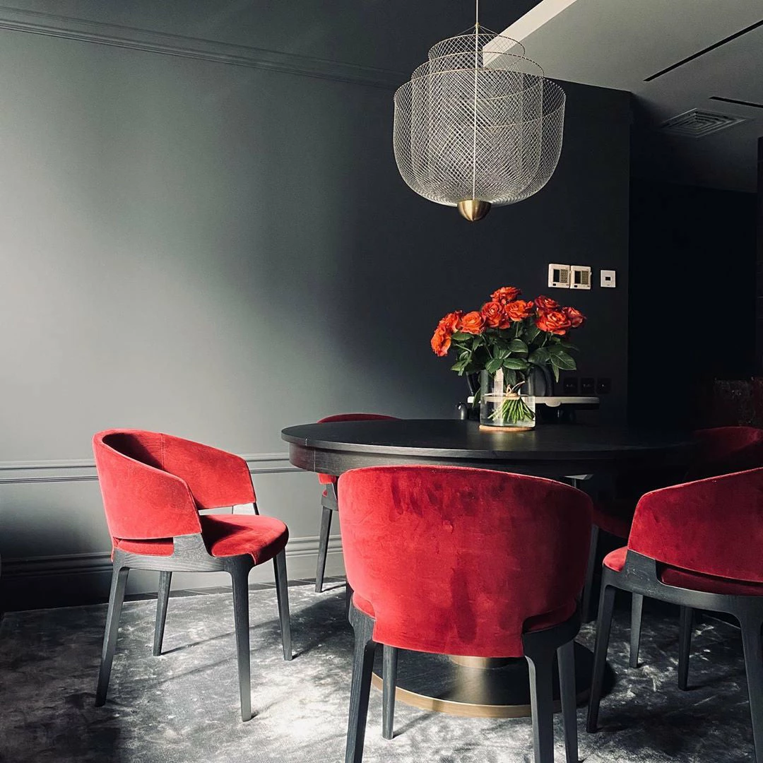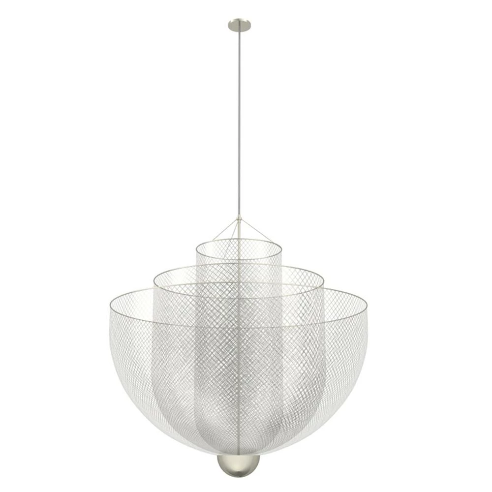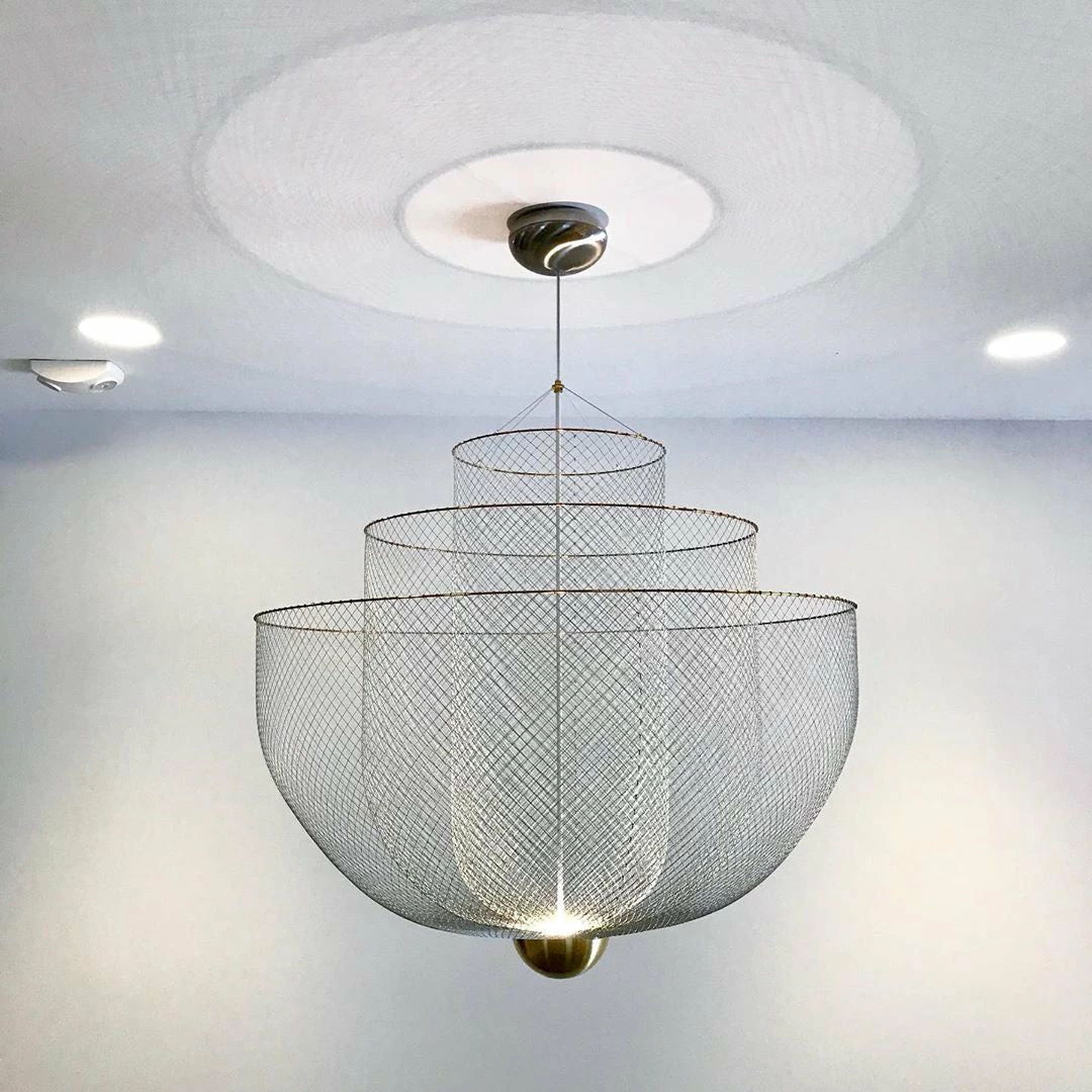 The surprising design, with the integrated LED light source that shines upwards, provides exceptional light and a play of shadows on the ceiling. The ingeniously layered steel frame shines gracefully through the LED light that with 2700 Kelvin gives a very warm white light (maximum 30 Watt). The chandelier-like lamp has a diameter of 60 centimeters and is 60 centimeters high. The transparent cable on which the lamp hangs has a maximum length of two meters.