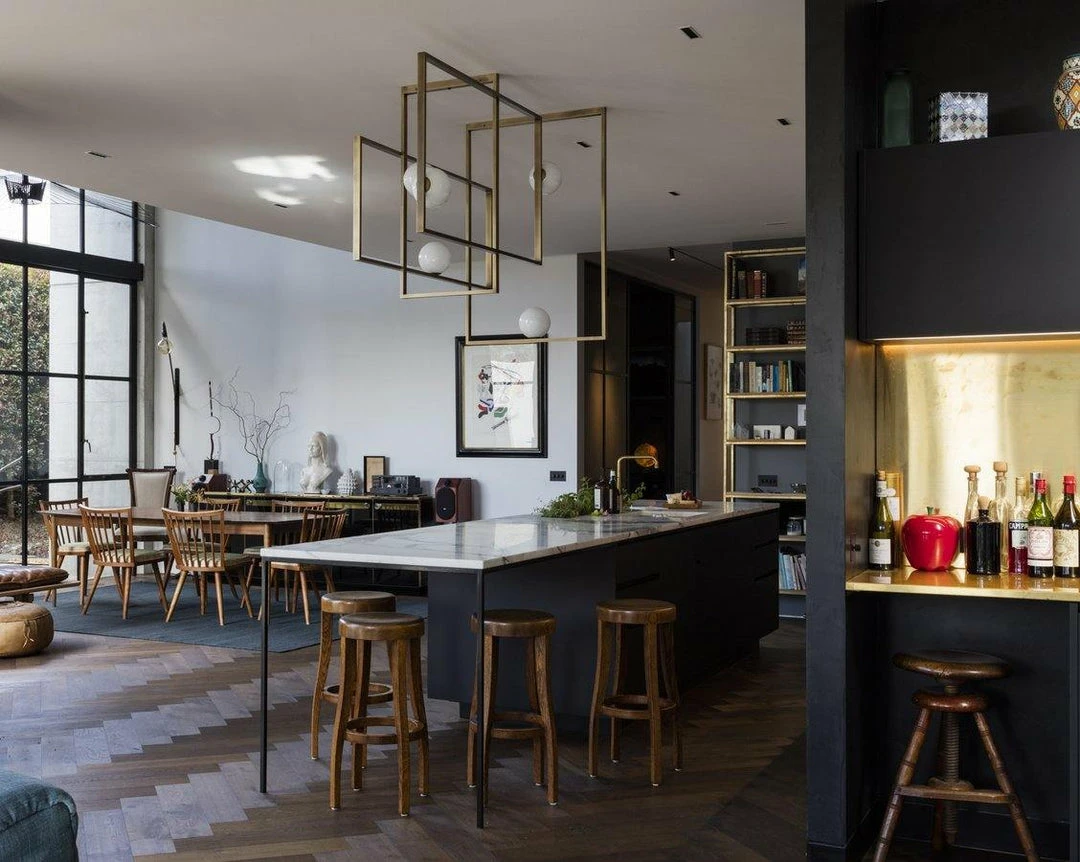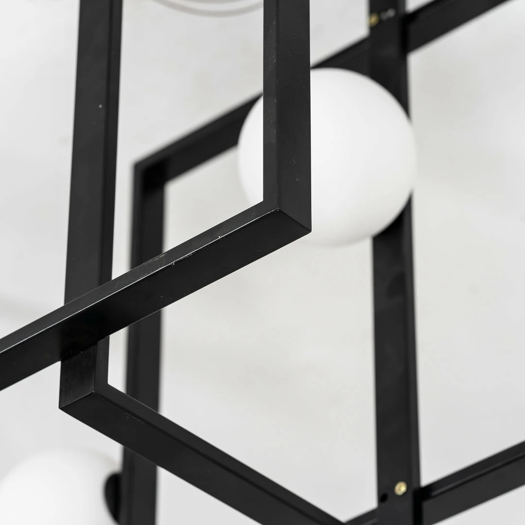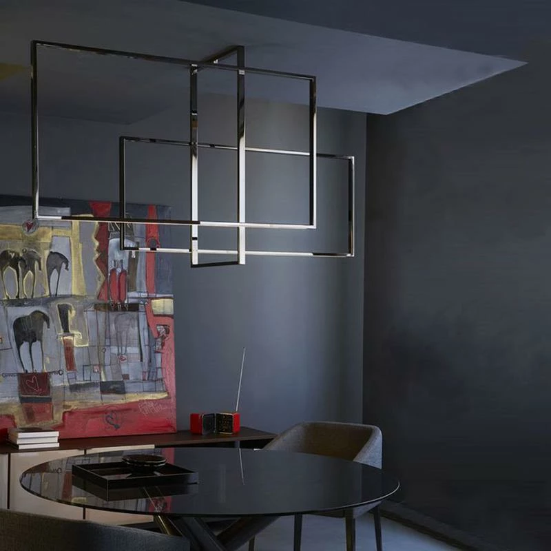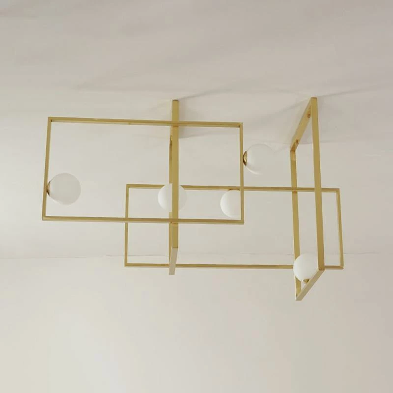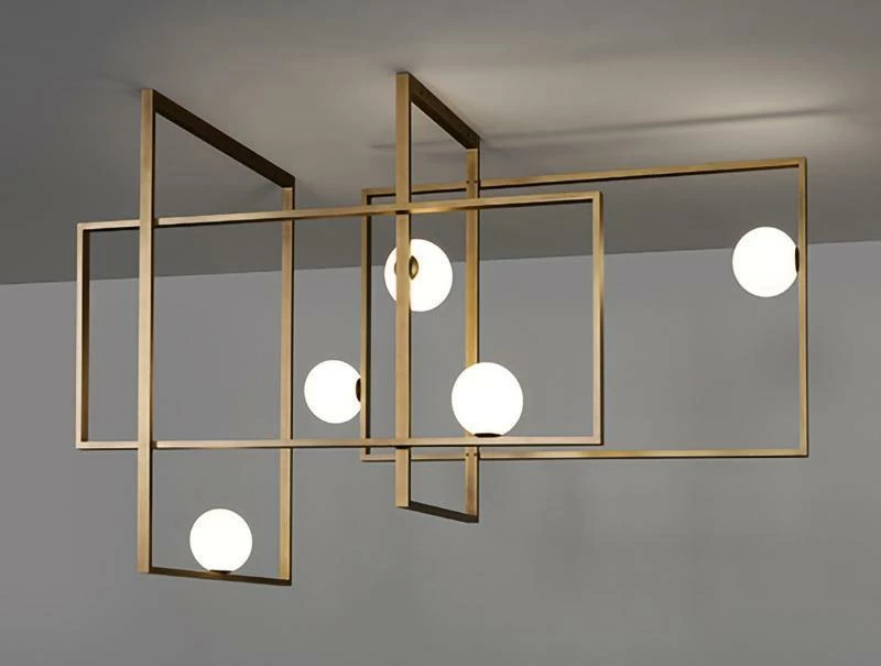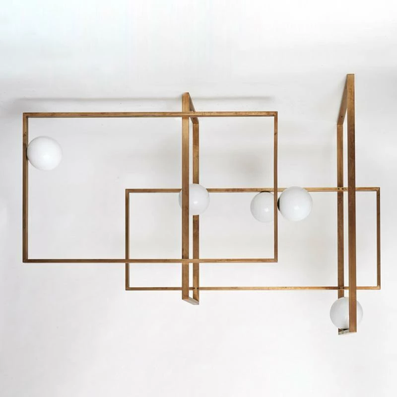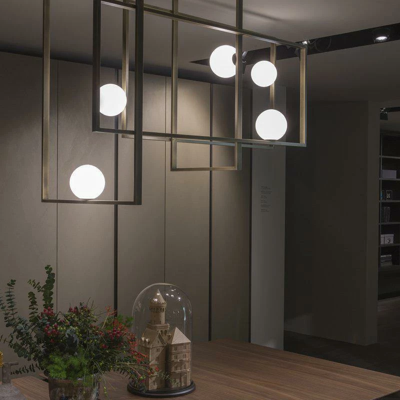 Mondrian Glass chandelier features five mouth-blown Murano glass spheres in white, amethyst, or smoke-grey and the metal structure comes in a variety of metallic finishes. For more purist Cubanists the LED version has its light source integrated into the frame so that the striking form is simplified.