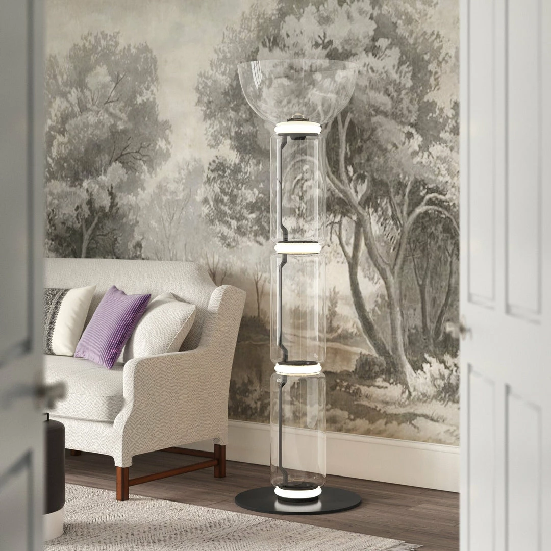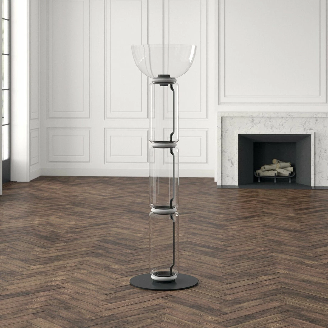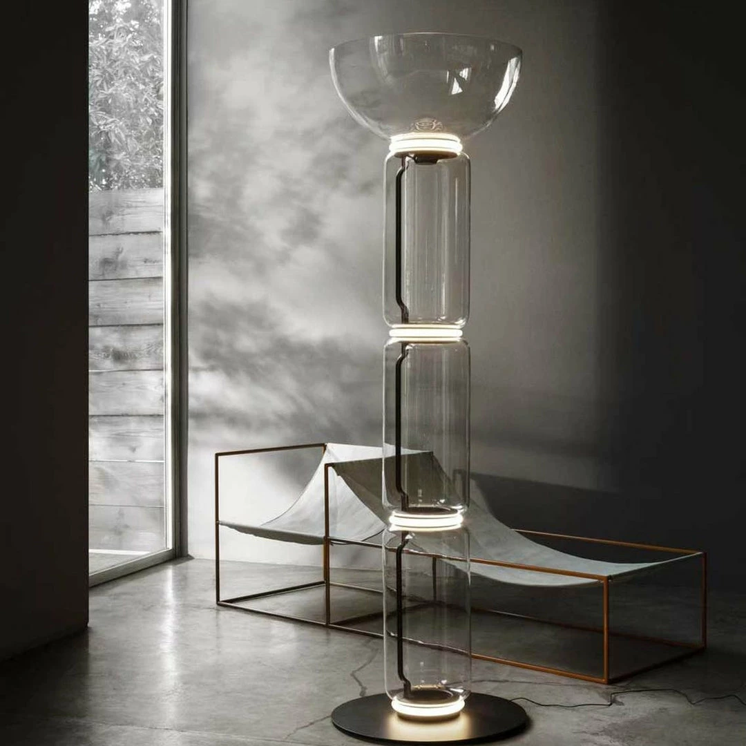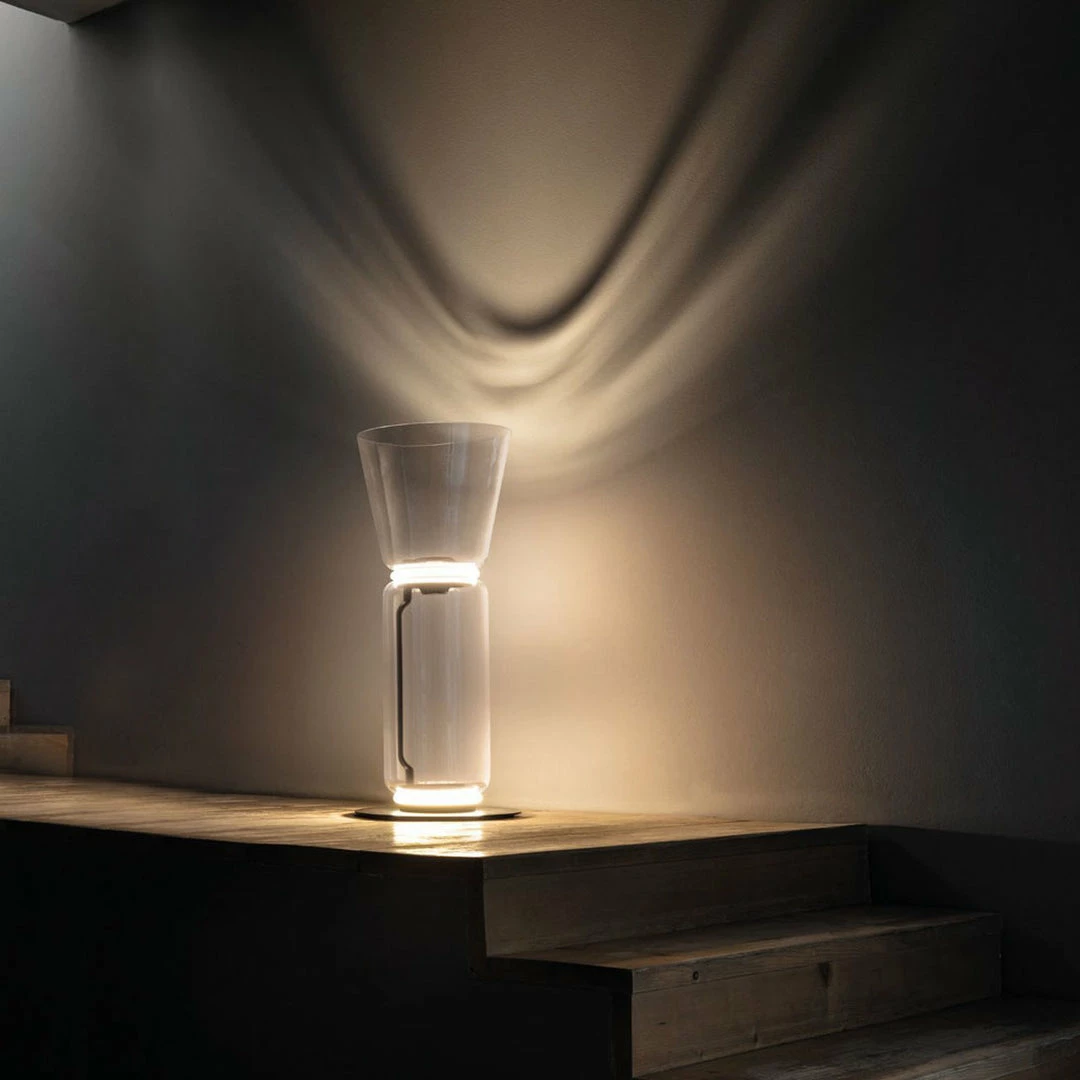 The brainchild of master designer Konstantin Grcic, Noctambule futuristic lighting system that blends innovation, efficiency, and aesthetics. Its transparent hand-blown glass cylinder is surrounded by discrete LED technology on top and at the bottom, thus making the foundation of the lamp stylish and stunning. The user can attach additional components to the fixture in order to experiment with different styles of lighting. This helps create columns of light at varying heights that light up at the intersecting points between each module or unit.