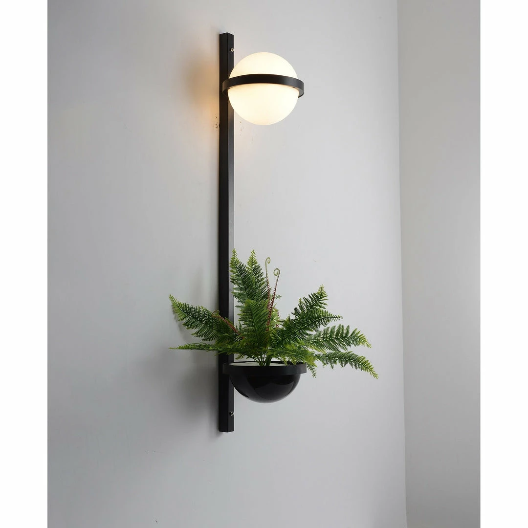 The design of Palma wall sconce has at its origin the beauty of hanging gardens. It introduces flora combined with indoor lighting, aimed at creating a sense of well-being, calm and cheerfulness into our daily environments. Essential, minimal shapes and materials combine the organic and the immateriality of light. Varying scales available with or without planters and blown glass spheres illuminated by LED.