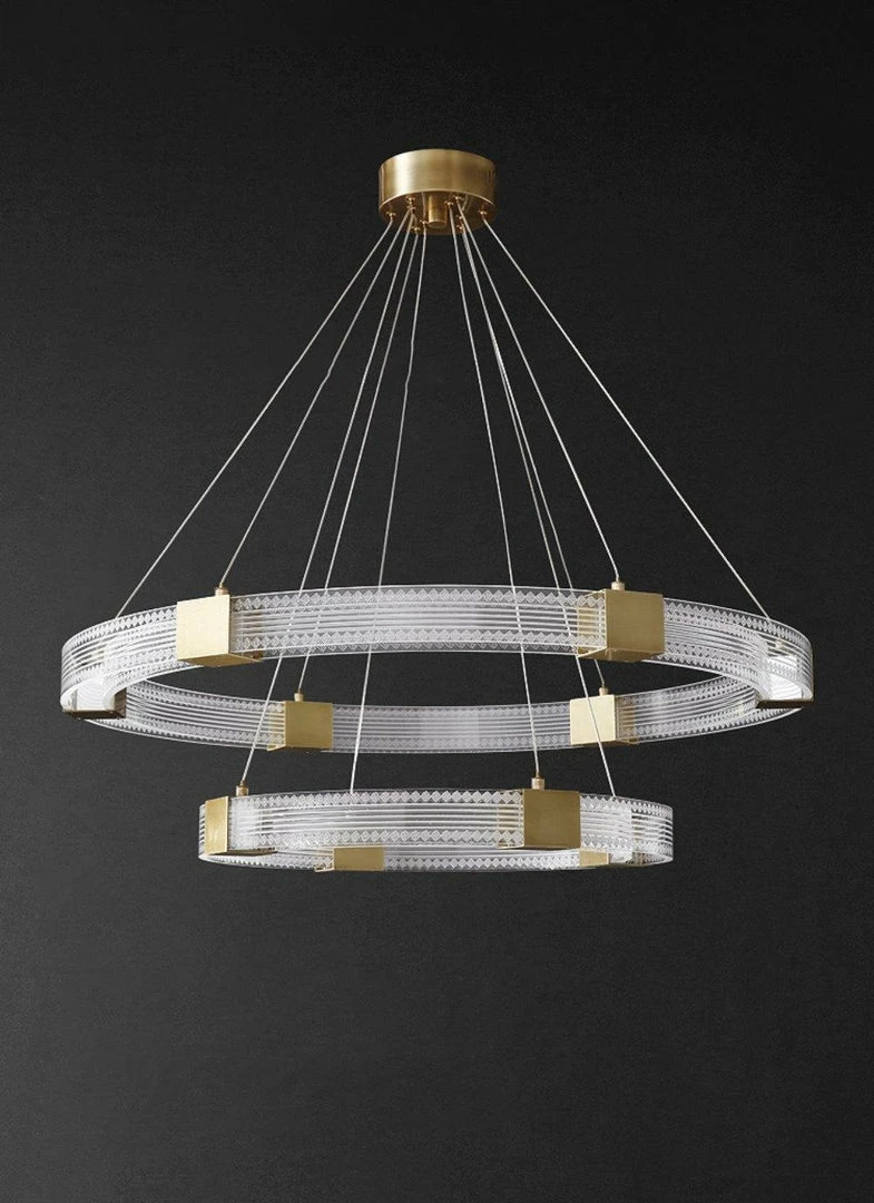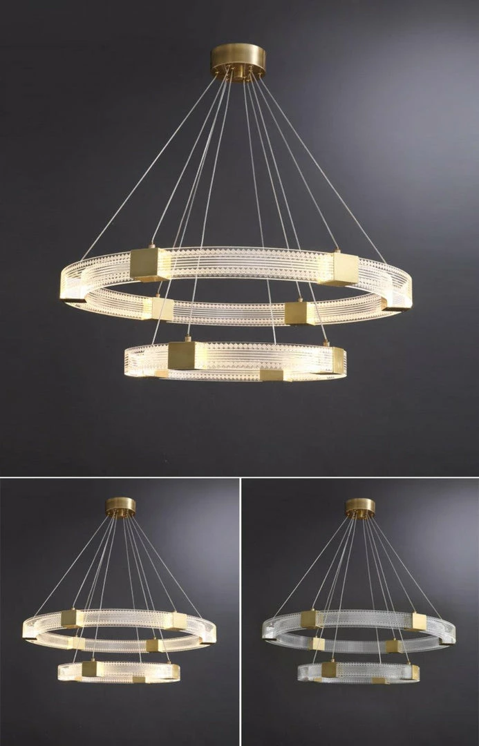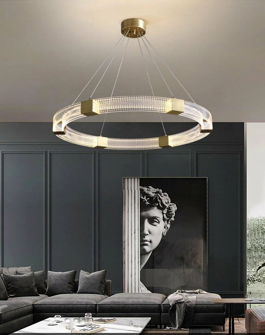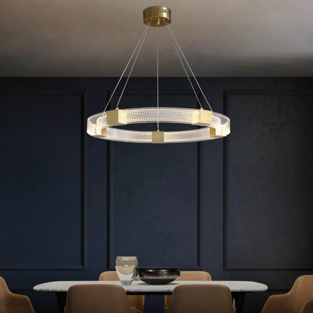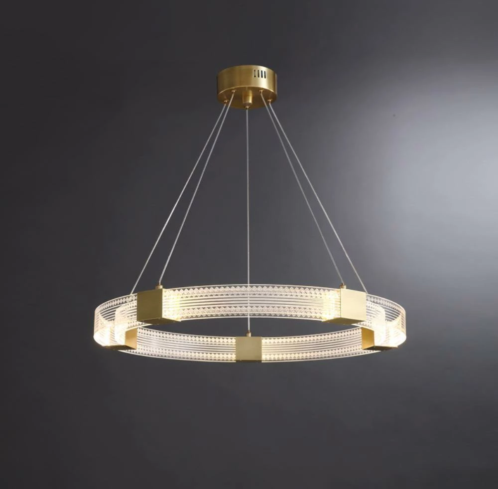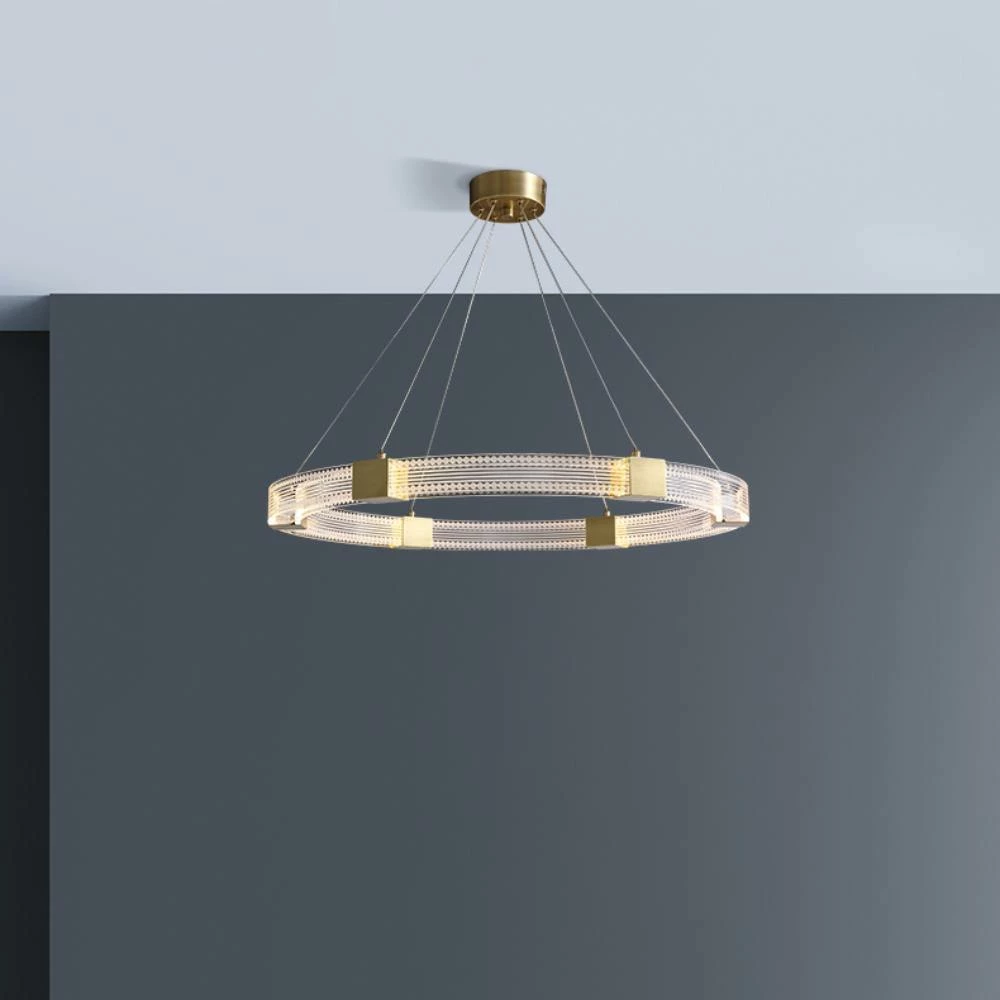 Artisanal luxury is paired with contemporary design in the Parallel Ring LED Chandelier. Its ringed silhouette consists of parallel handcrafted, textured acrylic panels that are joined by finished brass inserts. These brass inserts contain integrated LEDs that sit flush behind Frosted acrylic diffusers, pointed both down and sideways for a dazzling display once lit.