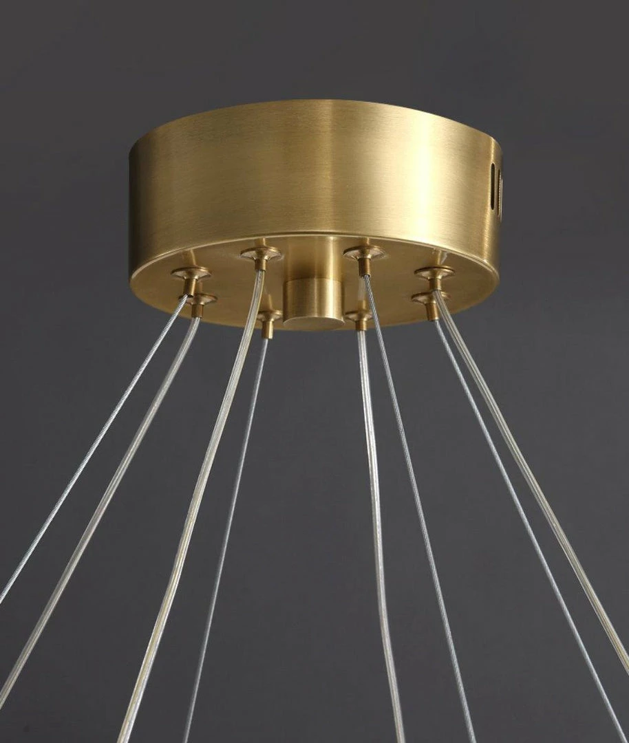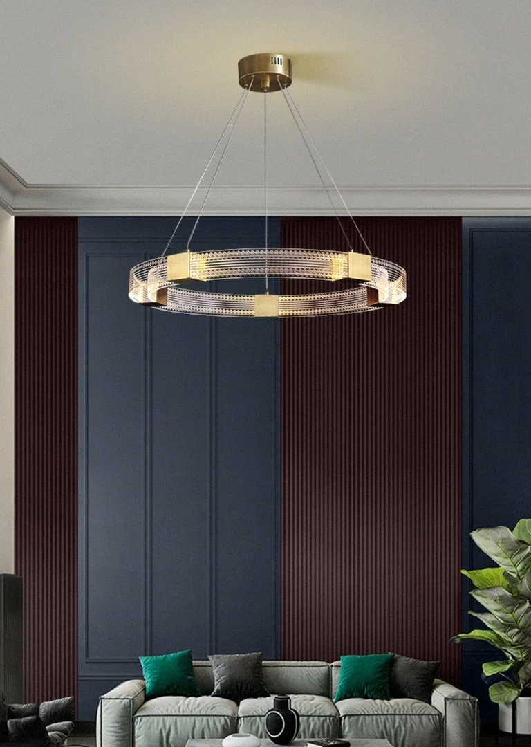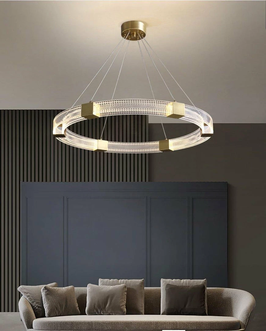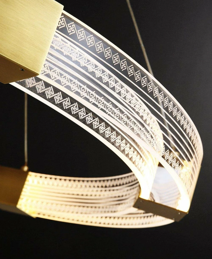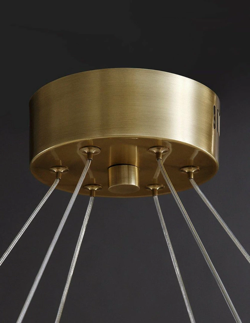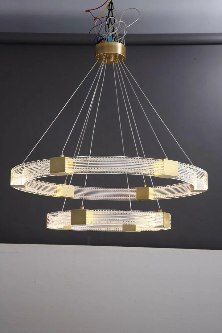 Artisanal luxury is paired with contemporary design in the Parallel Ring LED Chandelier. Its ringed silhouette consists of parallel handcrafted, textured acrylic panels that are joined by finished brass inserts. These brass inserts contain integrated LEDs that sit flush behind Frosted acrylic diffusers, pointed both down and sideways for a dazzling display once lit.