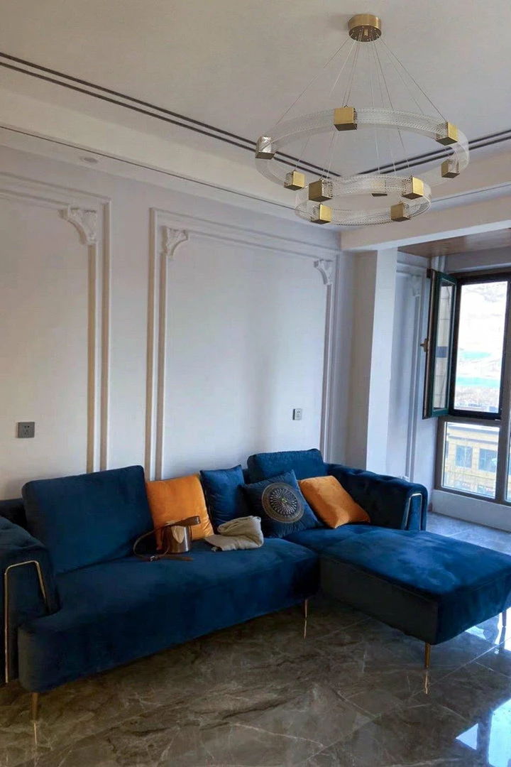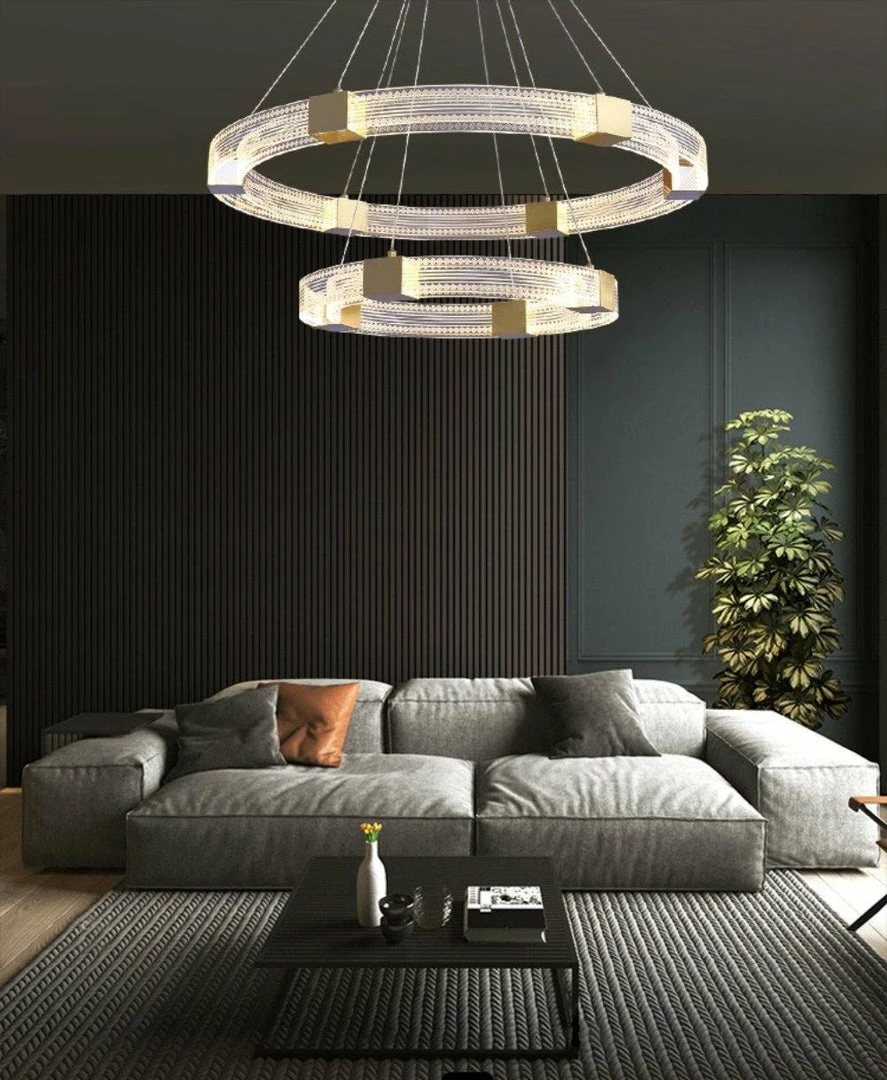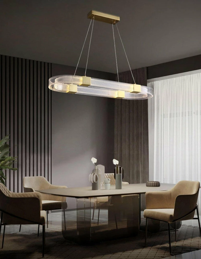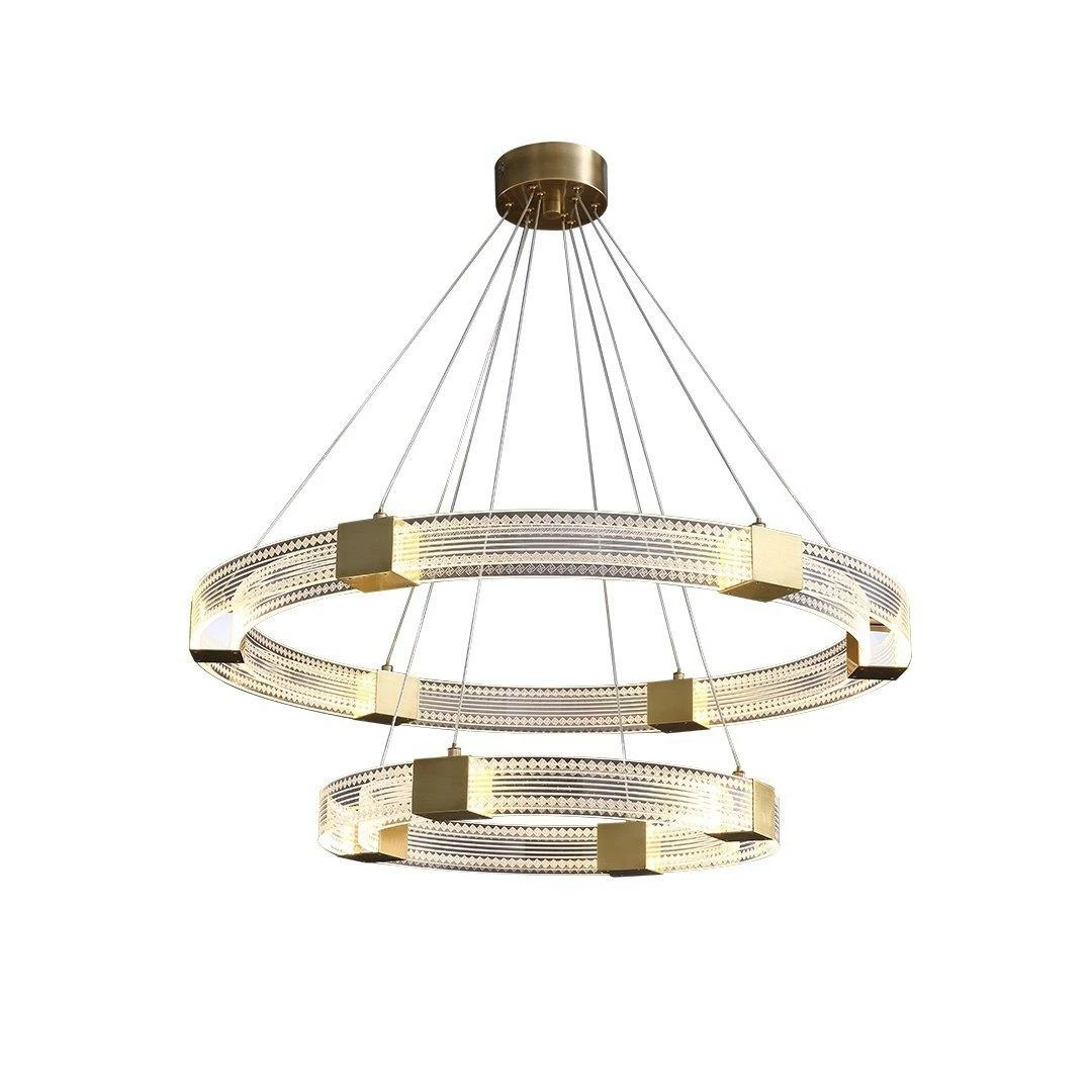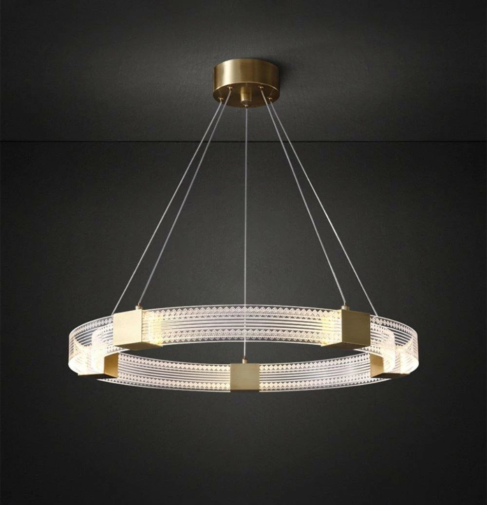 Artisanal luxury is paired with contemporary design in the Parallel Ring LED Chandelier. Its ringed silhouette consists of parallel handcrafted, textured acrylic panels that are joined by finished brass inserts. These brass inserts contain integrated LEDs that sit flush behind Frosted acrylic diffusers, pointed both down and sideways for a dazzling display once lit.