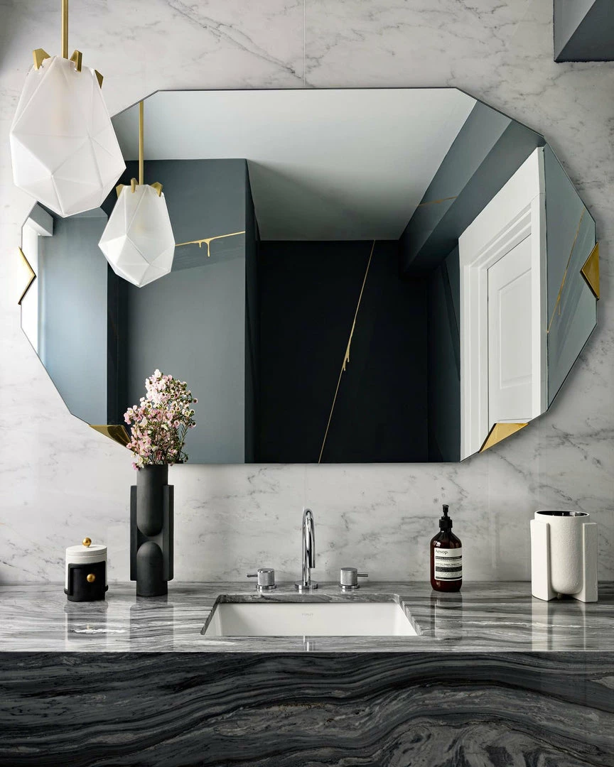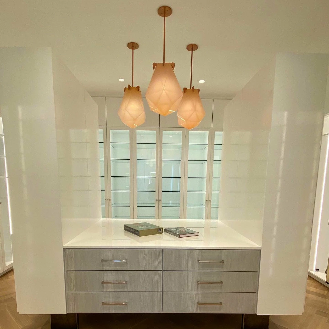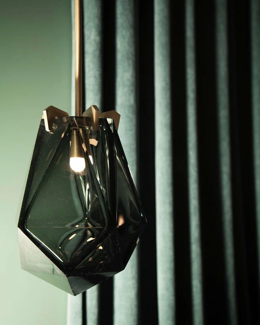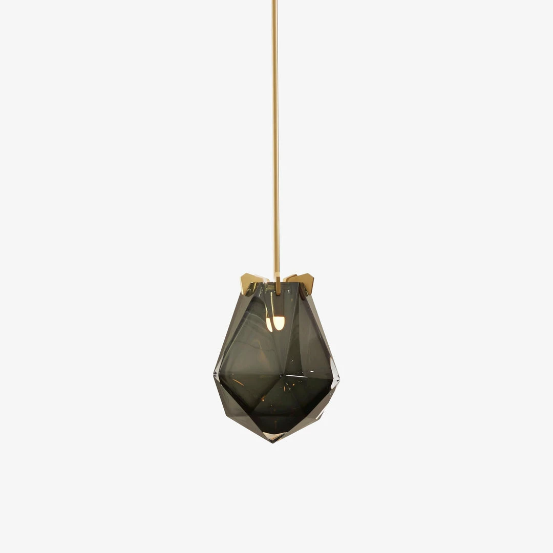 A dynamic interplay of sharp and delicate,glod hardware grips its jewel, drawing the eye to its unforgettable hand-sculpted shape. Double-blown glass is available in Cognac and smoke grey.