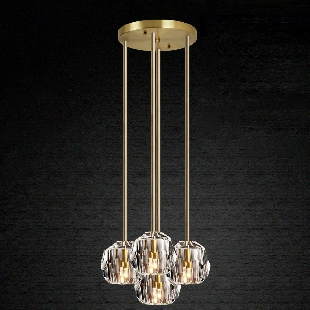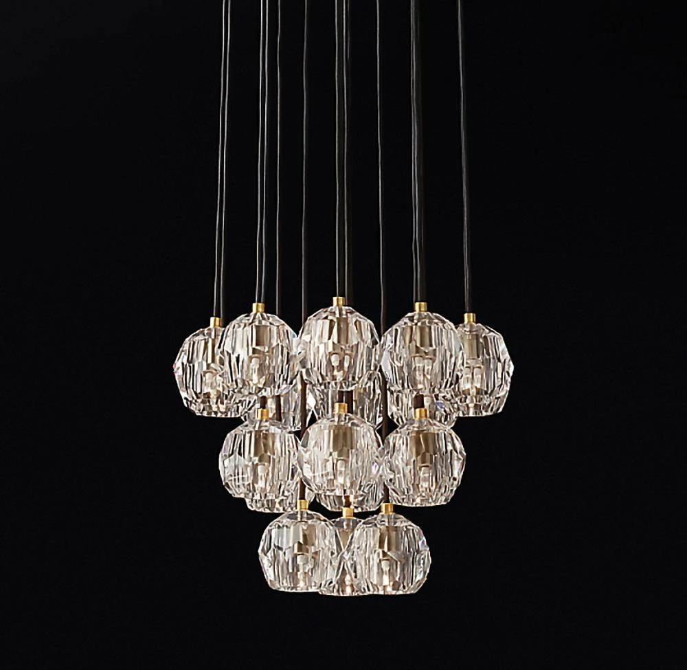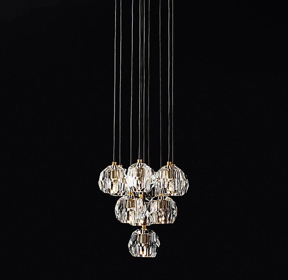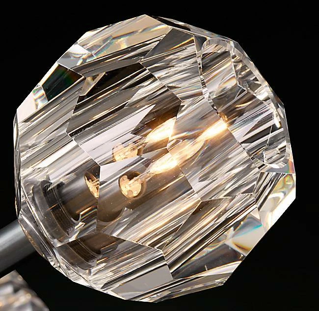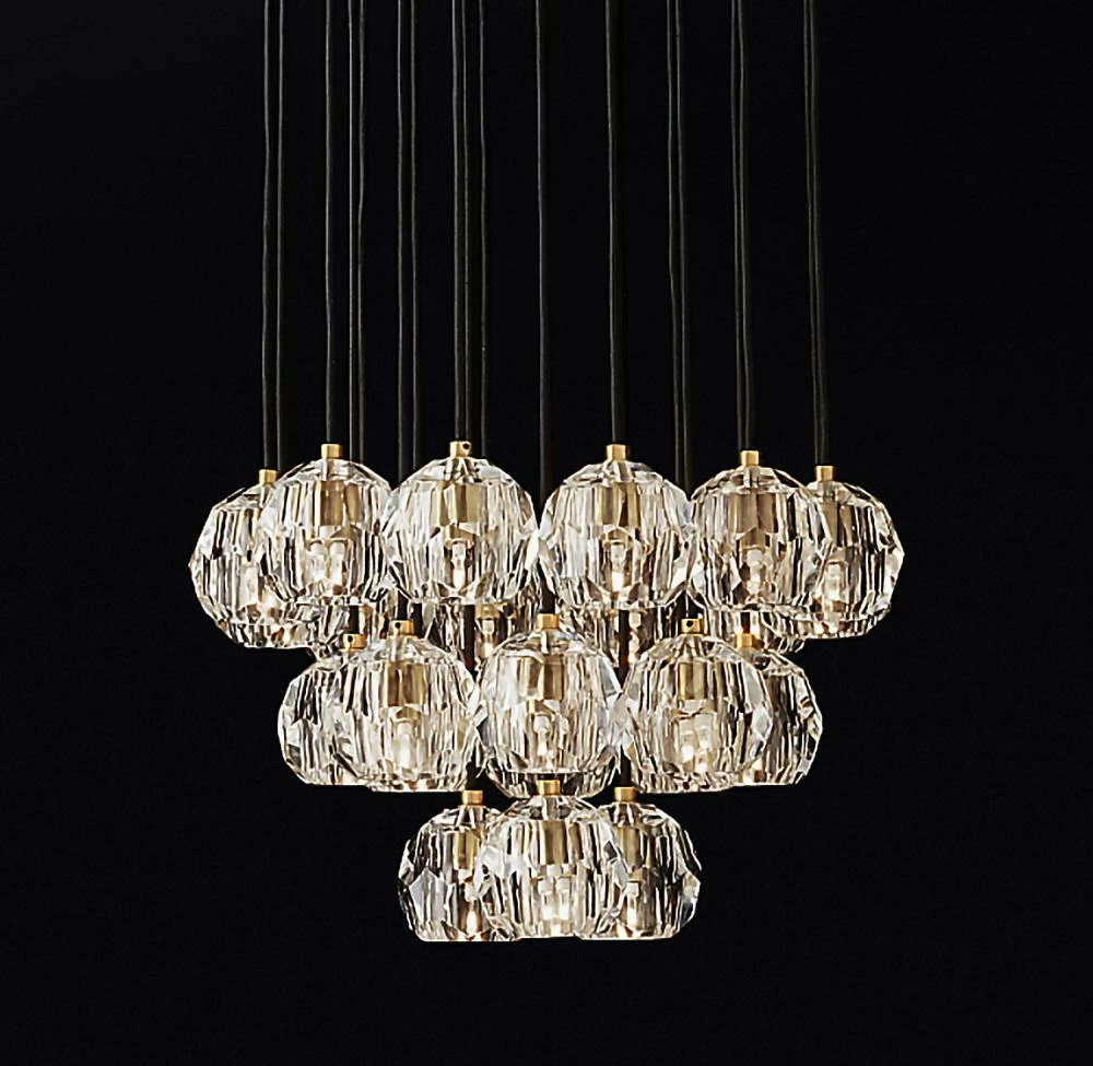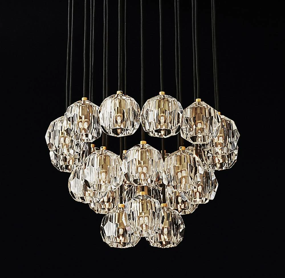 Crafted of solid brass and crystal glass, sculptural fixture is a testament to passion for luxe materials and superior craftsmanship. Evoking the minimalist spirit of the 1960s design, each finely faceted sphere is ground and polished by hand to reflect and refract the light.