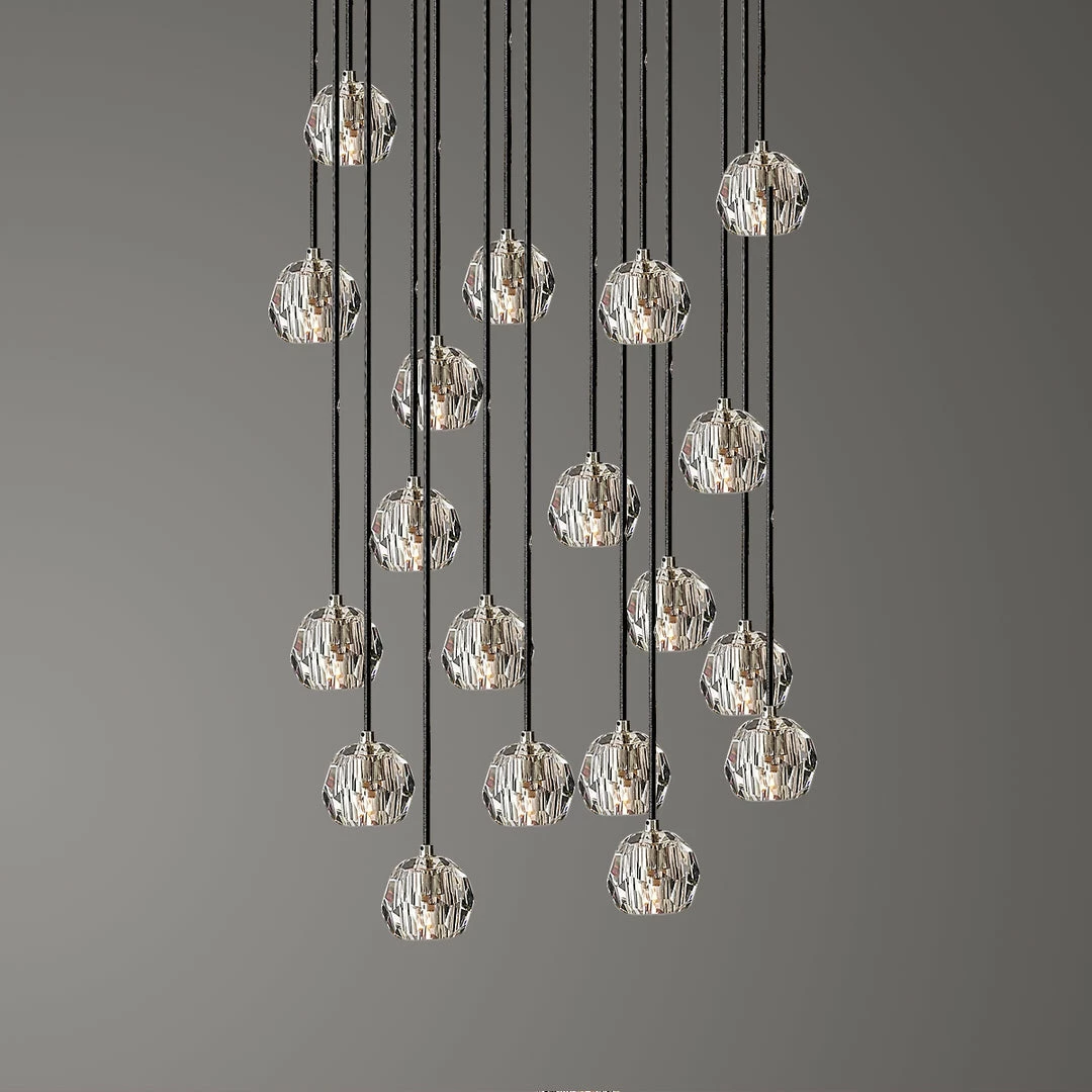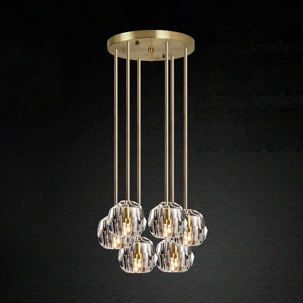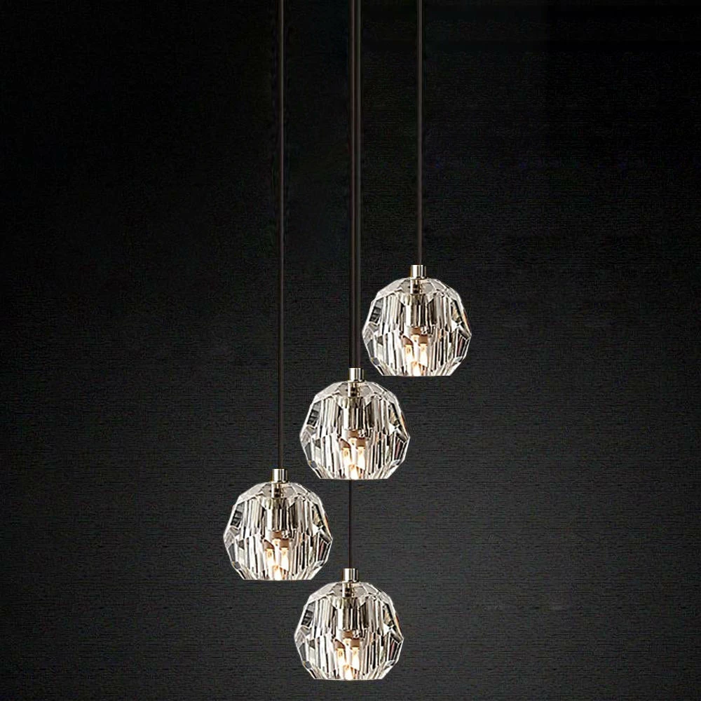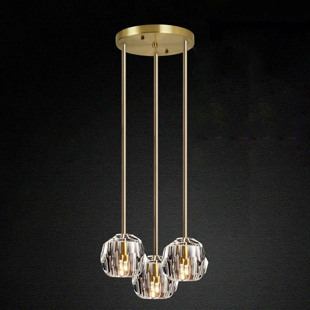 Crafted of solid brass and crystal glass, sculptural fixture is a testament to passion for luxe materials and superior craftsmanship. Evoking the minimalist spirit of the 1960s design, each finely faceted sphere is ground and polished by hand to reflect and refract the light.