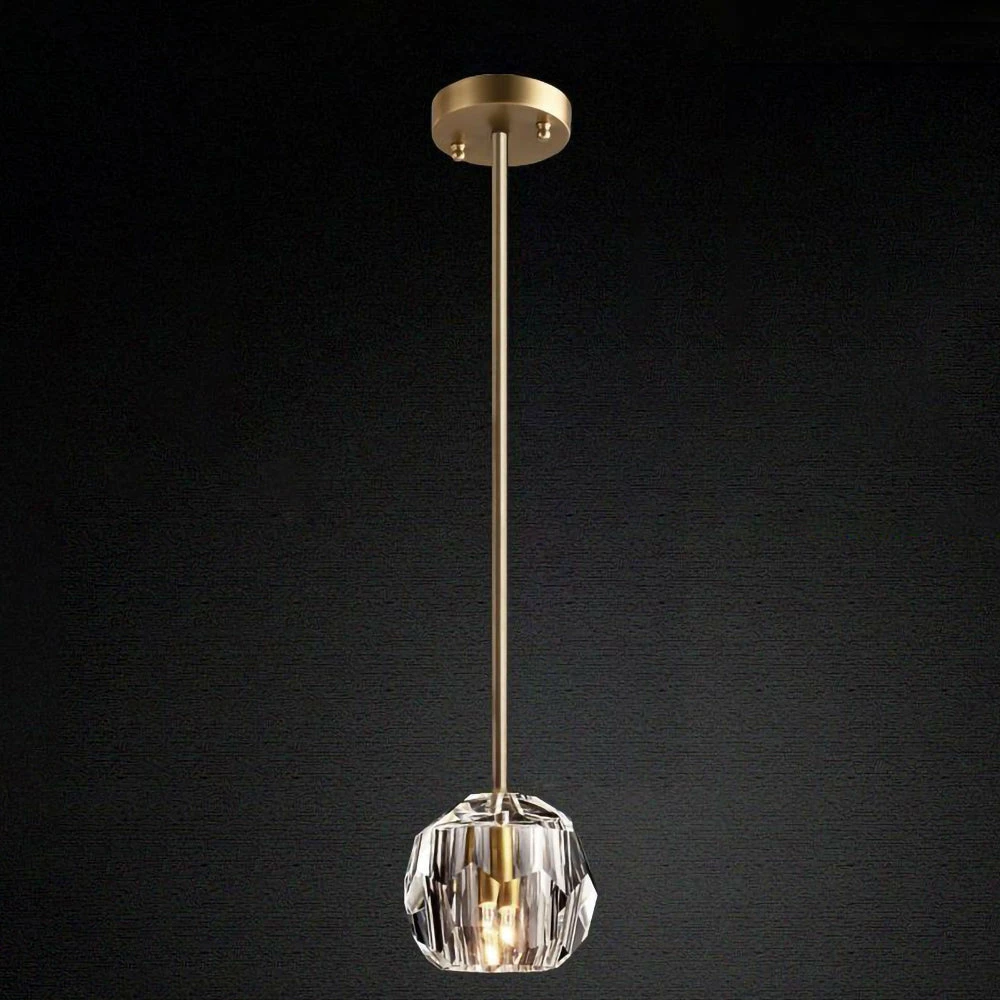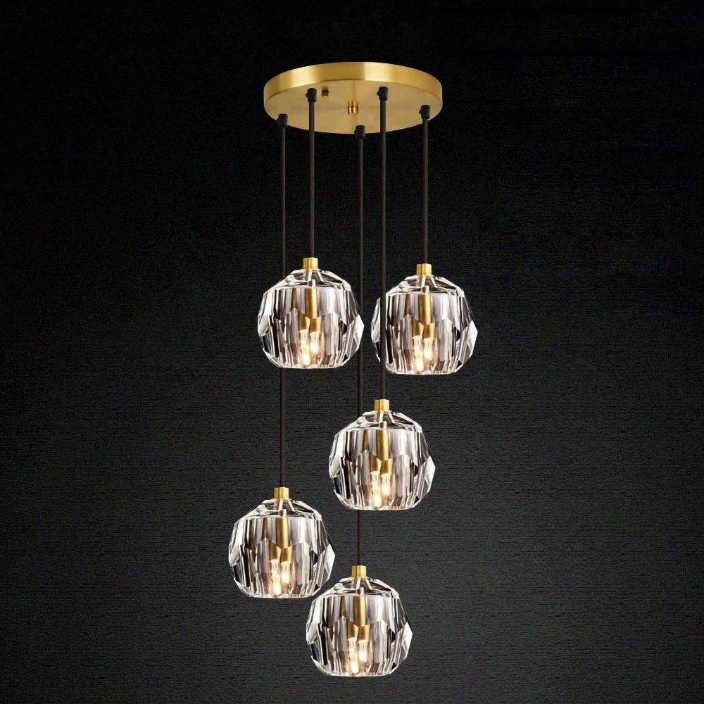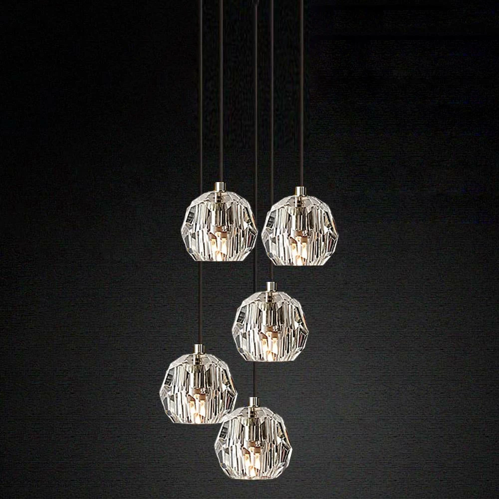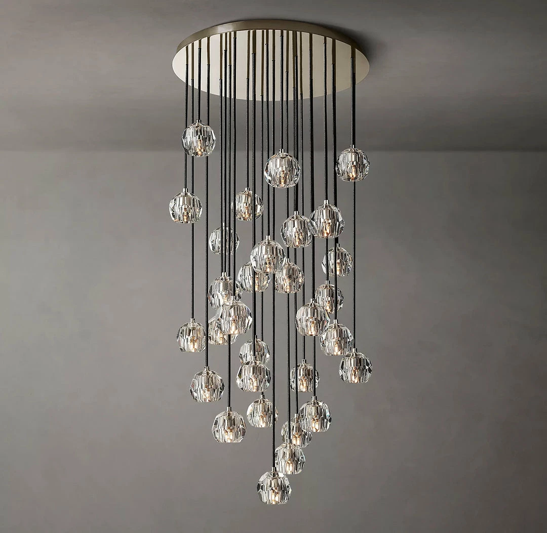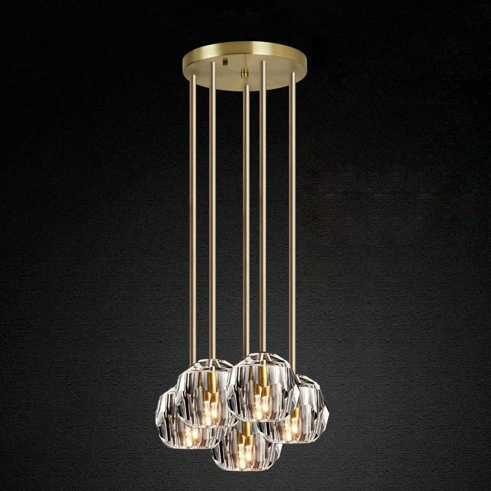 Crafted of solid brass and crystal glass, sculptural fixture is a testament to passion for luxe materials and superior craftsmanship. Evoking the minimalist spirit of the 1960s design, each finely faceted sphere is ground and polished by hand to reflect and refract the light.